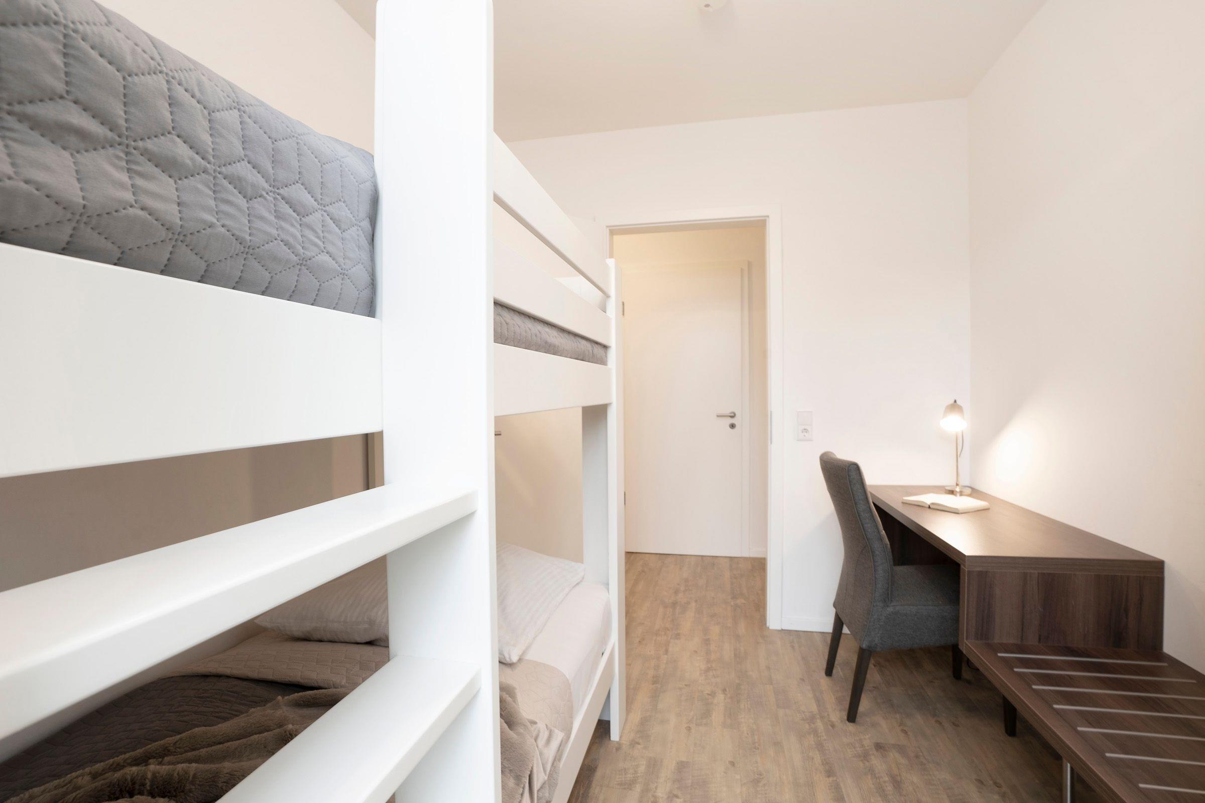 Schlafzimmer 2: 1 Etagenbett (je ca. 90x200 cm), Kleiderschrank, Verdunkelungsgardinen