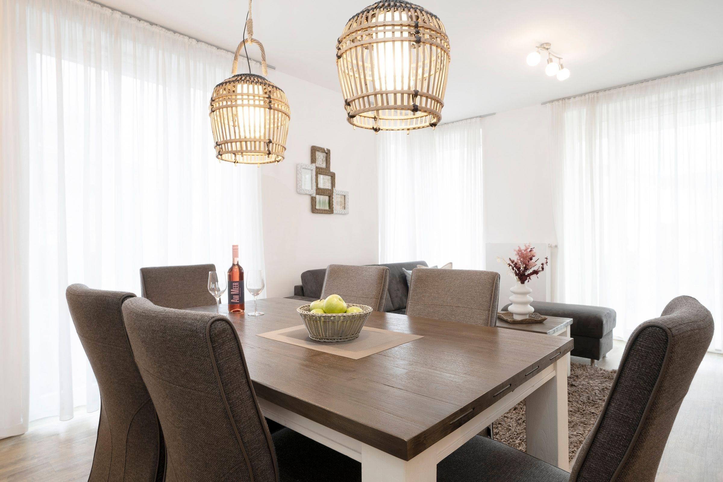 Hereinspaziert – es erwartet Sie ein geschmackvoll eingerichteter, lichtdurchfluteter Wohn-/Essbereich. Die schicke Couch verspricht gemütliche Stunden vor dem TV und die Essecke lädt zu gemeinsamen Spieleabenden oder guten Gesprächen bei einem Glas Wein ein. Von hier aus haben Sie Zutritt auf die möblierte sonnige Terrasse. Wie wäre es, hier den Tag mit einem leckeren Frühstück zu beginnen? Die gut ausgestattete Küche mit Spülmaschine ist offen gestaltet und bietet sämtlichen Komfort. Nach ruhigen Strandtagen oder auch spannenden Tagesausflügen finden Sie garantiert süße Träumen in den beiden Schlafzimmern: Eins ist mit einem Boxspring-Doppelbett (2x 90x200 cm) ausgestattet. In dem anderen Zimmer steht ein Etagenbett (je 90x200 cm). Auch das stylische Duschbad mit Handtuchwärmer bietet jede Menge Luxus. Eine Waschmaschine und ein Trockner runden dieses Angebot ab.