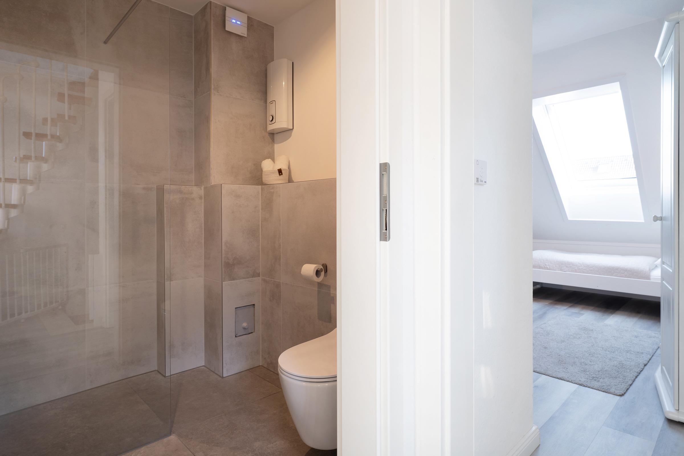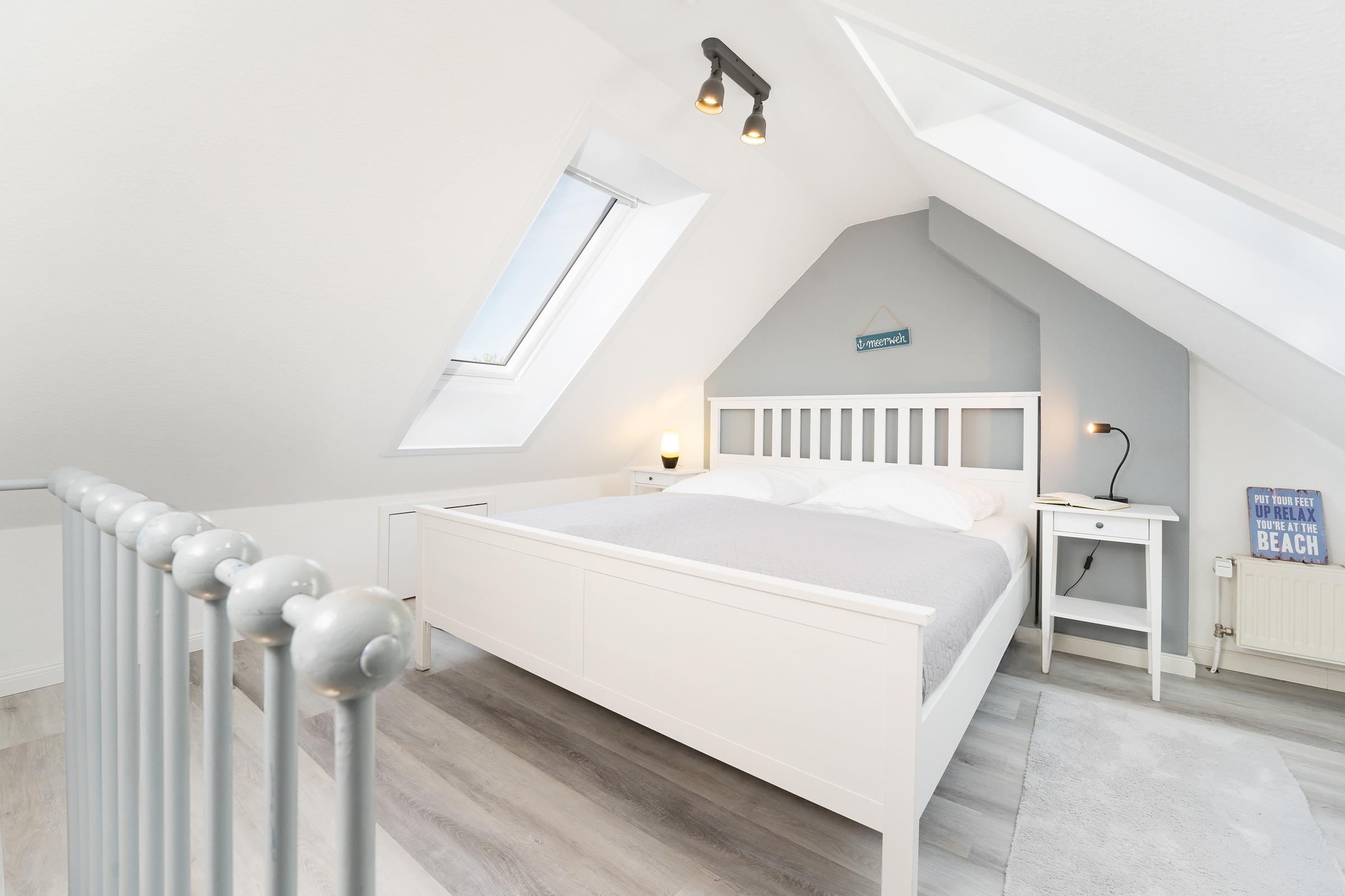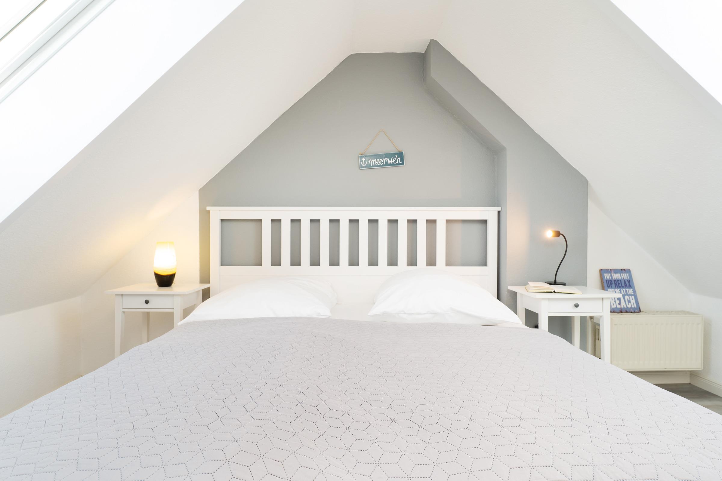Im Erdgeschoss befindet sich das Wohnzimmer mit einer gemütlichen Couch- und Essecke, einem Fernseher und direktem Zugang zur möblierten Terrasse. Die neue Küche vermittelt Strandhaus-Feeling pur und lässt keine Wünsche offen. Die Ausstattung umfasst u. a. einen Backofen, einen Geschirrspüler, eine Einbau-Mikrowelle sowie einen großen Kühlschrank mit Gefrierfach. Weiterhin bietet Ihnen das Erdgeschoss ein modernes Duschbad mit Waschmaschine. Im ersten Obergeschoss stehen Ihnen ein Schlafzimmer mit einem Doppelbett (2x 90x200 cm) und ein weiteres Schlafzimmer mit zwei Einzelbetten (je 90x200 cm) zur Verfügung. Auf dieser Etage ist ein weiteres Badezimmer mit Dusche vorhanden. Im Dachgeschoss, zu erreichen über eine Raumspartreppe, befindet sich ein zusätzliches, helles Schlafzimmer mit einem Doppelbett (2x 90x200 cm) und einer Kommode. Die Dachfenster verfügen über elektrische Außenrollläden. Der WLAN-Anschluss ist für Sie inklusive.