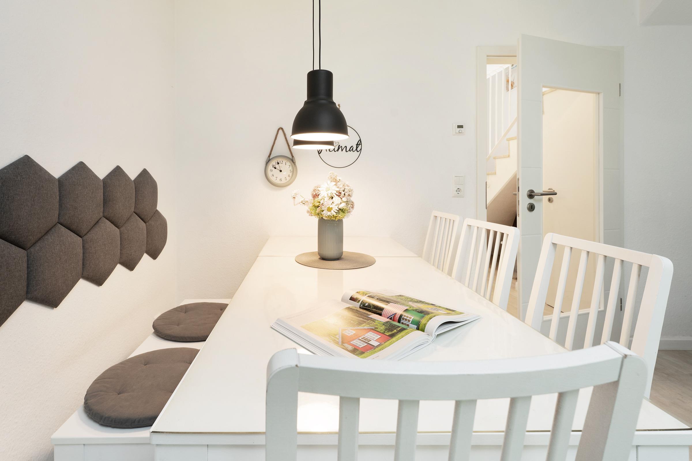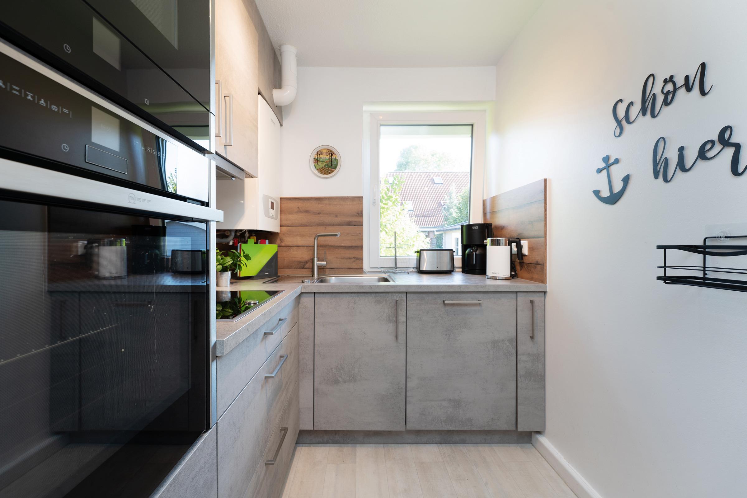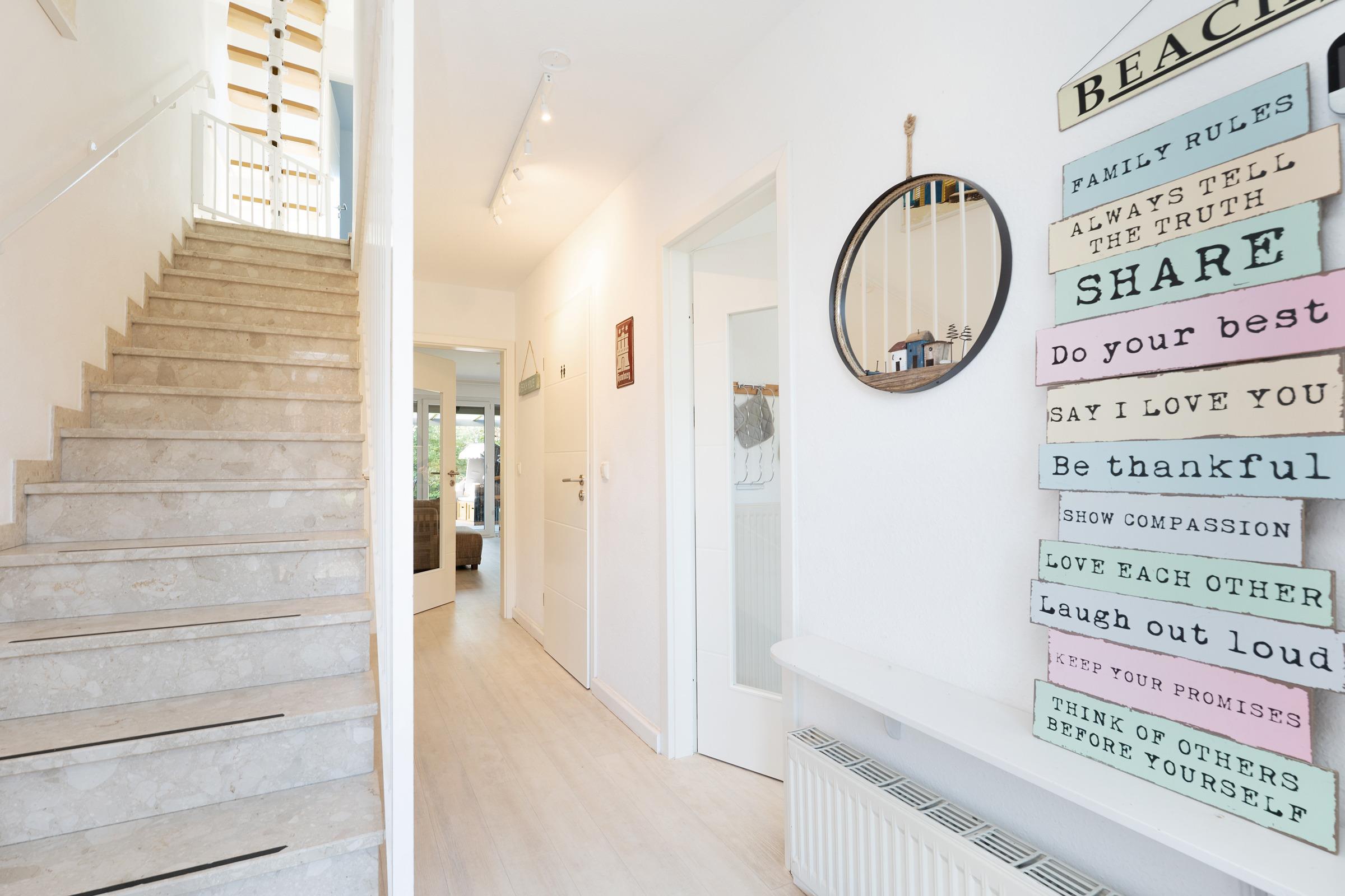 Im Erdgeschoss befindet sich das Wohnzimmer mit einer gemütlichen Couch- und Essecke, einem Fernseher und direktem Zugang zur möblierten Terrasse. Die neue Küche vermittelt Strandhaus-Feeling pur und lässt keine Wünsche offen. Die Ausstattung umfasst u. a. einen Backofen, einen Geschirrspüler, eine Einbau-Mikrowelle sowie einen großen Kühlschrank mit Gefrierfach. Weiterhin bietet Ihnen das Erdgeschoss ein modernes Duschbad mit Waschmaschine. Im ersten Obergeschoss stehen Ihnen ein Schlafzimmer mit einem Doppelbett (2x 90x200 cm) und ein weiteres Schlafzimmer mit zwei Einzelbetten (je 90x200 cm) zur Verfügung. Auf dieser Etage ist ein weiteres Badezimmer mit Dusche vorhanden. Im Dachgeschoss, zu erreichen über eine Raumspartreppe, befindet sich ein zusätzliches, helles Schlafzimmer mit einem Doppelbett (2x 90x200 cm) und einer Kommode. Die Dachfenster verfügen über elektrische Außenrollläden. Der WLAN-Anschluss ist für Sie inklusive.