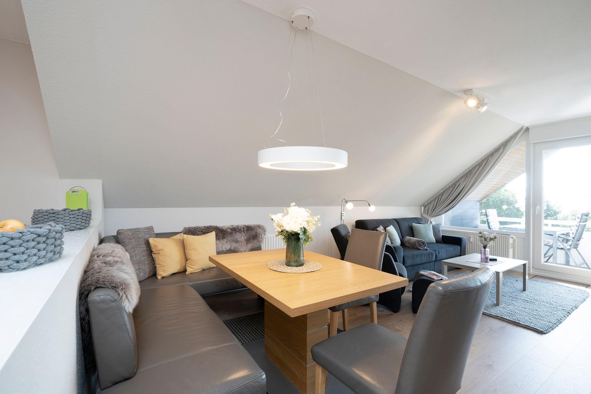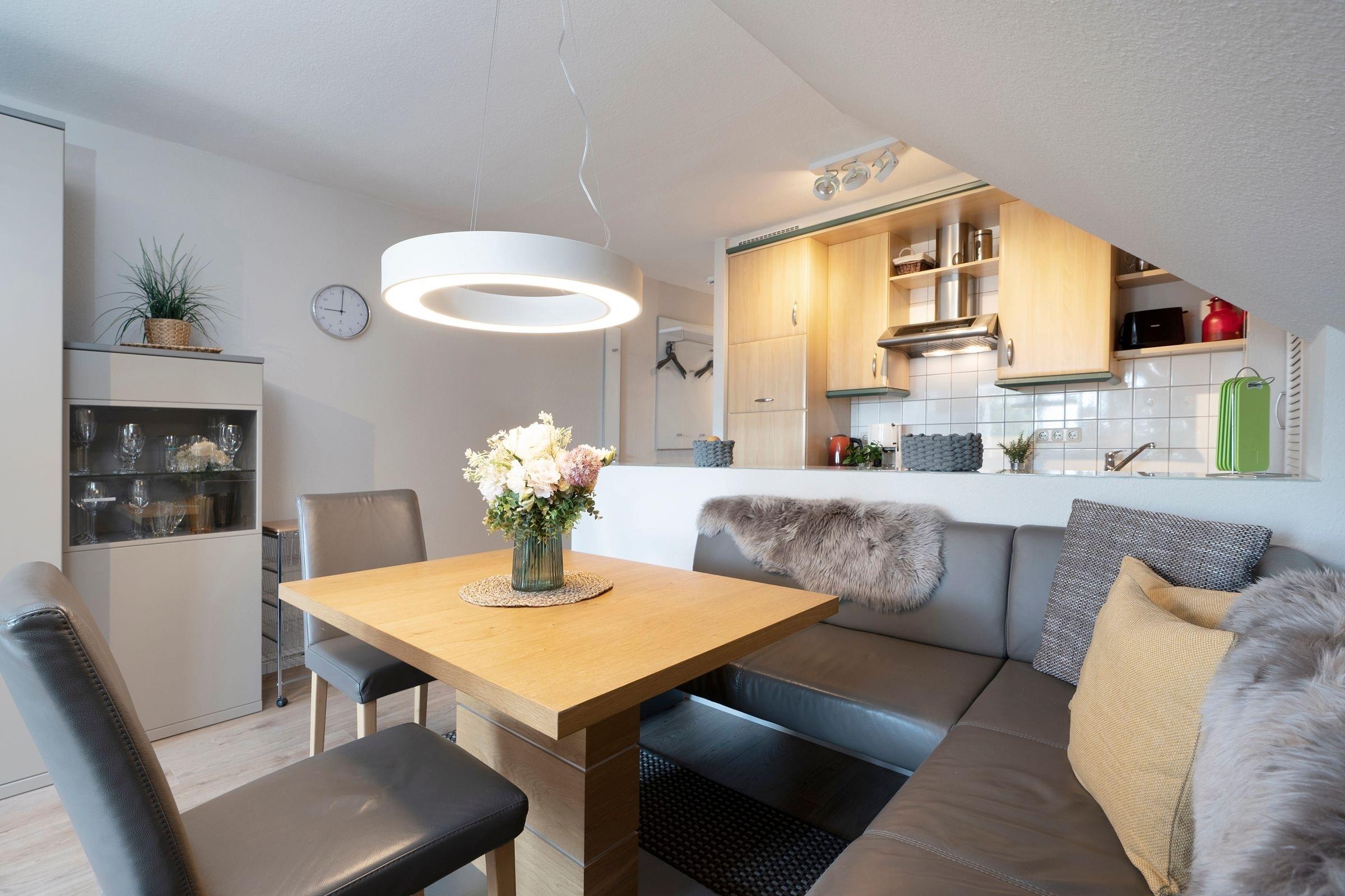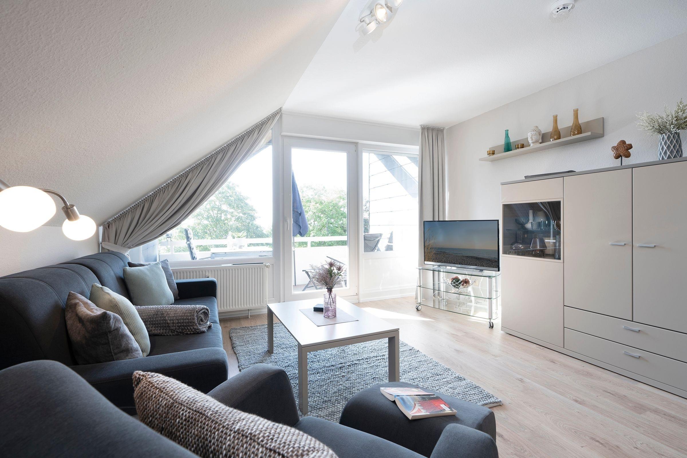 Ankommen, auspacken und sich wohlfühlen. Das können Sie in diesem schönen Feriendomizil in der Ferien-Wohnanlage Strandhotel – eine Anlage mit direktem Zugang zum Strand. Das helle, freundliche Wohnzimmer empfängt Sie mit einer gemütlichen TV-Ecke. Nehmen Sie Platz in dem bequemen Sessel oder auf der kuscheligen Couch, die sich bei Bedarf zum Bett (ca. 2x 80x200 cm) umfunktionieren lässt und als Ausweichschlafplatz gedacht ist. Bei schönem Wetter lockt natürlich der großzügige, möblierte Balkon mit saisonal eingeschränktem Ostsee-Fernblick. Lassen Sie hier Ihre Seele baumeln und genießen Sie Ihre freie Zeit. Gemütlich sitzen können Sie natürlich auch in der Ess-Ecke im Wohnbereich. Ihre Lieblings-Menüs zaubern Sie in der gut ausgestatteten Küche, eine Spülmaschine übernimmt danach Ihren Abwasch. Wunderbar träumen werden Sie garantiert in dem komfortablen Boxspringbett (180x200 cm) im Schlafzimmer. Das Besondere: Auch hier haben Sie einen Balkon mit demselben Weitblick. Einfach herrlich, mit so einer schönen Ausschau aufzuwachen. Das Duschbad ist zweckmäßig eingerichtet.