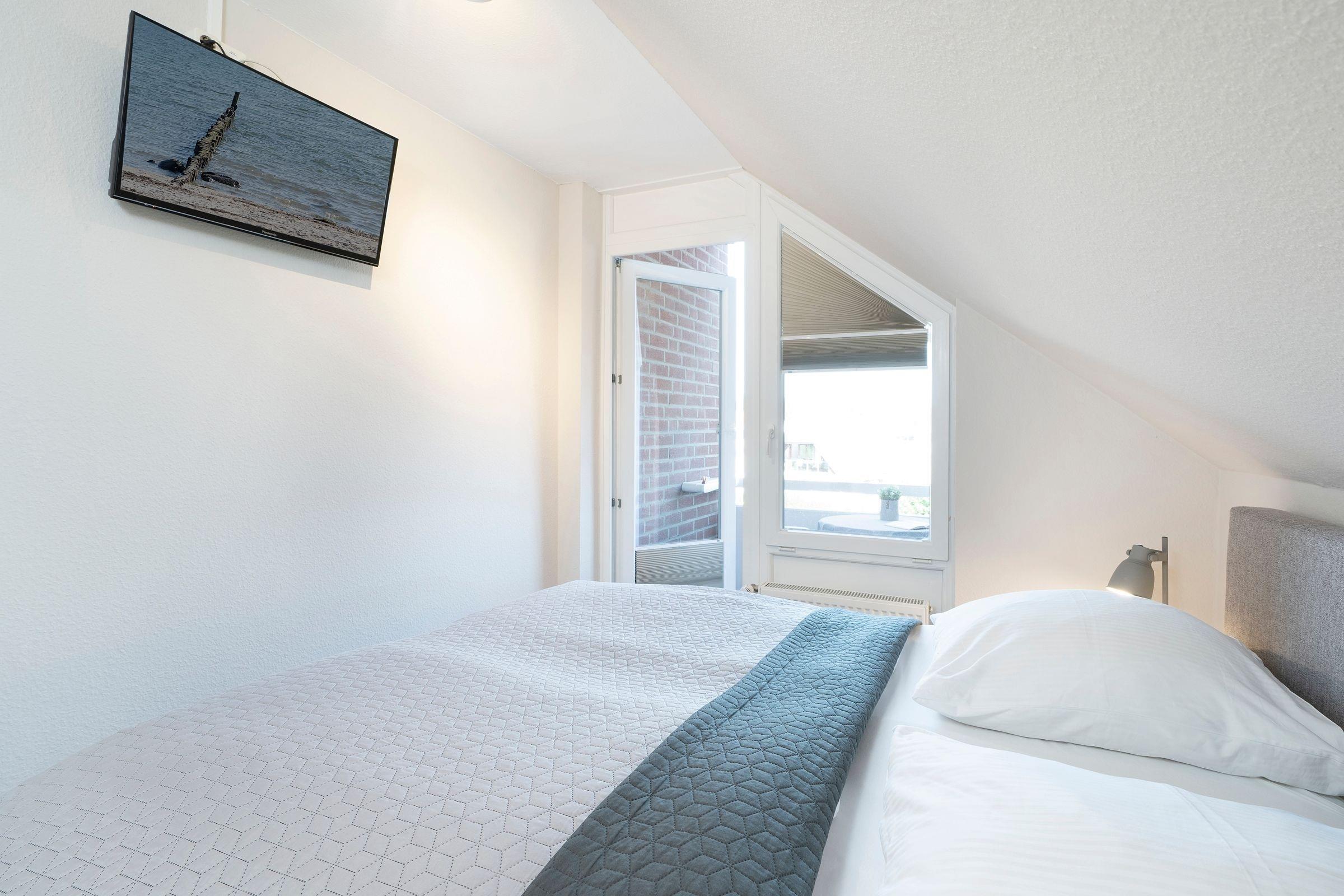 Schlafzimmer: 1 Boxspringbett (180x200 cm, durchgehender Topper), TV, Kleiderschrank, eigener Balkon