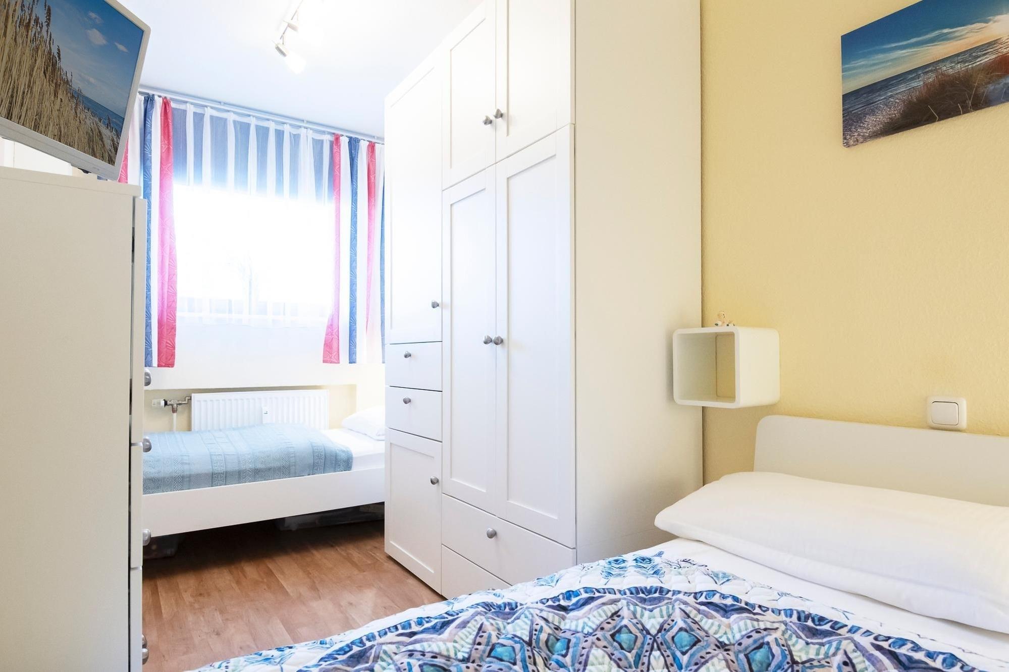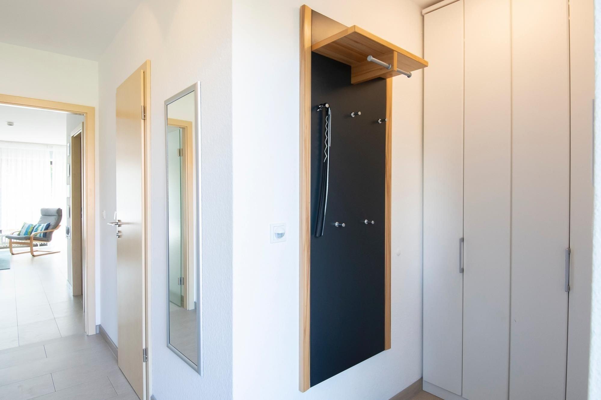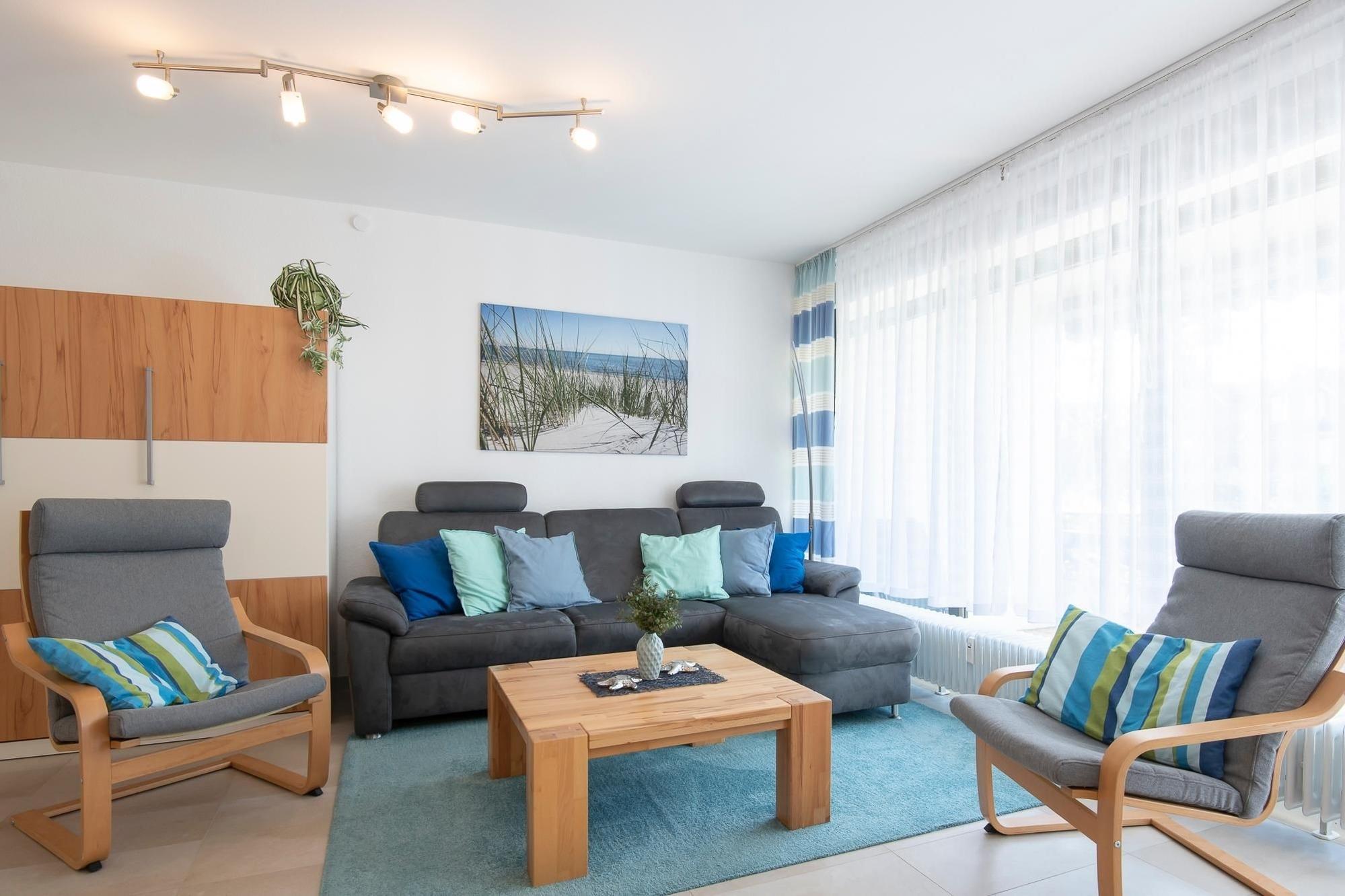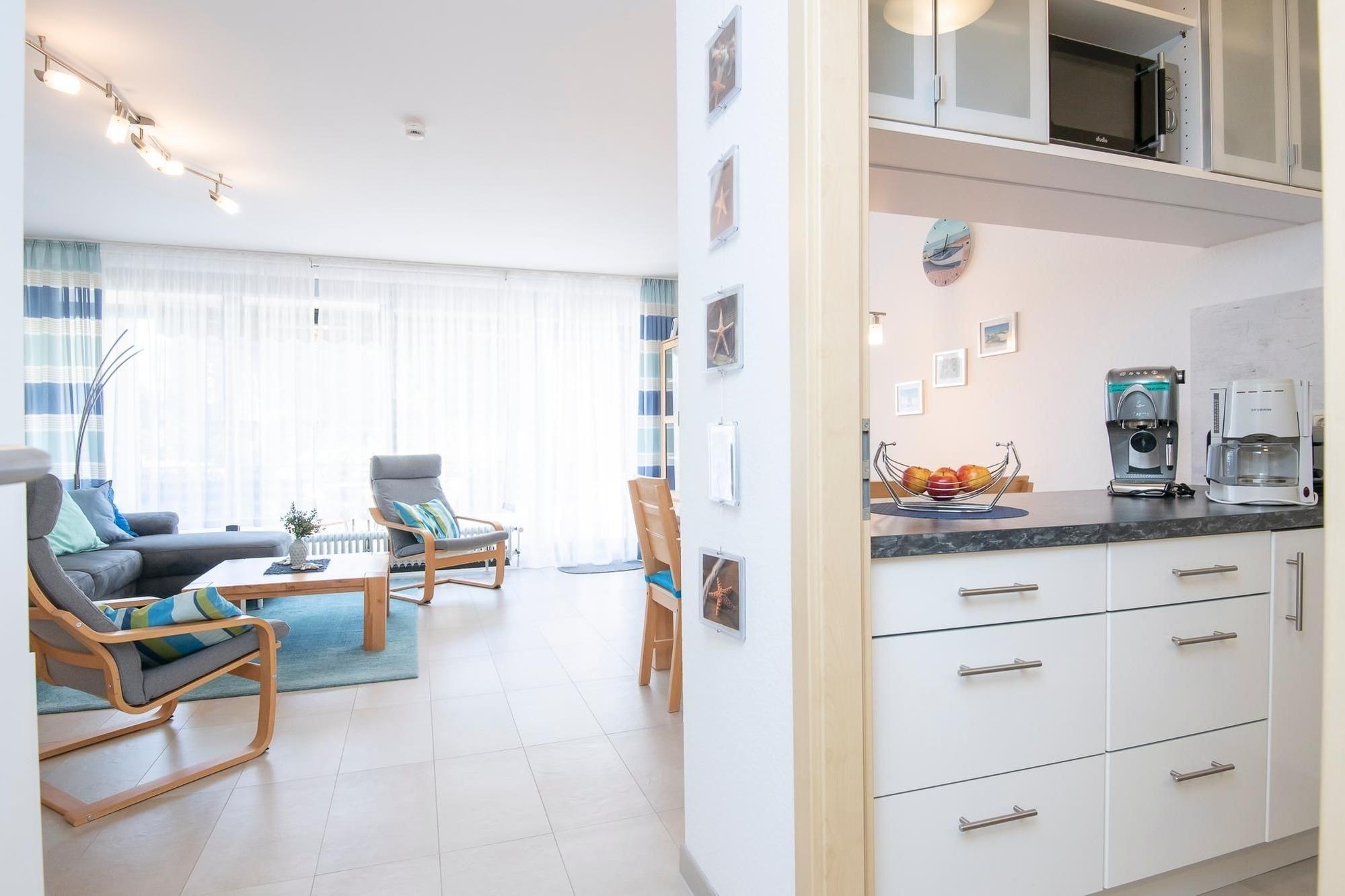 Zwischen Wald, Strand und Meer erwartet Sie diese gemütlich und anspruchsvoll eingerichtete Ferienwohnung. Das großzügiges Wohnzimmer mit integriertem Essbereich bildet den Mittelpunkt Ihrer Ferienwohnung. Verbringen Sie hier entspannte Stunden auf dem Ecksofa oder genießen Sie leckere Mahlzeiten. Diese können Sie in der offenen, modernen Einbauküche mit allen Annehmlichkeiten wie z. B. Geschirrspüler, Backofen, Mikrowelle und Ceranfeld zubereiten. Außerdem lässt sich dieser Raum im Handumdrehen durch die Schrankwand mit ausklappbaren Doppelbett (2x 80x200 cm) zu einem komfortablen Schlafplatz umwandeln. Von hier aus gelangen Sie auch auf den sonnigen Balkon. Dort können Sie die Ruhe genießen und Ihre Urlaubstage ausklingen lassen. Über den Flur erreichen Sie das zweite großen Schlafzimmer mit kuscheligem Einzelbett (90x190 cm) und einem französisches Bett (140x190 cm) sowie einem 2. Fernseher. Das schöne Bad verfügt über eine Dusche mit flachem Einstieg und rundet diese Wohnung damit ab.
