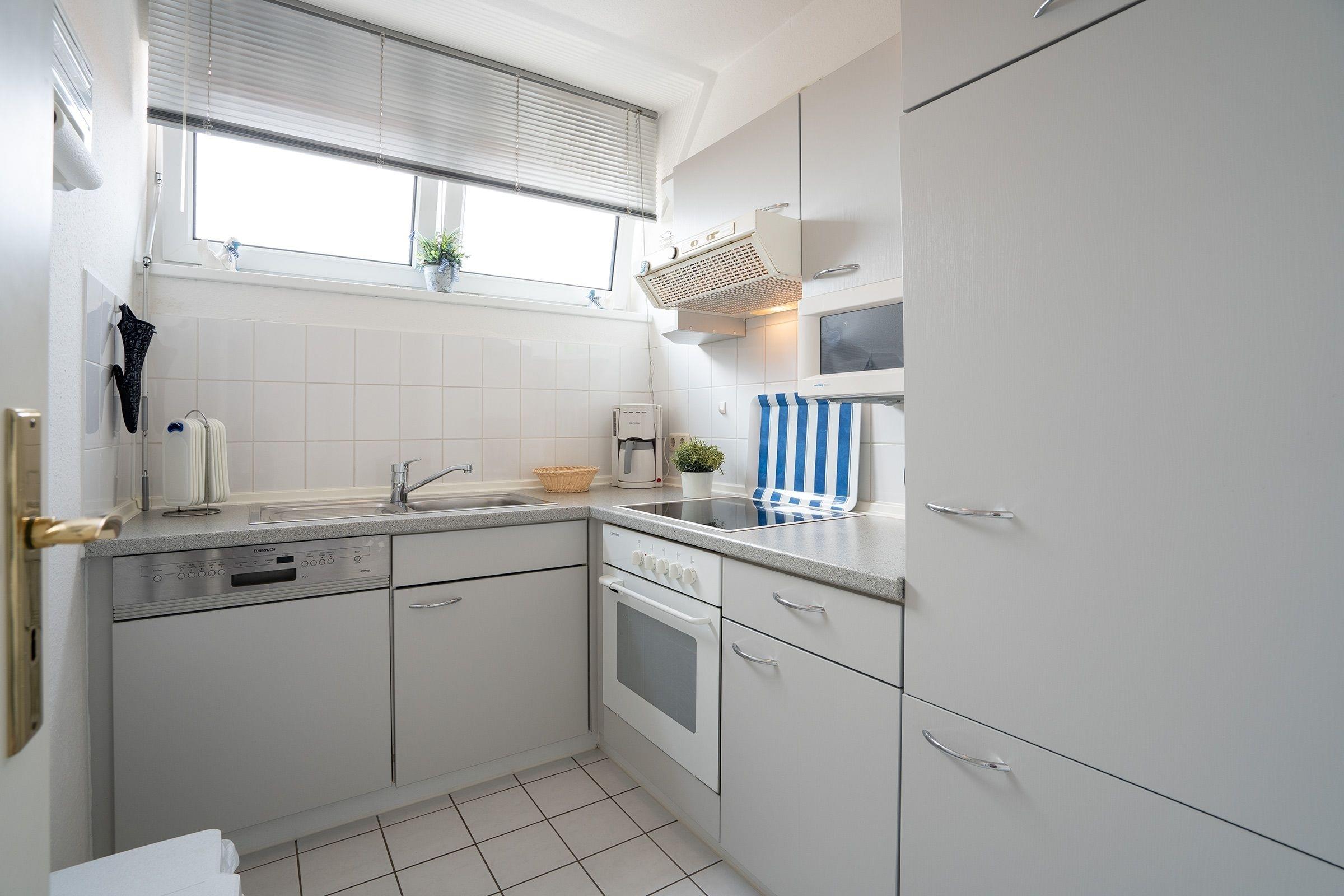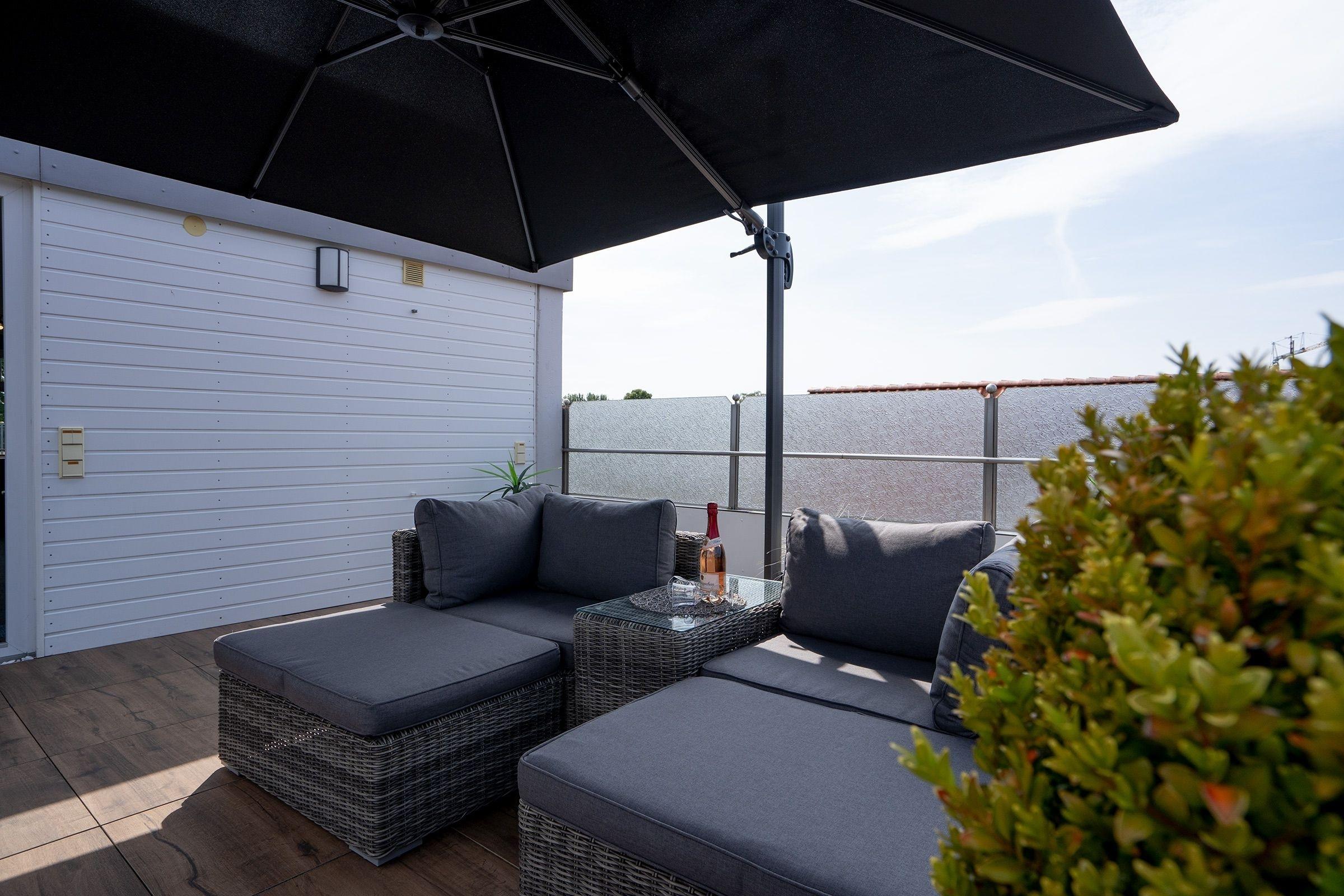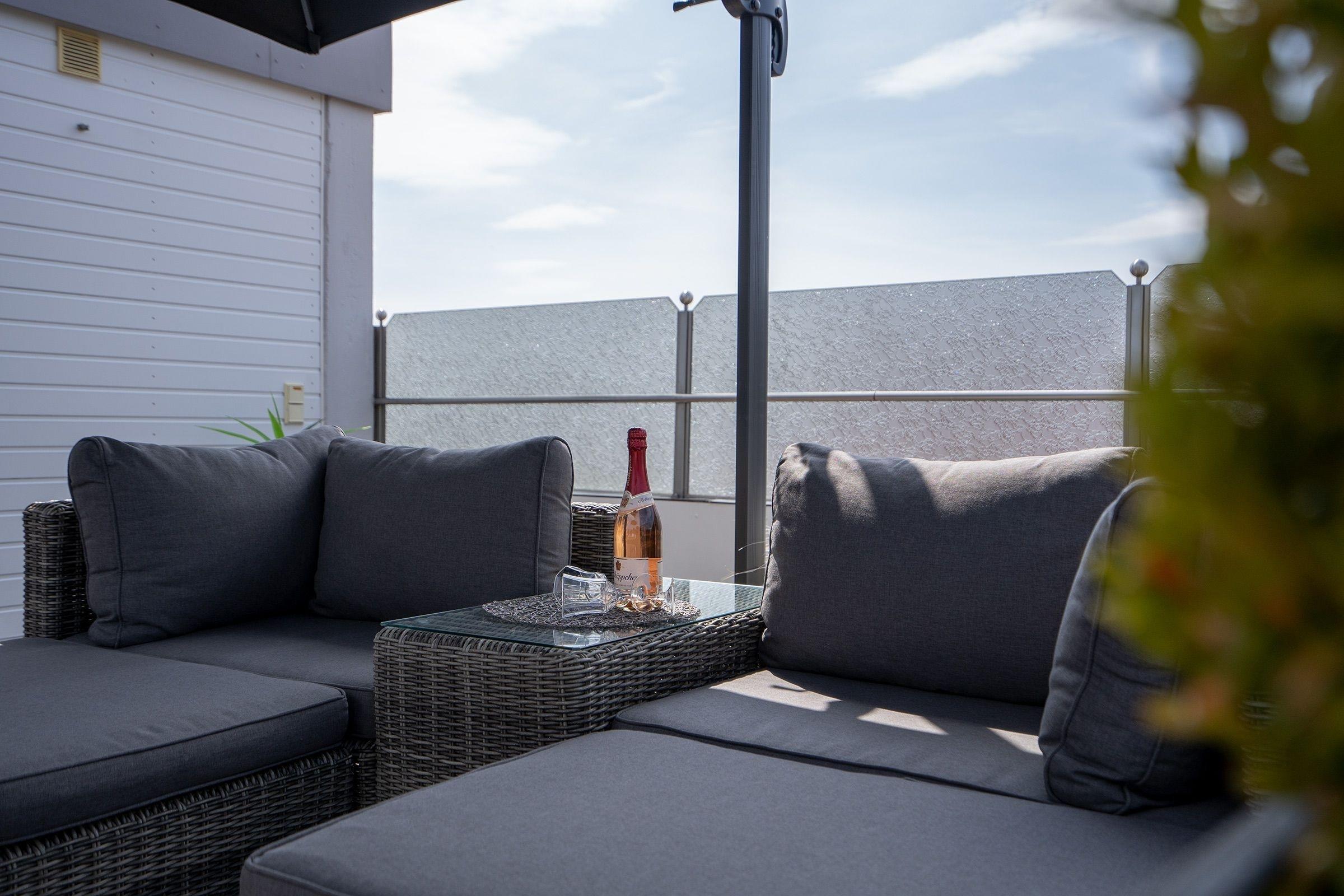 Der offene Wohn- und Essbereich empfängt Sie mit großzügiger Sofalandschaft, TV und Essplatz, sowie direktem Zugang zu Ihrer hochwertig möblierten Dachterrasse - sagenhafte 37 m² Outdoor-Bereich mit Esstisch, Lounge-Ecke und Sonnenschirm! Zusätzlich führt ein weiterer Zugang vom Wohnbereich auch auf den Balkon, der sich über die gesamte Breite der Wohnung erstreckt und ebenfalls vom Schlafzimmer aus begehbar ist. Auch der Balkon ist komfortabel mit Sonnenliege, Tisch und Strandkorb ausgestattet. Eines der Schlafzimmer umfasst ein bequemes Doppelbett (2x 90x200 cm), einen großen Kleiderschrank mit Spiegel, zwei Nachtischchen mit Leselampen und einen direkten Balkonzugang. Das kleinere Schlafzimmer ist mit zwei Einzelbetten (je 90x200 cm), Kleiderschrank und zwei Nachtischchen mit Leselampen ausgestattet. Die separate Küche bietet tolle Alltagshelfer wie Spülmaschine, Backofen und 4-Platten-Ceranherd. Das Designbad ist modern und geschmackvoll gestaltet und begeistert mit Annehmlichkeiten wie Dusche mit niedrigem Einstieg, beleuchtetem Schminkspiegel und Wellness-Atmosphäre.