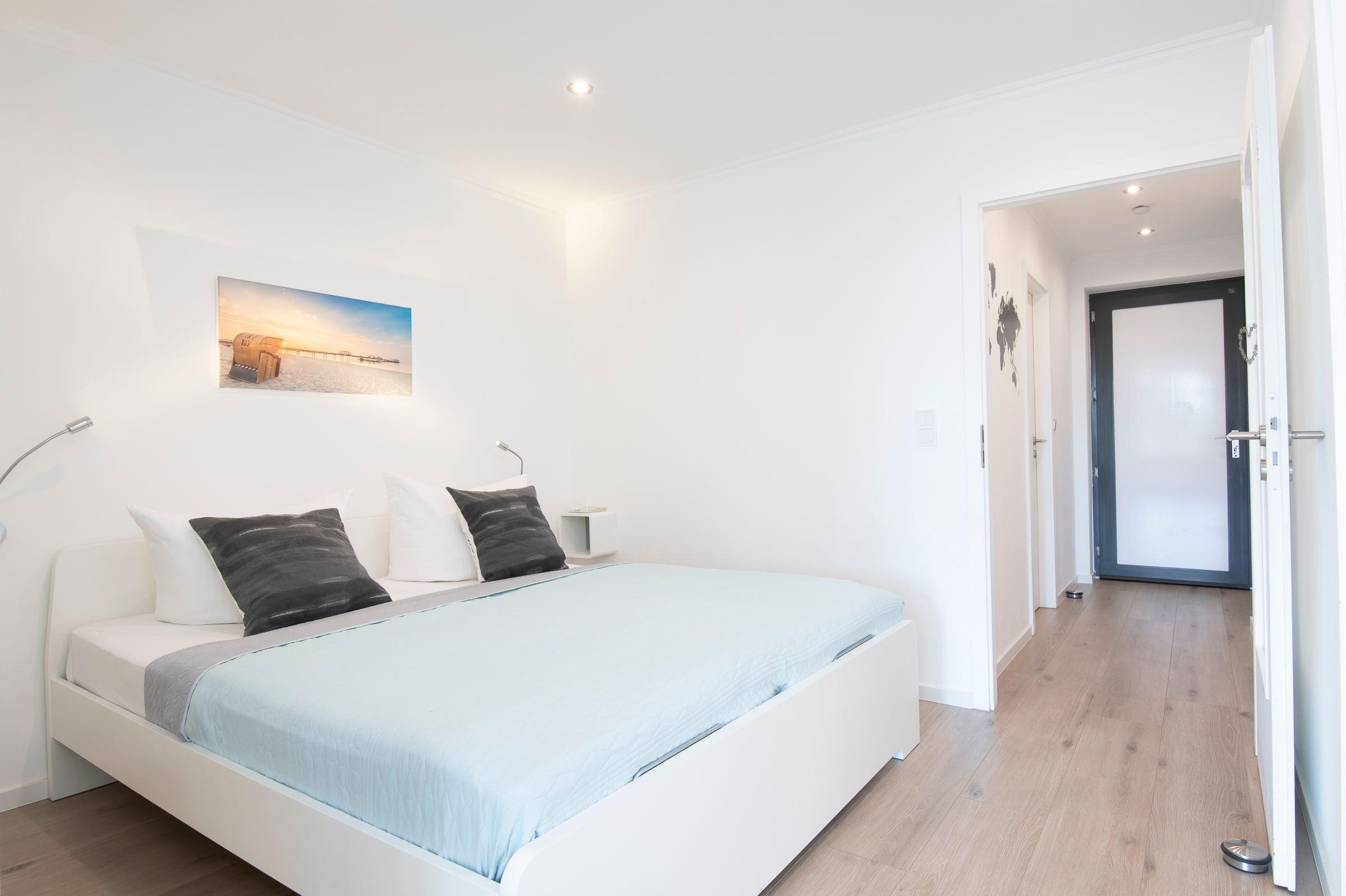 Ihr Urlaub beginnt bei Betreten dieser schicken Ferienwohnung mit offenem Raumkonzept. Es begrüßt Sie ein modern gestalteter Wohn- und Essbereich mit behaglicher Sofaecke, die zum erholen einlädt. Unterhaltung bietet Ihnen der 55 Zoll Flachbild-TV mit integriertem Radio. Außerdem erreichen Sie von hier auch den großzügigen Sonnen-Balkon, der den idealen Ort für ein entspanntes Frühstück oder einen lauen Sommerabend bietet. Die angrenzende, helle Küche ist u.a. mit einem 2 Platten-Cerankochfeld, Mikrowelle, Geschirrspüler, Kaffeemaschine, Toaster und Wasserkocher ausgestattet und lässt keine Wünsche offen. In dem im Wohnzimmer integrierten Schlafbereich finden zwei Urlaubsgäste im gemütlichen Doppelbett (180x200cm) Ihre Nachtruhe. Über den Flur gelangen Sie in das separate Schlafzimmer mit zwei Einzelbetten (jeweils 90x200 cm). Das innenliegende helle Duschbad mit Handtuchwärmer und Fön rundet das Angebot ab. Hier lässt es sich gut entspannen.