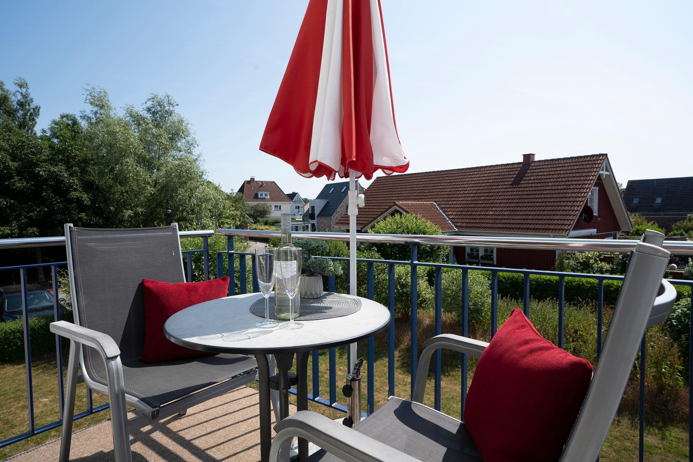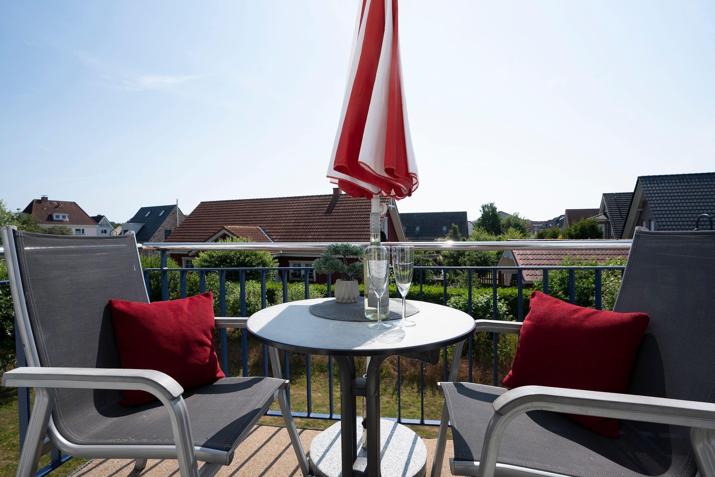 Gemütliche Ferienwohnung mit Balkon nahe Strand in Kellenhusen, ideal für 2 Personen und mit Hund erlaubt.