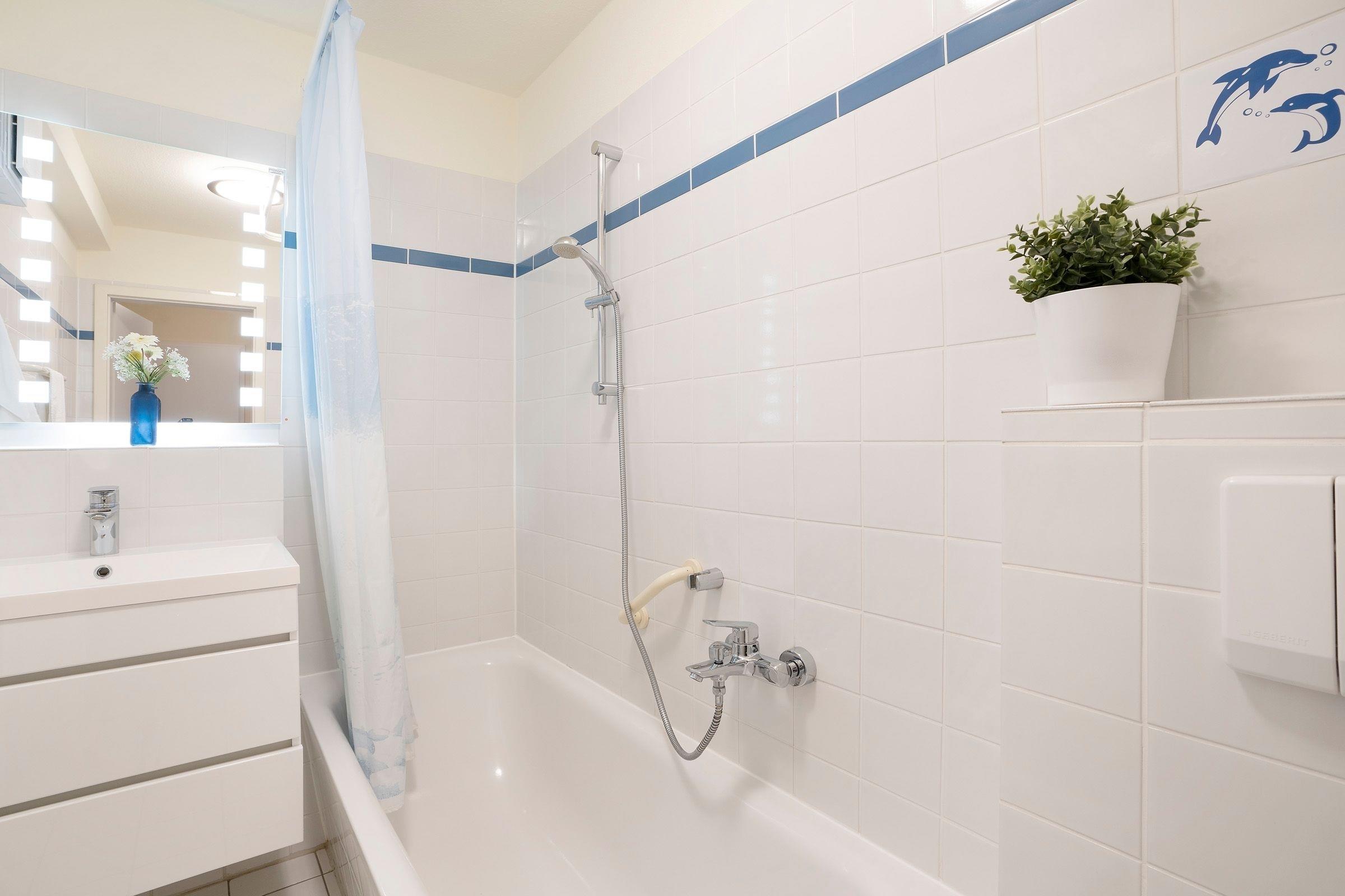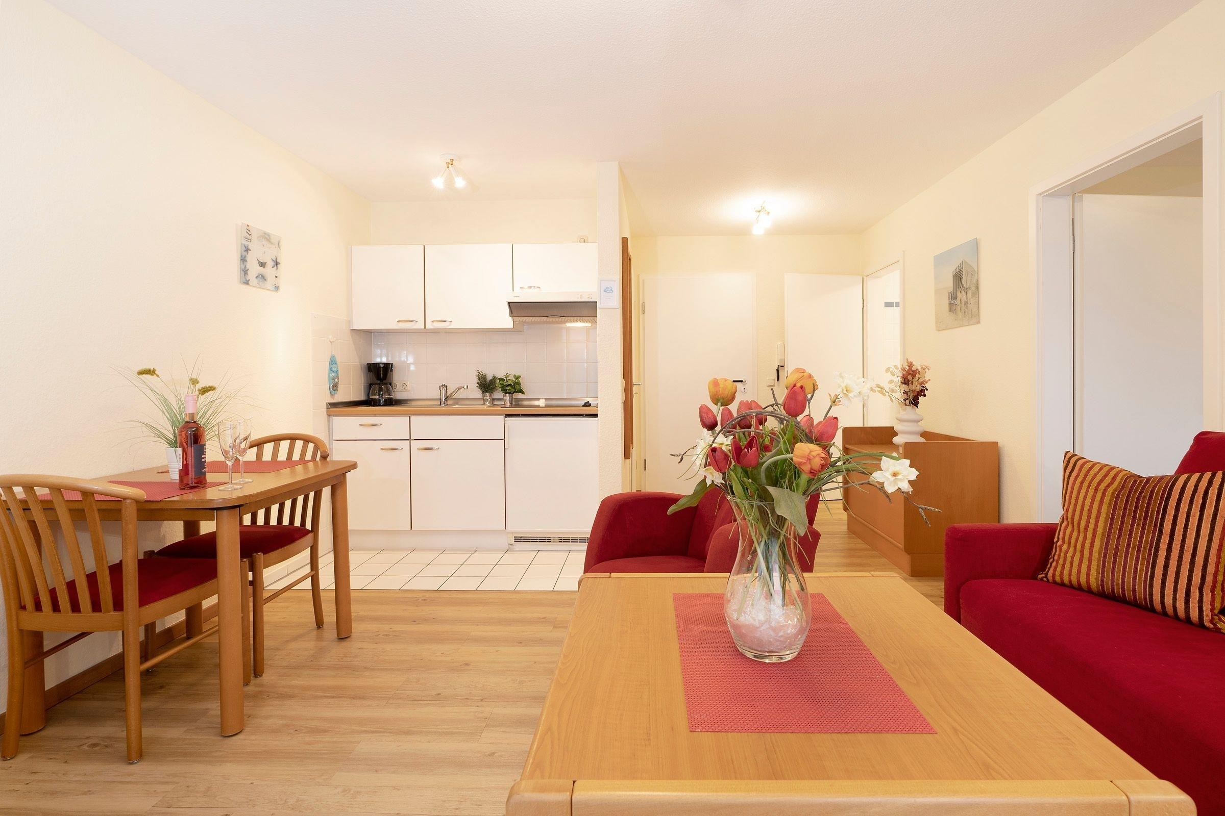 Diese schöne Ferienunterkunft begrüßt Sie mit einem sonnigen Balkon in ruhiger, strandnaher Lage. Im gemütlichen Wohnbereich befinden sich ein Sofa mit Schlaffunktion (180x200 cm) und ein Sessel vor dem TV-Gerät, eine kleine Essecke sowie eine offene, funktional ausgestattete Küchenzeile. Das französische Bett (ca. 140x200 cm) im separaten Schlafzimmer wird Ihnen sicher wunderbare Träume bescheren. Hier stehen auch ein Kleiderschrank für Ihre Urlaubsgarderobe sowie ein Schreibtisch. Das gepflegte Duschbad ist hell gefliest.