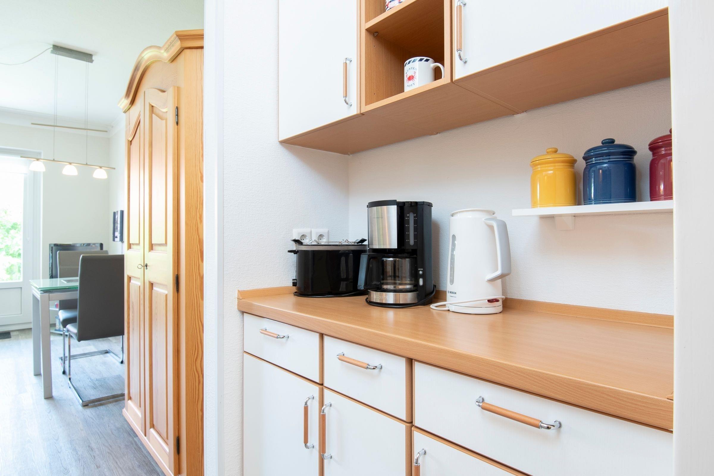Die Wohnung verfügt über ein Wohn-/ Schlafzimmer mit Ecksofa, TV (Kabelanschluss), Esstisch und einem Kleiderschrank. Als Schlafmöglichkeit dient die Schrankwand mit ausklappbaren Betten (2x 90x200 cm). Die Küche ist zum Wohnzimmer offen und ist mit allen Notwendigkeiten wie z. B. Kaffeemaschine, Toaster, Wasserkocher und Kühlschrank ausgestattet. Ein hell gefliestes, innenliegendes Badezimmer mit Dusche und WC ist ebenfalls vorhanden. Viele schöne Stunden können Sie auf der sonnigen Terrasse verbringen...
