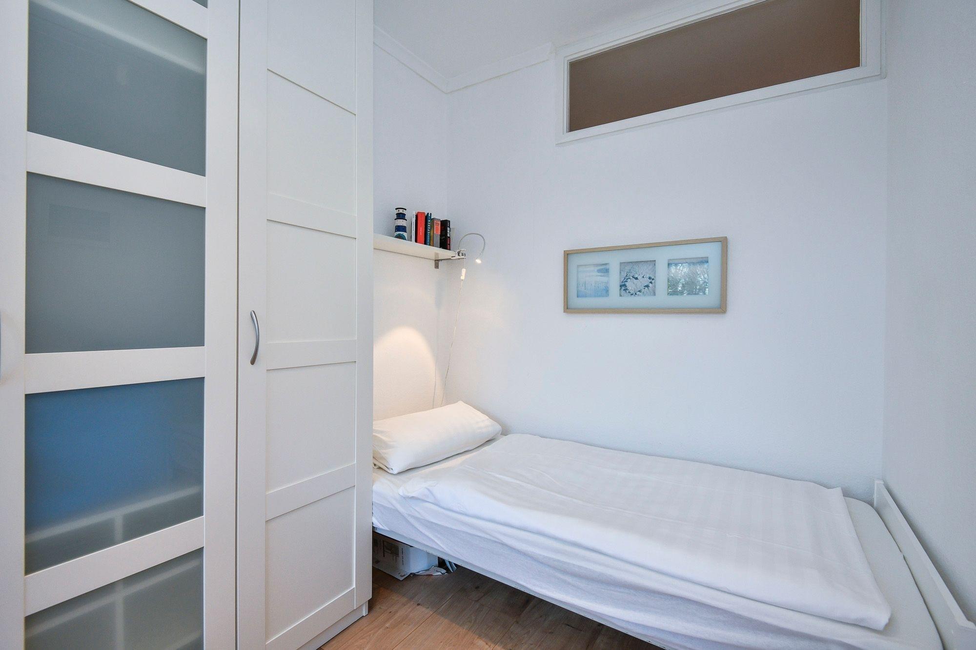 Schlafzimmer: 1 Einzelbett (90x200 cm), Kleiderschrank, Verdunkelung (Gardinen)