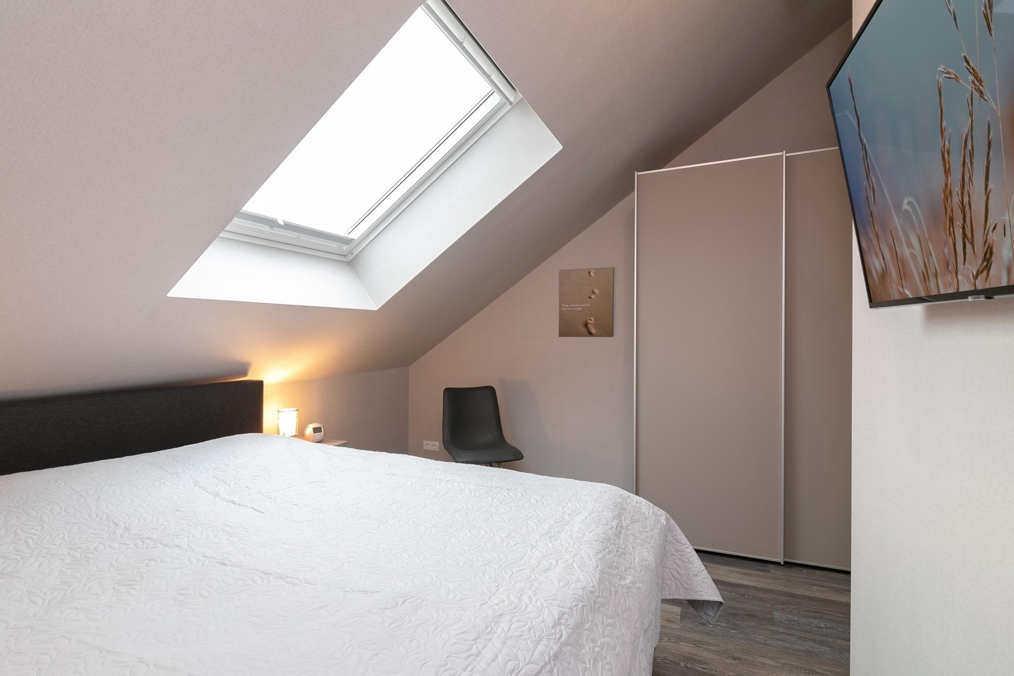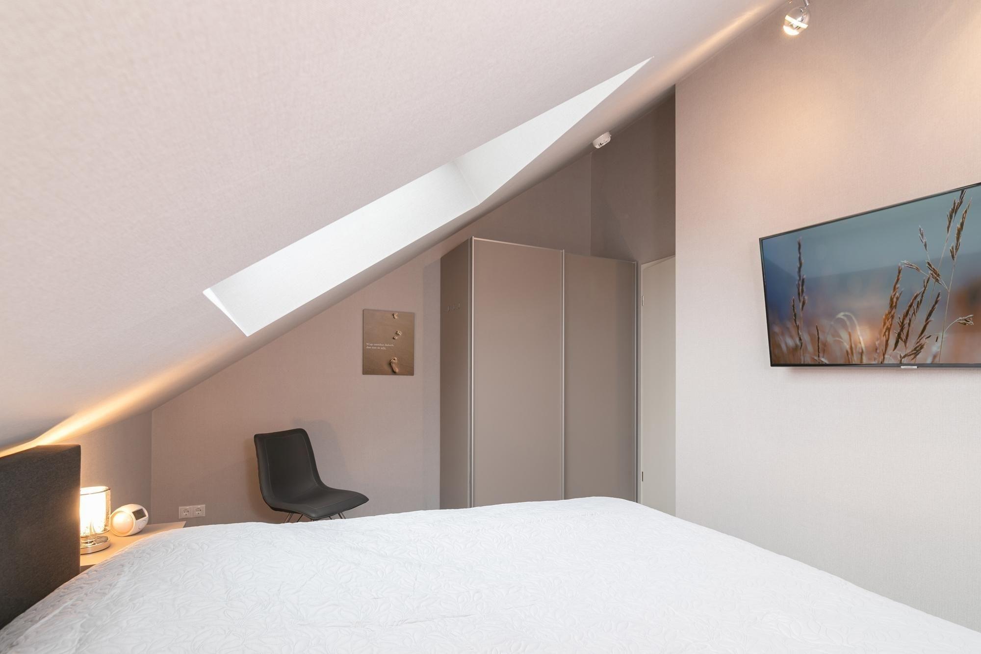 Schlafzimmer: 1 Boxspringbett (180x200 cm), TV, Sonnenschutzplissee
