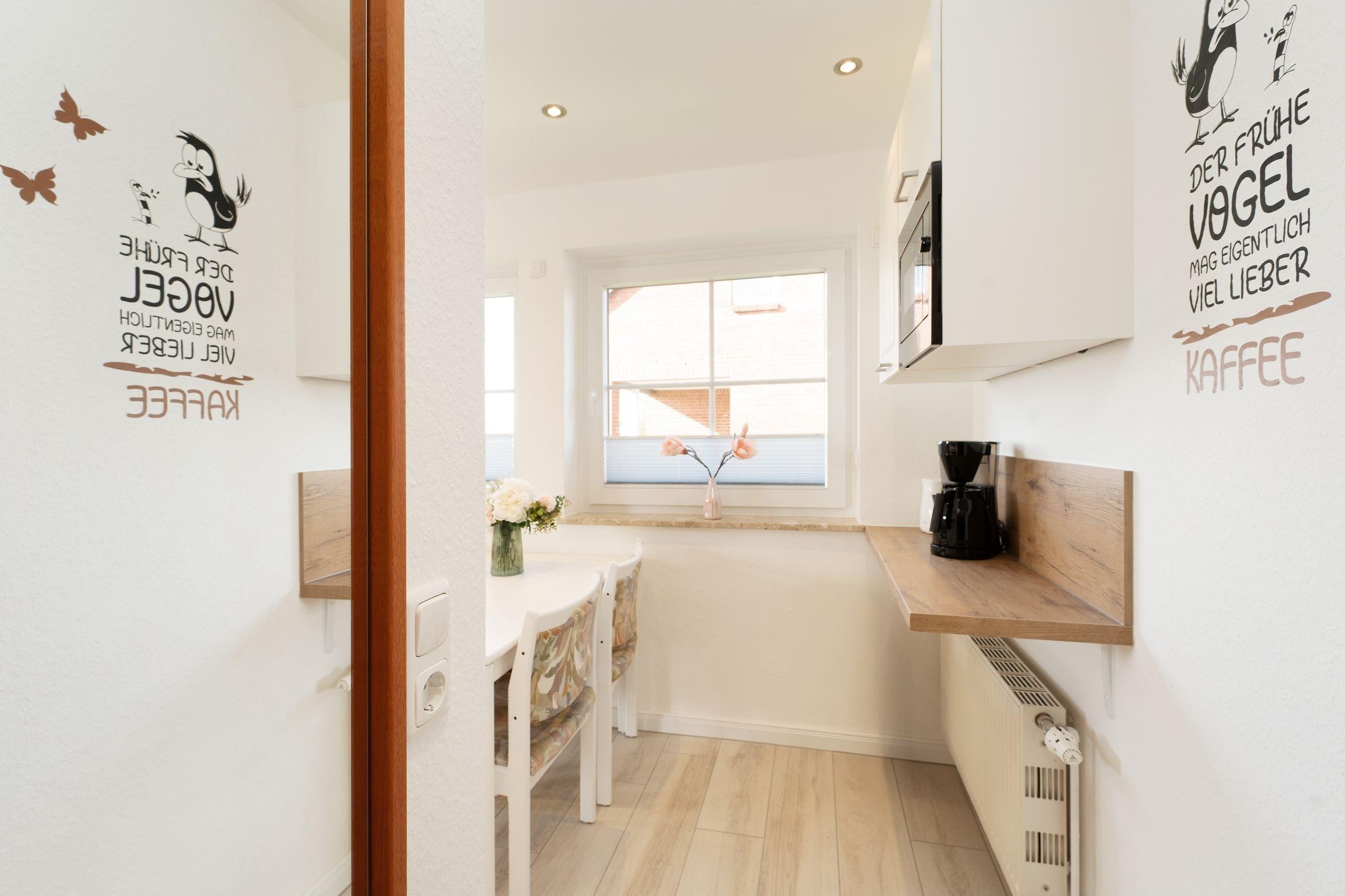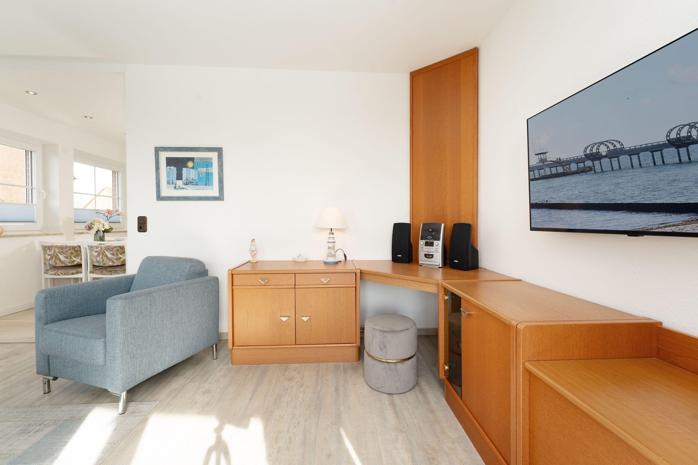 Die Ostsee im Blick, dazu eine gemütliche Einrichtung – was will man mehr? Die niedliche Wohnung Muschelschnecke im gepflegten Ferien-Wohnpark Kaiserhof bietet Ihnen Meerblick, Strandnähe und eine gute Ausstattung zum Wohlfühlen. Nehmen Sie Platz auf dem gemütlichen Sofa oder den beiden Sesseln. Genießen Sie hier das TV-Programm – oder aber die Fernsicht. Gleich hier haben Sie Zutritt auf den möblierten Balkon, der Ihnen ein wundervolles Panorama bietet. Genießen Sie hier Ihre Auszeit, dazu ein gutes Buch und etwas Obst. Die helle Küchenzeile sowie einen gemütlichen Ess-Platz finden Sie im Wohnbereich, gleich um die Ecke. Zaubern Sie hier nach Lust und Laune Ihre Lieblingsmenüs. Nach einem schönen Tag am Strand haben Sie die Wahl: Zum einen lässt sich die Couch im Wohnzimmer in ein komfortables Doppelbett (ca. 160x200 cm) verwandeln. Oder Sie ziehen sich ins Schlafzimmer zurück, dort steht ein gemütliches Doppelbett (2x 80x200 cm). Das hell geflieste Bad ist mit einem beleuchteten Spiegel ausgestattet und verspricht einen guten Start in den Tag.