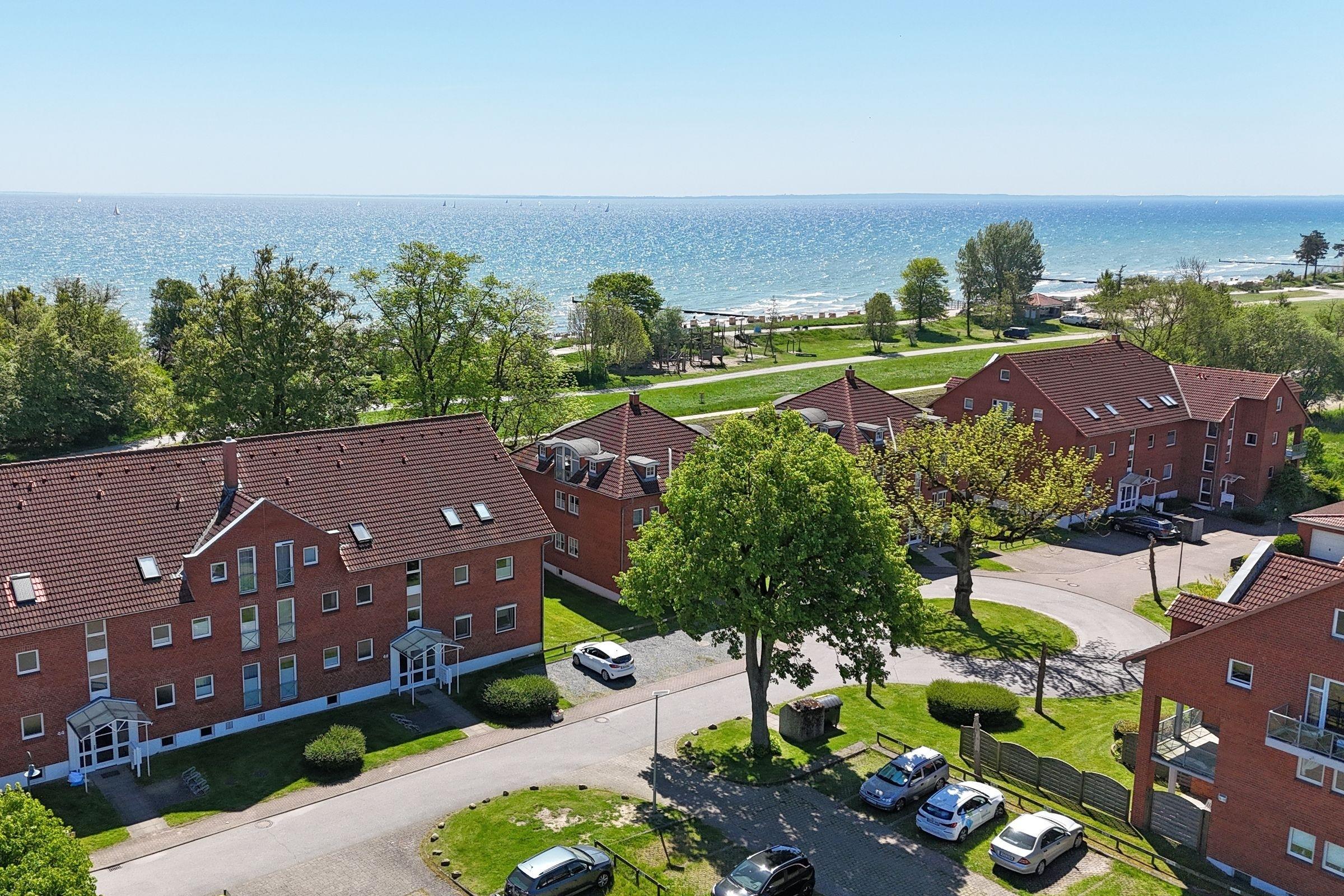 Mehr Ostsee geht kaum. Die Ferienwohnung Muschelkrebs im gepflegten Ferien-Wohnpark Kaiserhof bietet Ihnen einen traumhaften Ostsee-Blick und ist dazu nur rund 120 Meter vom Strand entfernt. Treten Sie ein, Ihr Urlaub kann beginnen. Der helle Wohnbereich begrüßt Sie mit einer schönen Polster-Garnitur. Hier können Sie gut relaxen, die Dachschrägen sorgen dabei für eine gemütliche Atmosphäre. Bei der Couch handelt es sich um eine Schlafcouch, die sich bei Bedarf in ein Doppelbett (ca. 160x200 cm) verwandeln lässt. Von hier aus haben Sie Zugang auf den möblierten Balkon. Ist der Blick über die Ostsee nicht grandios? Genießen Sie die Aussicht zum Beispiel bei einem Glas Wein. Zurück im Wohnbereich: Die offene Küchenzeile befindet sich um die Ecke. Bereiten Sie hier Ihre Lieblings-Speisen zu und genießen Sie diese in der gemütlichen Ess-Ecke – auch hier haben Sie einen tollen, seitlichen Blick auf die Ostsee. Ihre wohlverdiente Nachtruhe finden Sie im separaten Schlafzimmer. Das Doppelbett (2x 80x200 cm) ist sehr bequem und hat ein offenes Fußende. Das helle Duschbad ist mit einem beleuchteten Spiegel ausgestattet.