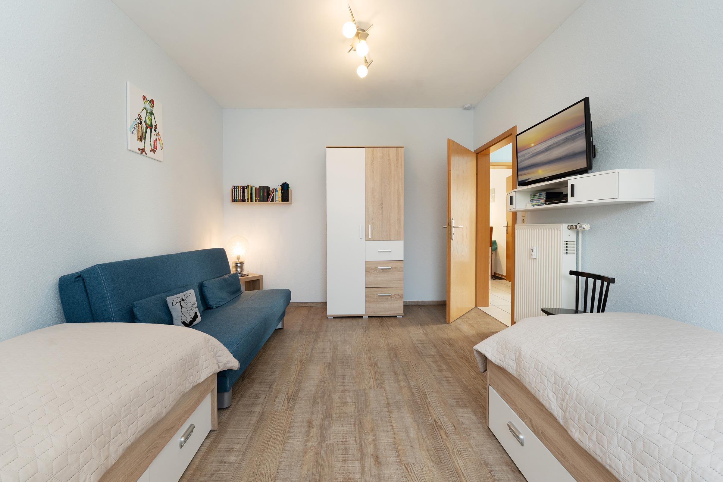 Schlafzimmer 2: 2 Einzelbetten (je 90x200 cm), Kleiderschrank, Verdunkelung (Außenrollläden)