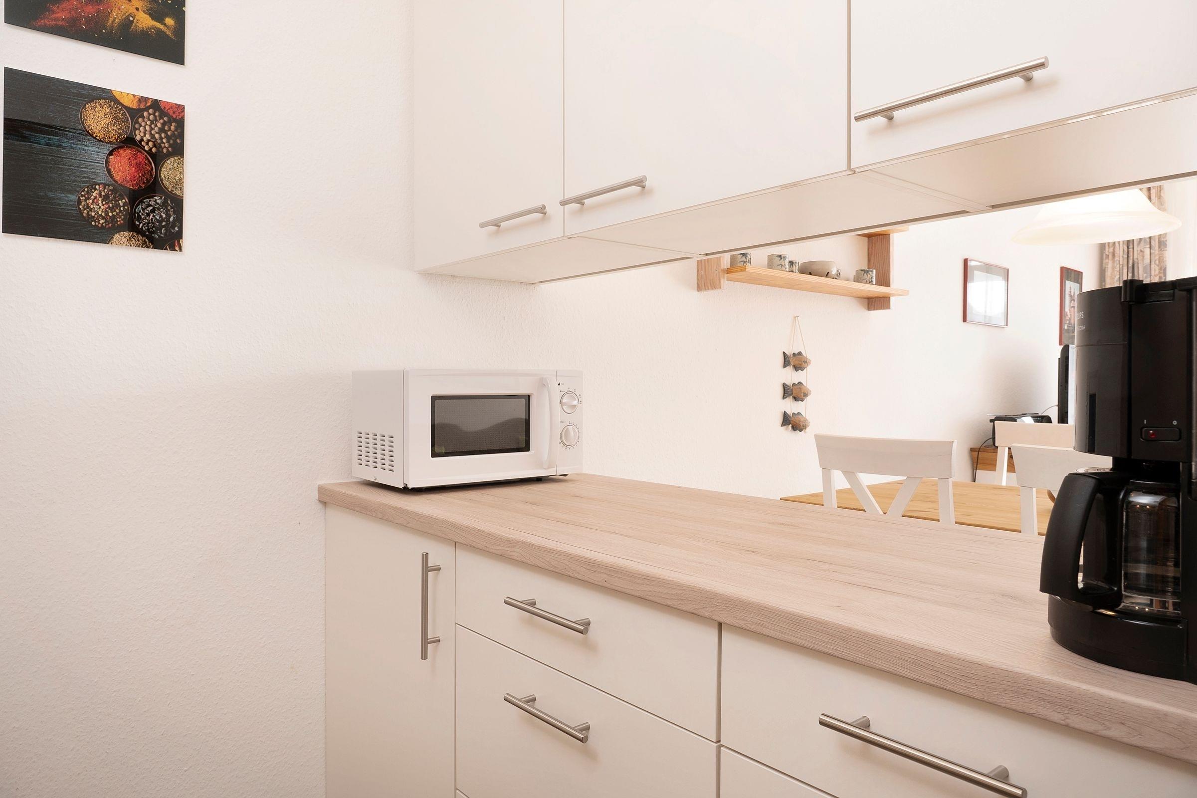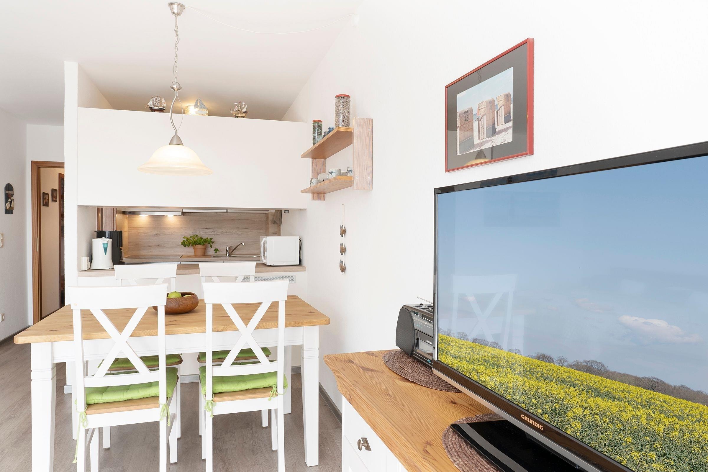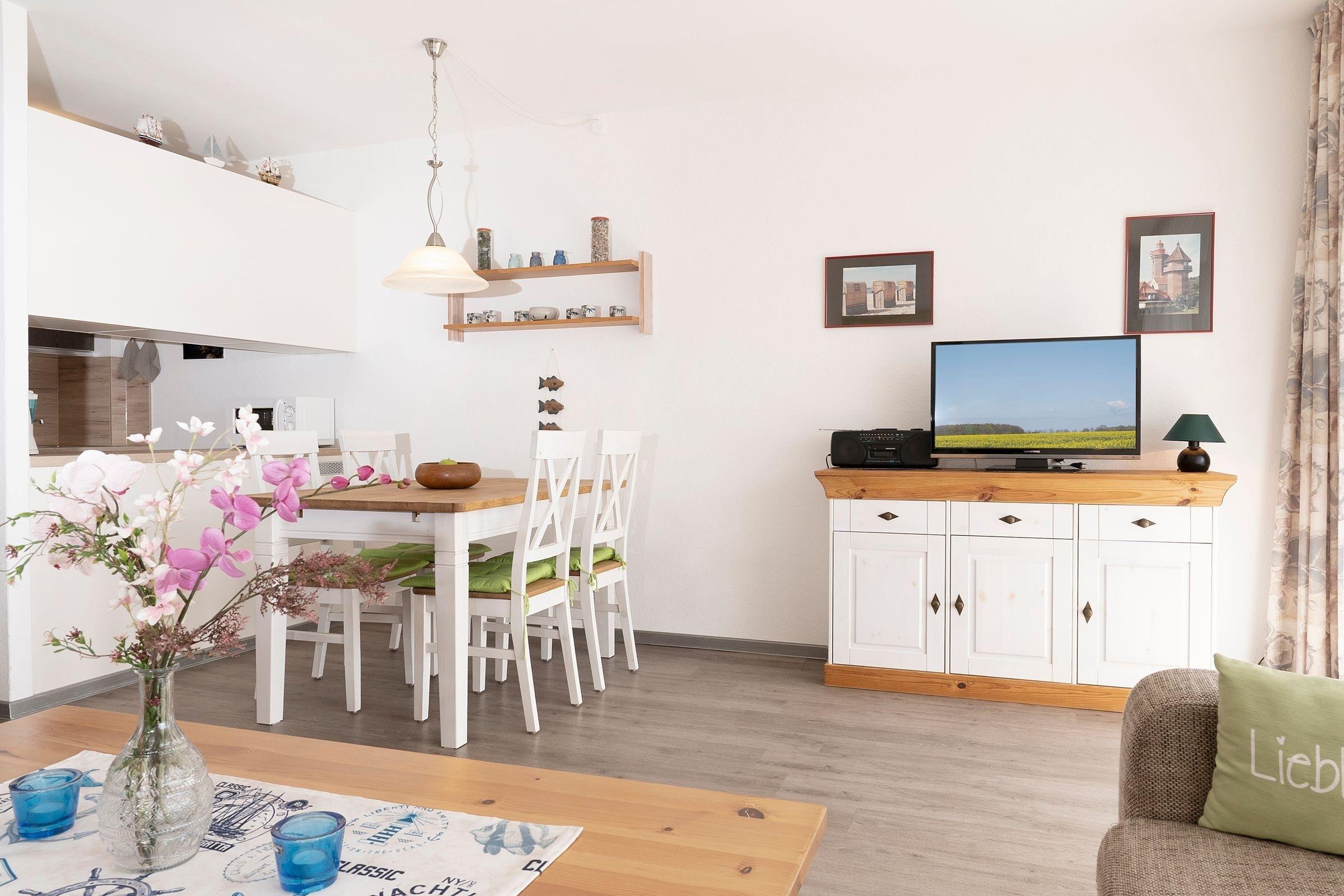 Diese geräumigen Ferienwohnung zwischen Wald und Strand erwartet Sie mit einem großzügigen Wohnzimmer mit integriertem Schlafbereich. Eine komfortable Sofaecke bietet mit einem TV den idealen Entspannungsort nach einem sonnigen Tag, die Essecke lädt zum geselligen Schmaus oder Spieleabend ein. Außerdem können Sie Ihre Seele auf dem sonnigen Balkon dieser Unterkunft baumeln lassen und sich die Meeresluft um die Nase wehen lassen. Die Küche ist zum Wohnzimmer hin offen, sodass Sie gemeinsam schöne Kochabende verbringen können. Mit Backofen, Mikrowelle, Kaffeemaschine und Geschirrspüler ist diese gut ausgestattet. Zwei Urlaubsgäste können direkt im Wohnbereich in die Federn fallen und sich über Nacht in dem gemütlichen Doppelbett (ca. 160x200 cm) erholen. Der über den Flur erreichbare, separate Schlafraum verfügt über 2 Einzelbetten (je 90 x200 cm). Das funktionale Bad ist ausgestattet mit Dusche und WC und verspricht damit einen erfrischenden Start in den Tag.