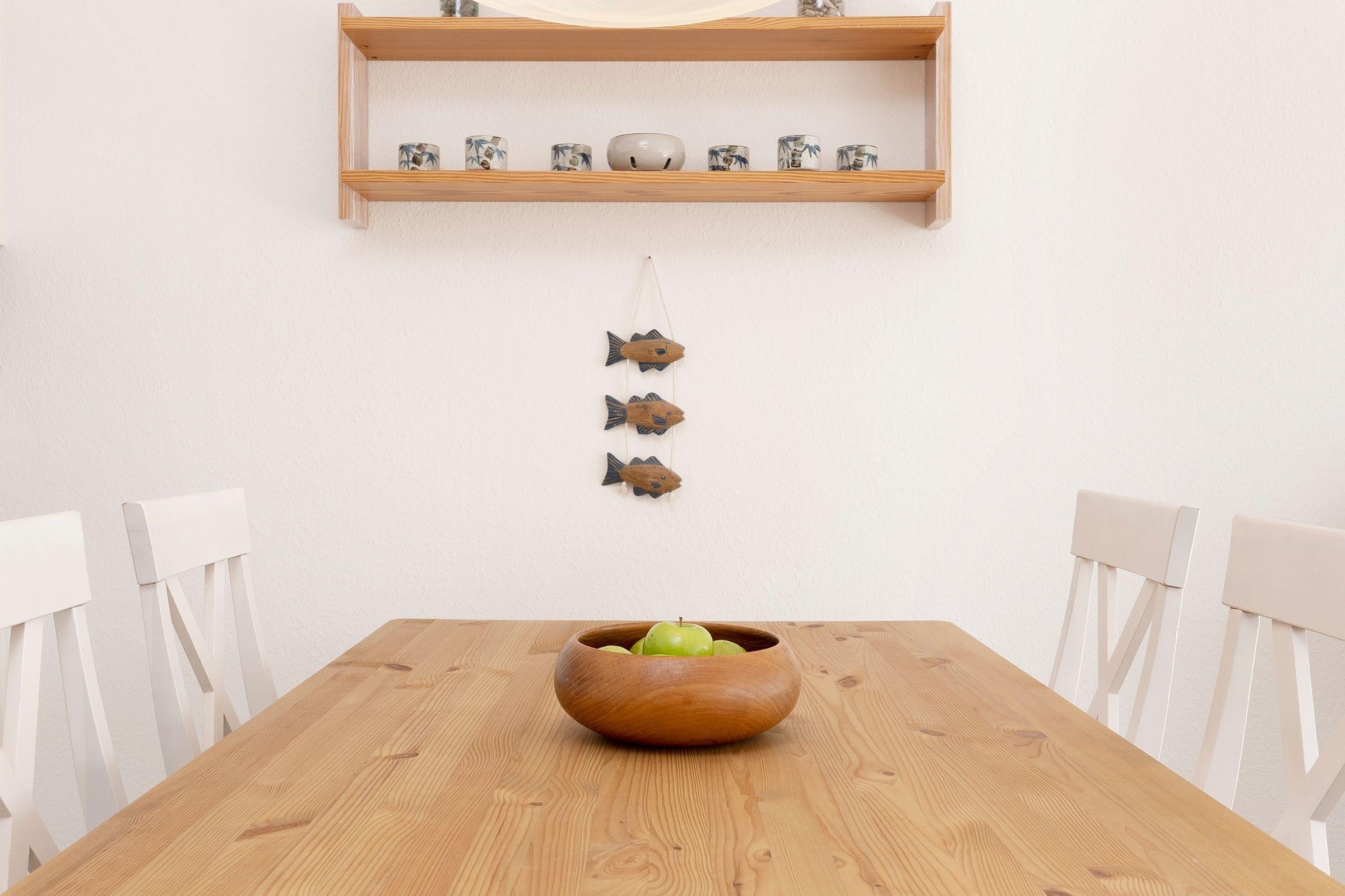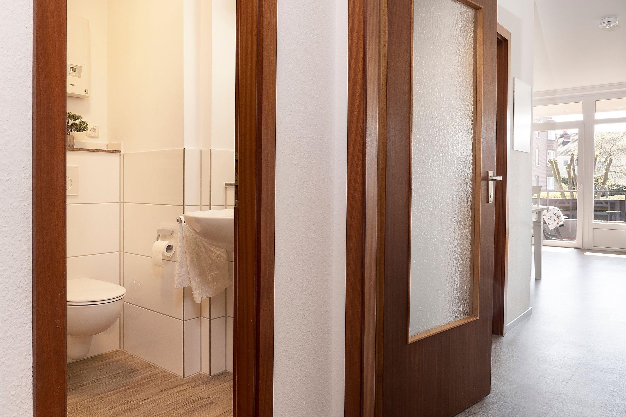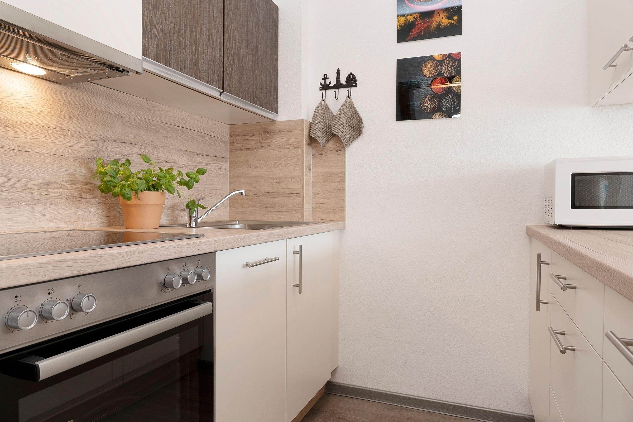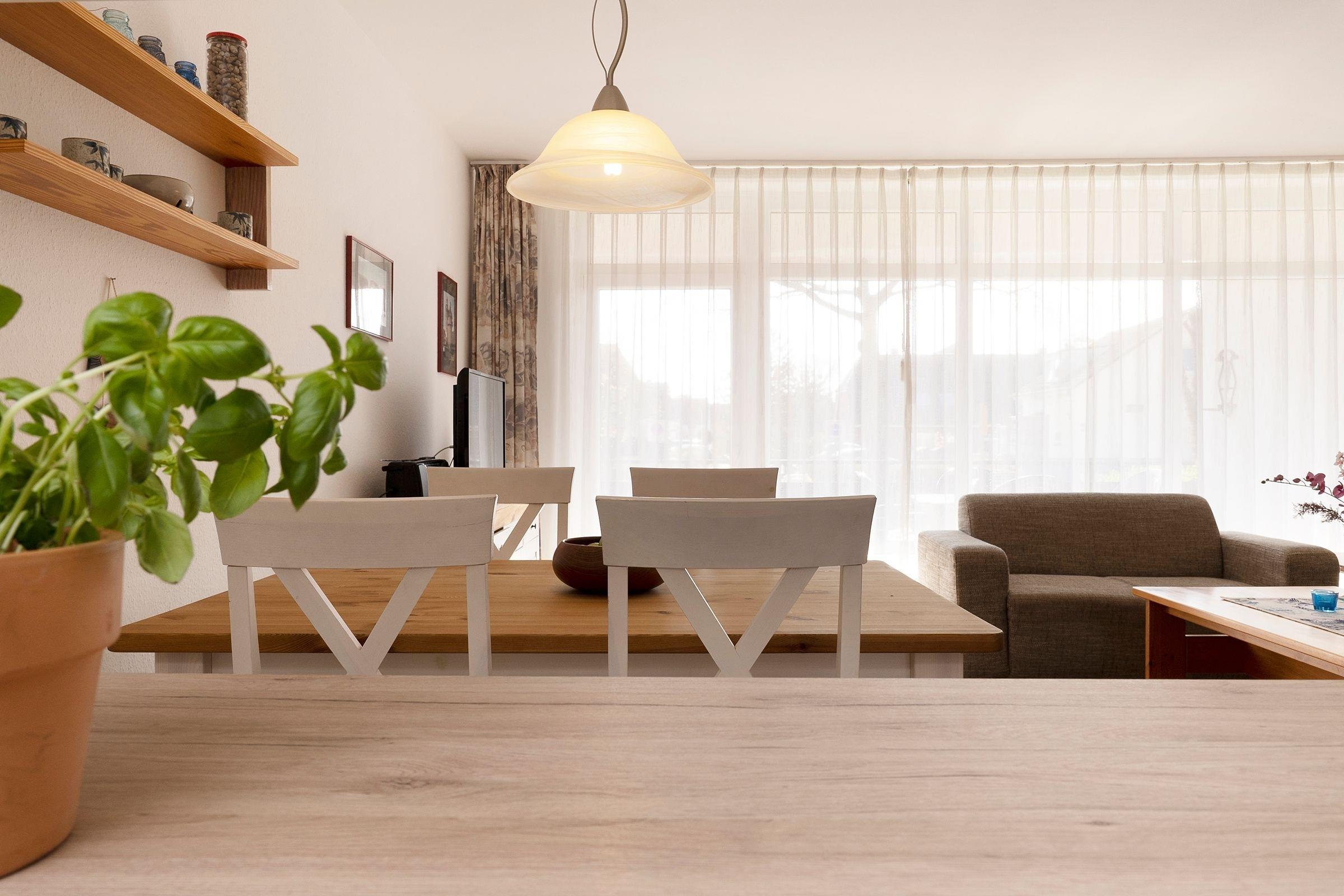 Diese geräumigen Ferienwohnung zwischen Wald und Strand erwartet Sie mit einem großzügigen Wohnzimmer mit integriertem Schlafbereich. Eine komfortable Sofaecke bietet mit einem TV den idealen Entspannungsort nach einem sonnigen Tag, die Essecke lädt zum geselligen Schmaus oder Spieleabend ein. Außerdem können Sie Ihre Seele auf dem sonnigen Balkon dieser Unterkunft baumeln lassen und sich die Meeresluft um die Nase wehen lassen. Die Küche ist zum Wohnzimmer hin offen, sodass Sie gemeinsam schöne Kochabende verbringen können. Mit Backofen, Mikrowelle, Kaffeemaschine und Geschirrspüler ist diese gut ausgestattet. Zwei Urlaubsgäste können direkt im Wohnbereich in die Federn fallen und sich über Nacht in dem gemütlichen Doppelbett (ca. 160x200 cm) erholen. Der über den Flur erreichbare, separate Schlafraum verfügt über 2 Einzelbetten (je 90 x200 cm). Das funktionale Bad ist ausgestattet mit Dusche und WC und verspricht damit einen erfrischenden Start in den Tag.