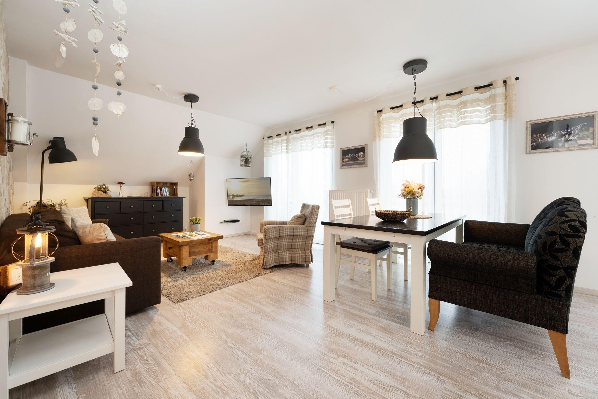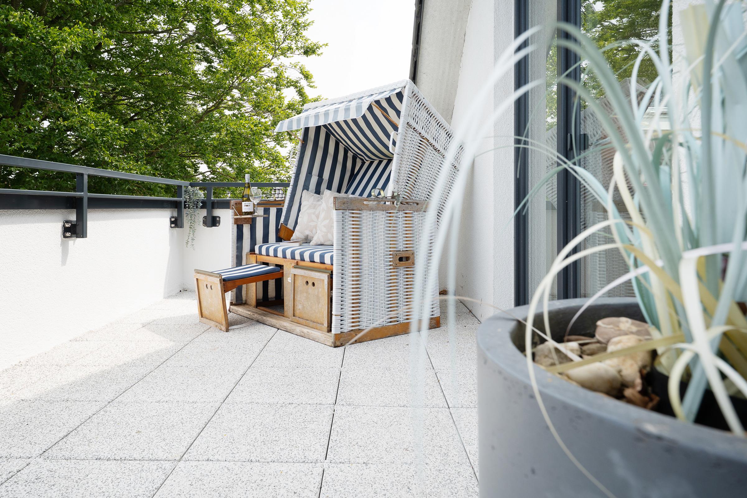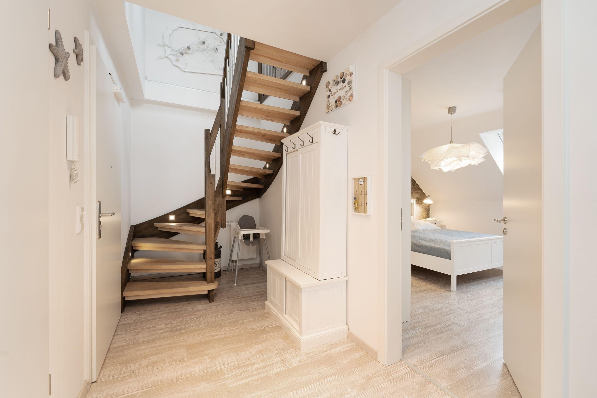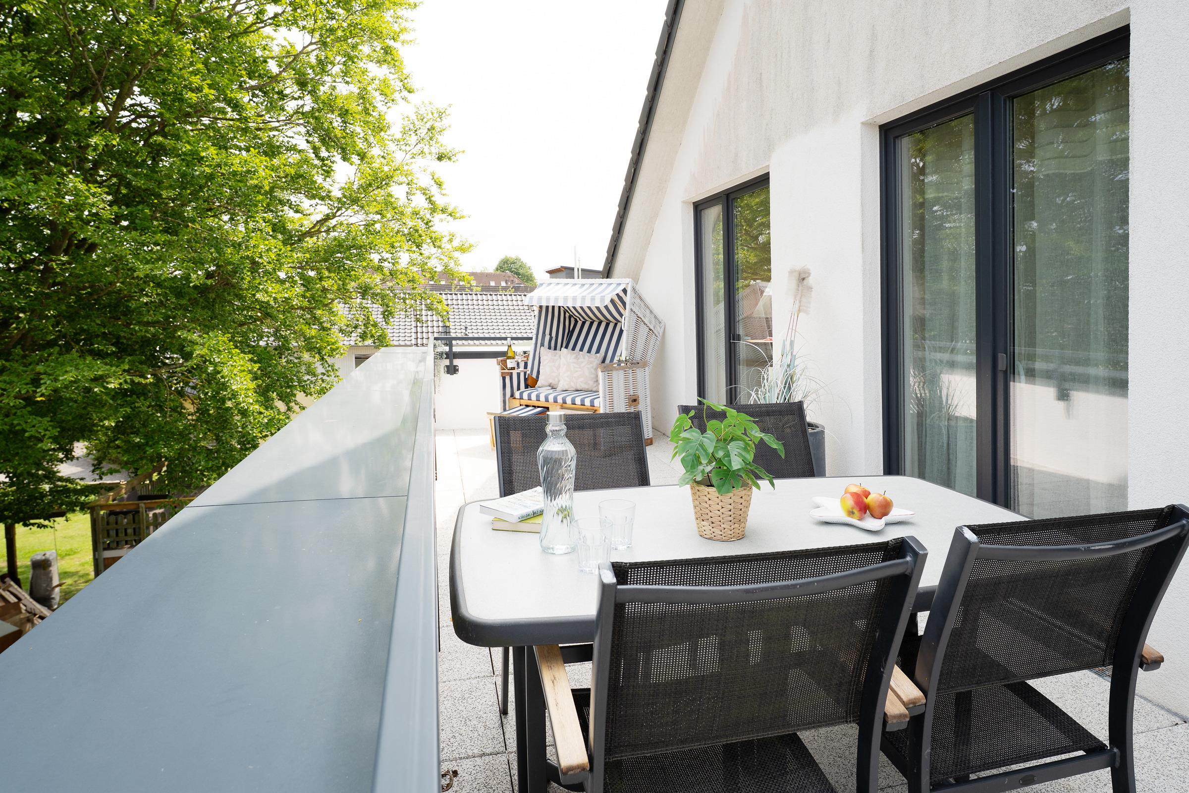 Ankommen ... Auspacken ... Wohlfühlen ... Diese Ferienwohnung erstreckt sich über 2 Ebenen und ist aufgeteilt in einen großzügigen Wohn-/Essbereich mit TV und Zugang zur 21 m² großen Dachterrasse mit Strandkorb - hier können Sie herrlich entspannen! Die Einbauküche ist zum Wohnbereich hin offen gestaltet und mit Backofen, Mikrowelle, Geschirrspüler, Kühlschrank, Kaffeemaschine, Toaster etc. ausgestattet. Ein Schlafzimmer verfügt über ein Doppelbett (2x 90x200 cm) und zusätzlichen TV, das zweite Schlafzimmer befindet sich in der oberen Etage und hat 2 Einzelbetten, die beide zu Doppelbetten (Liegefläche ca. 160x200 cm) ausgezogen werden können. Das moderne Bad mit WC und bodentiefer Dusche rundet das Angebot ab.