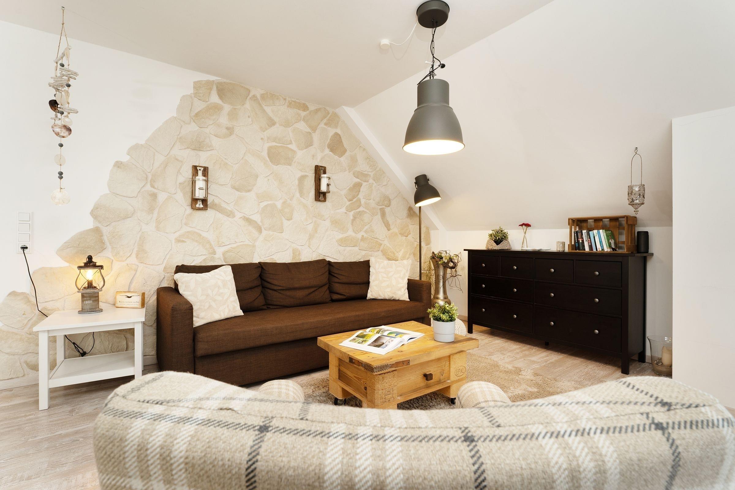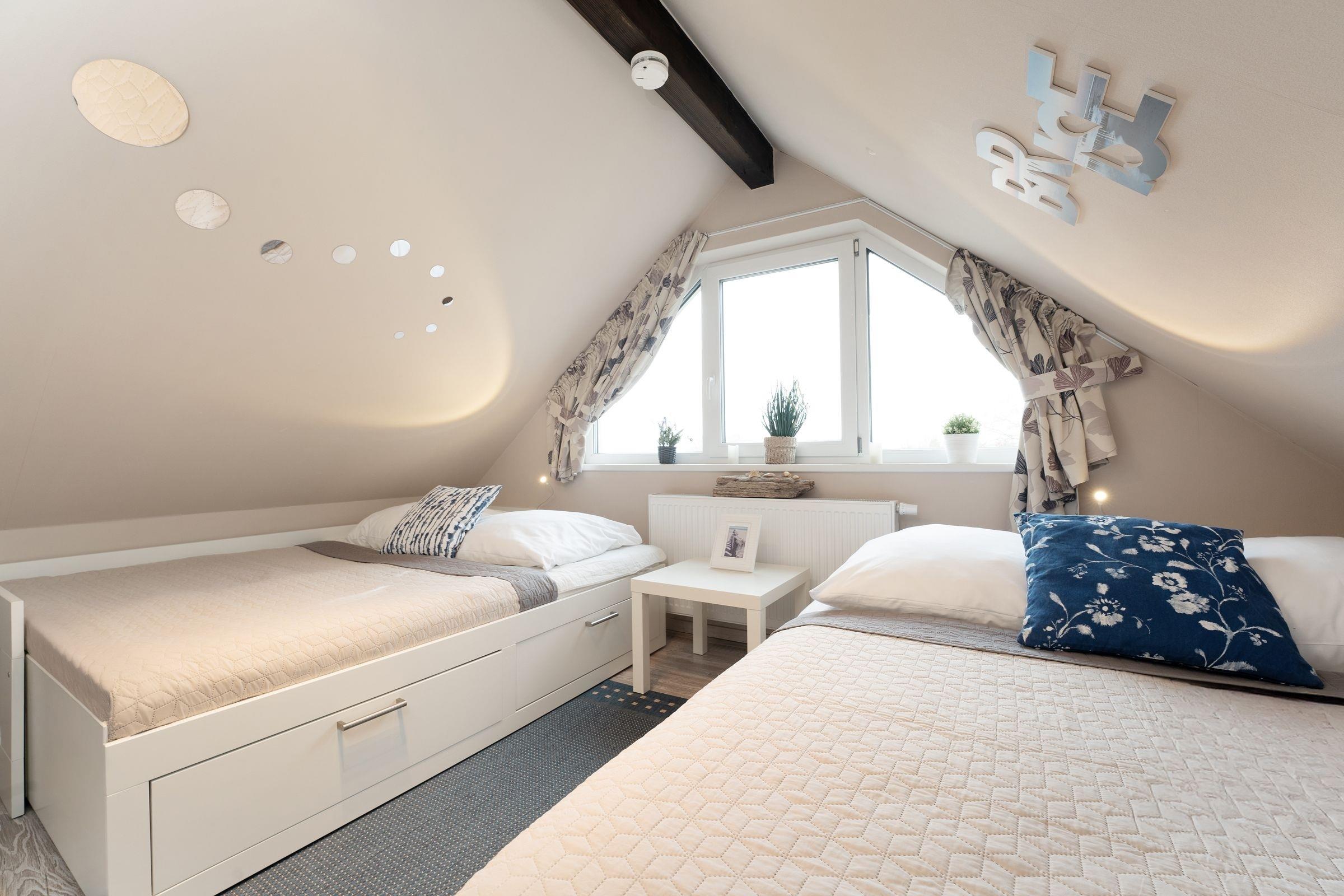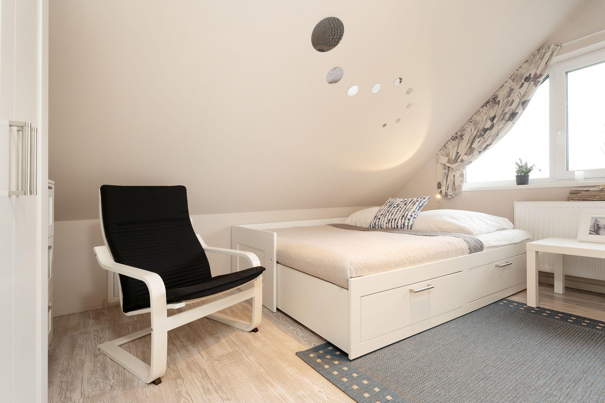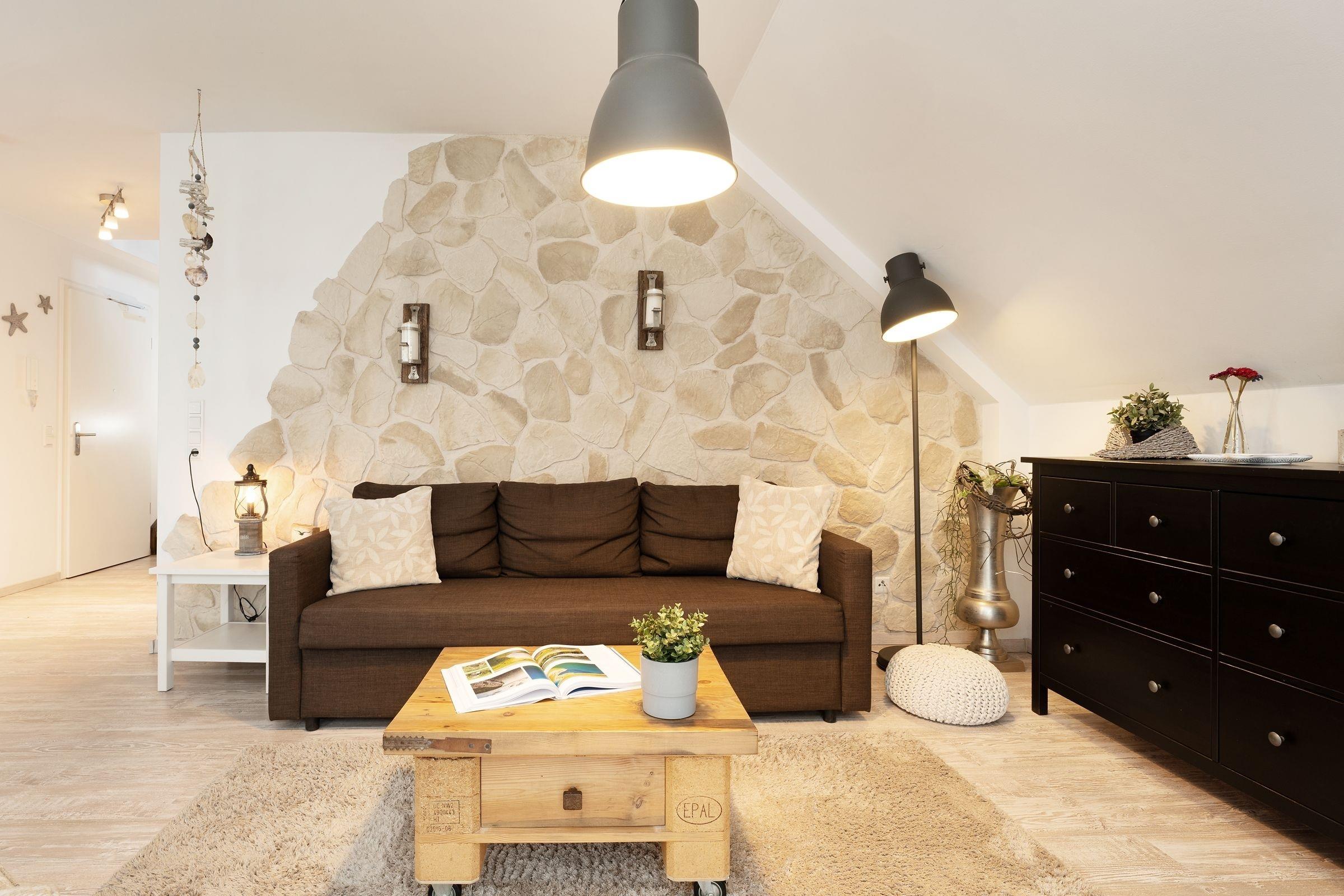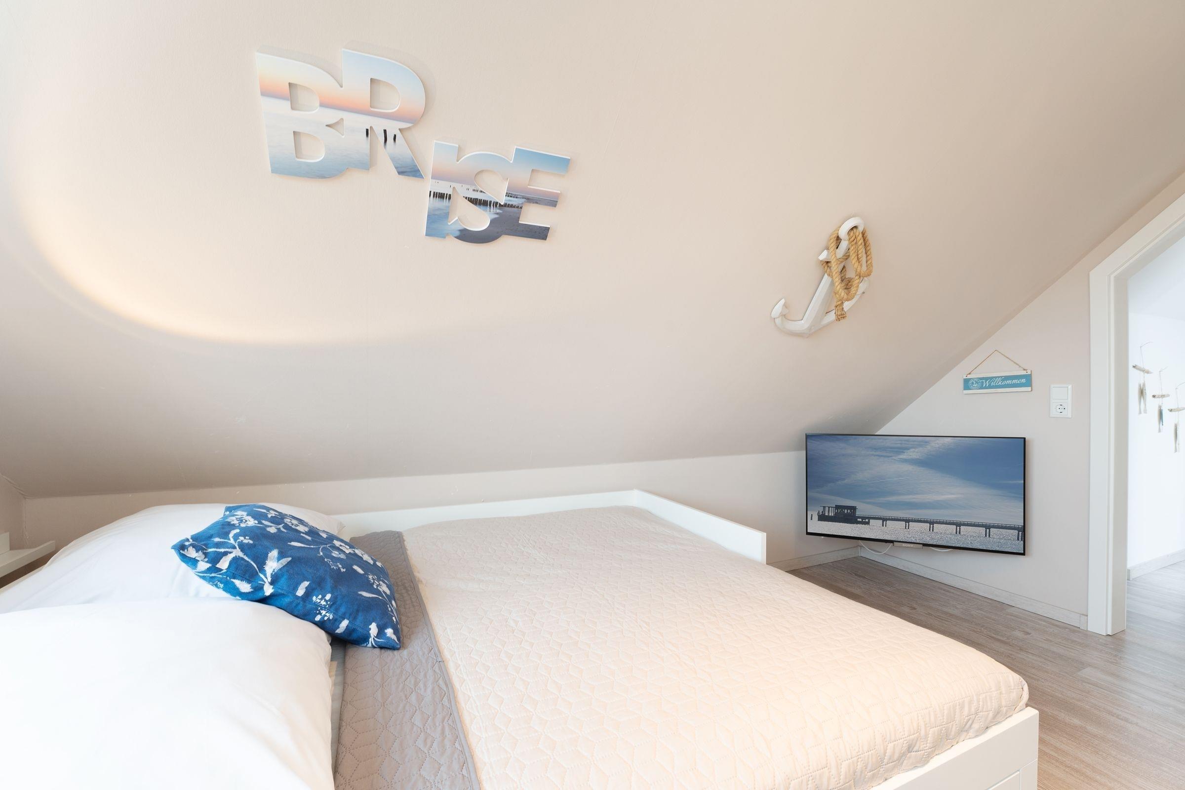 Ankommen ... Auspacken ... Wohlfühlen ... Diese Ferienwohnung erstreckt sich über 2 Ebenen und ist aufgeteilt in einen großzügigen Wohn-/Essbereich mit TV und Zugang zur 21 m² großen Dachterrasse mit Strandkorb - hier können Sie herrlich entspannen! Die Einbauküche ist zum Wohnbereich hin offen gestaltet und mit Backofen, Mikrowelle, Geschirrspüler, Kühlschrank, Kaffeemaschine, Toaster etc. ausgestattet. Ein Schlafzimmer verfügt über ein Doppelbett (2x 90x200 cm) und zusätzlichen TV, das zweite Schlafzimmer befindet sich in der oberen Etage und hat 2 Einzelbetten, die beide zu Doppelbetten (Liegefläche ca. 160x200 cm) ausgezogen werden können. Das moderne Bad mit WC und bodentiefer Dusche rundet das Angebot ab.