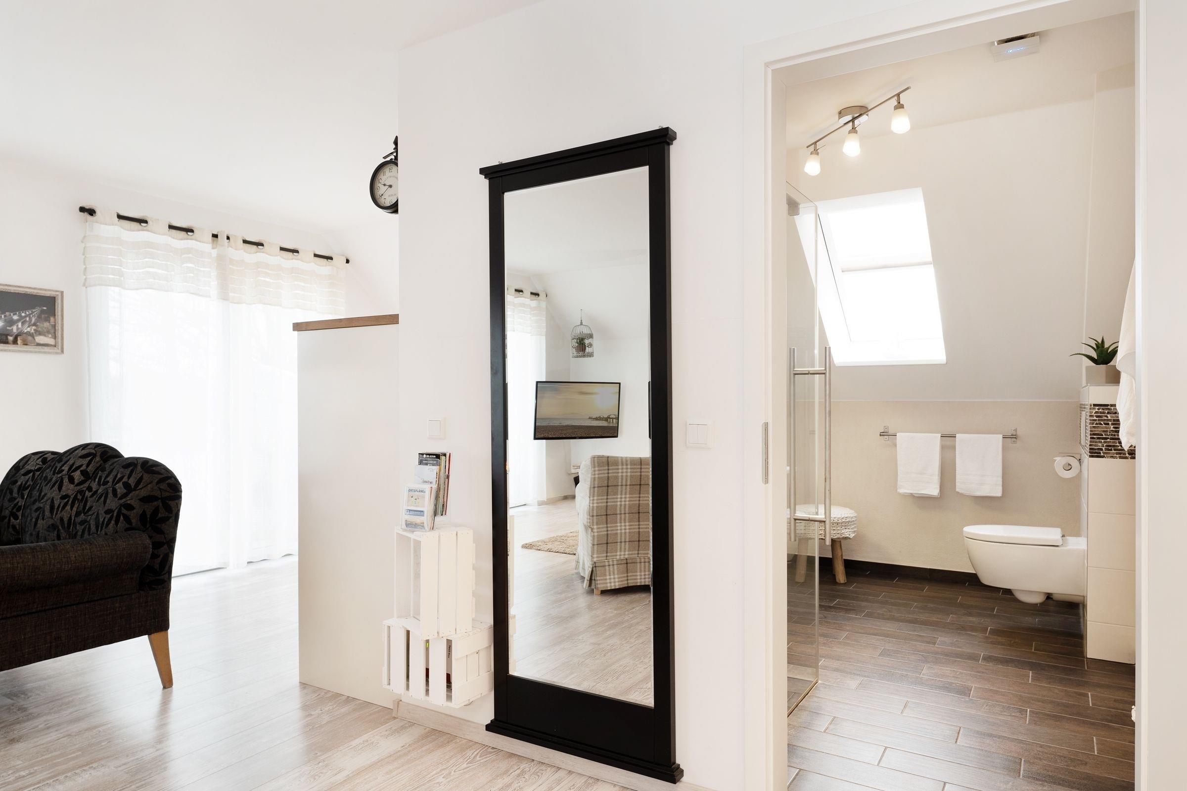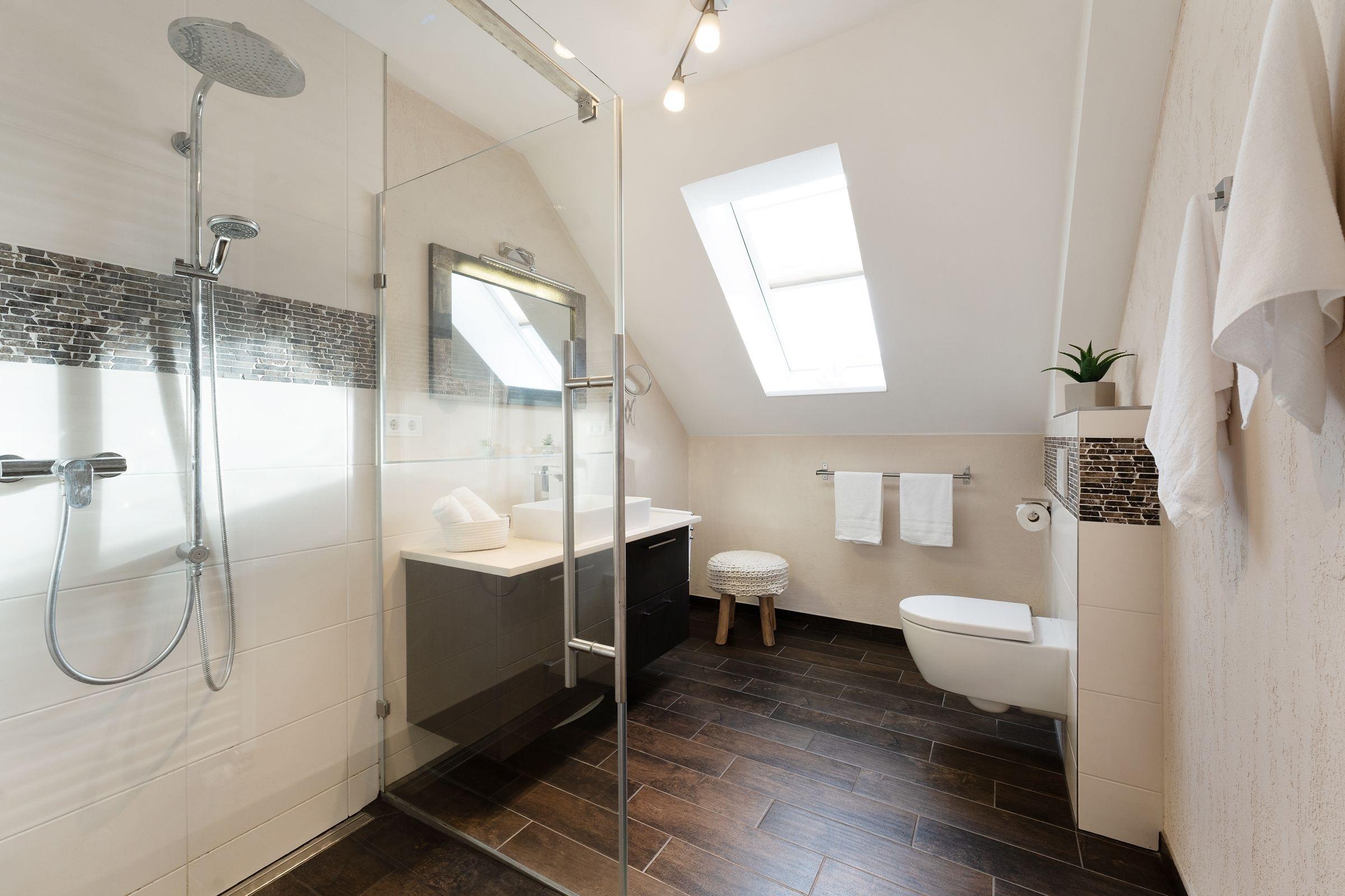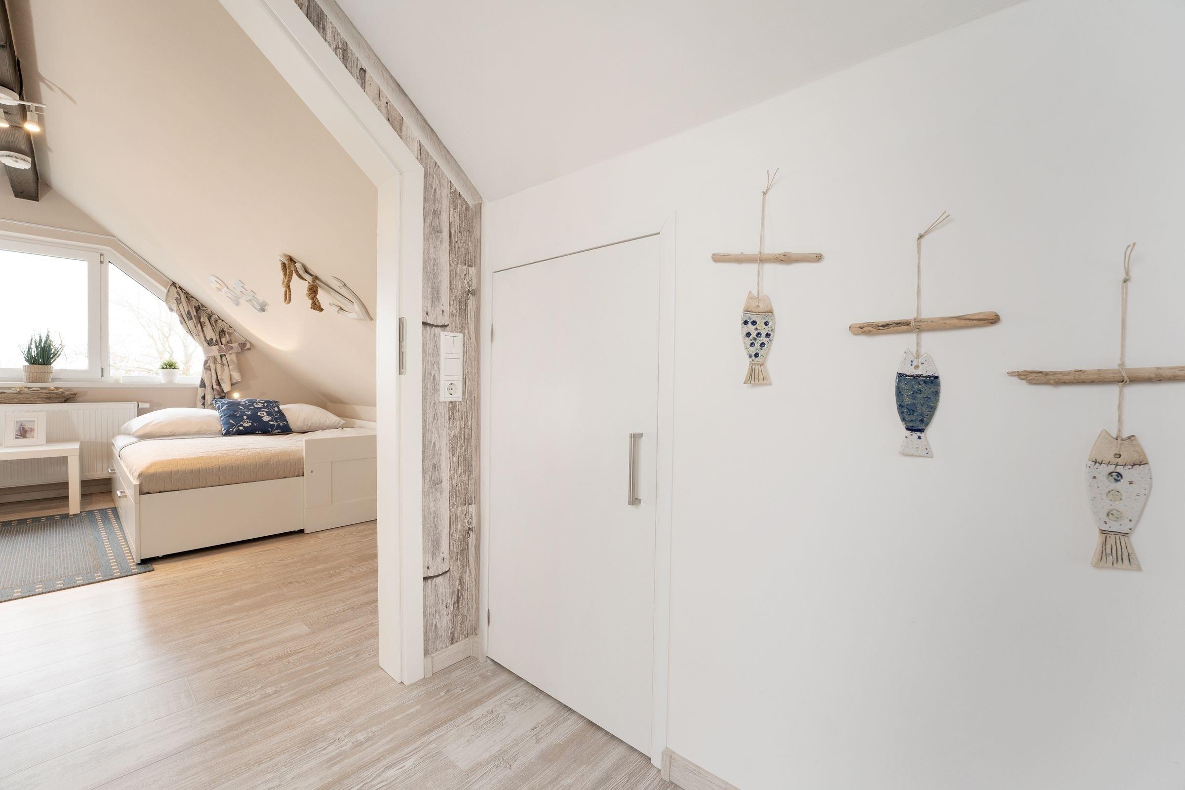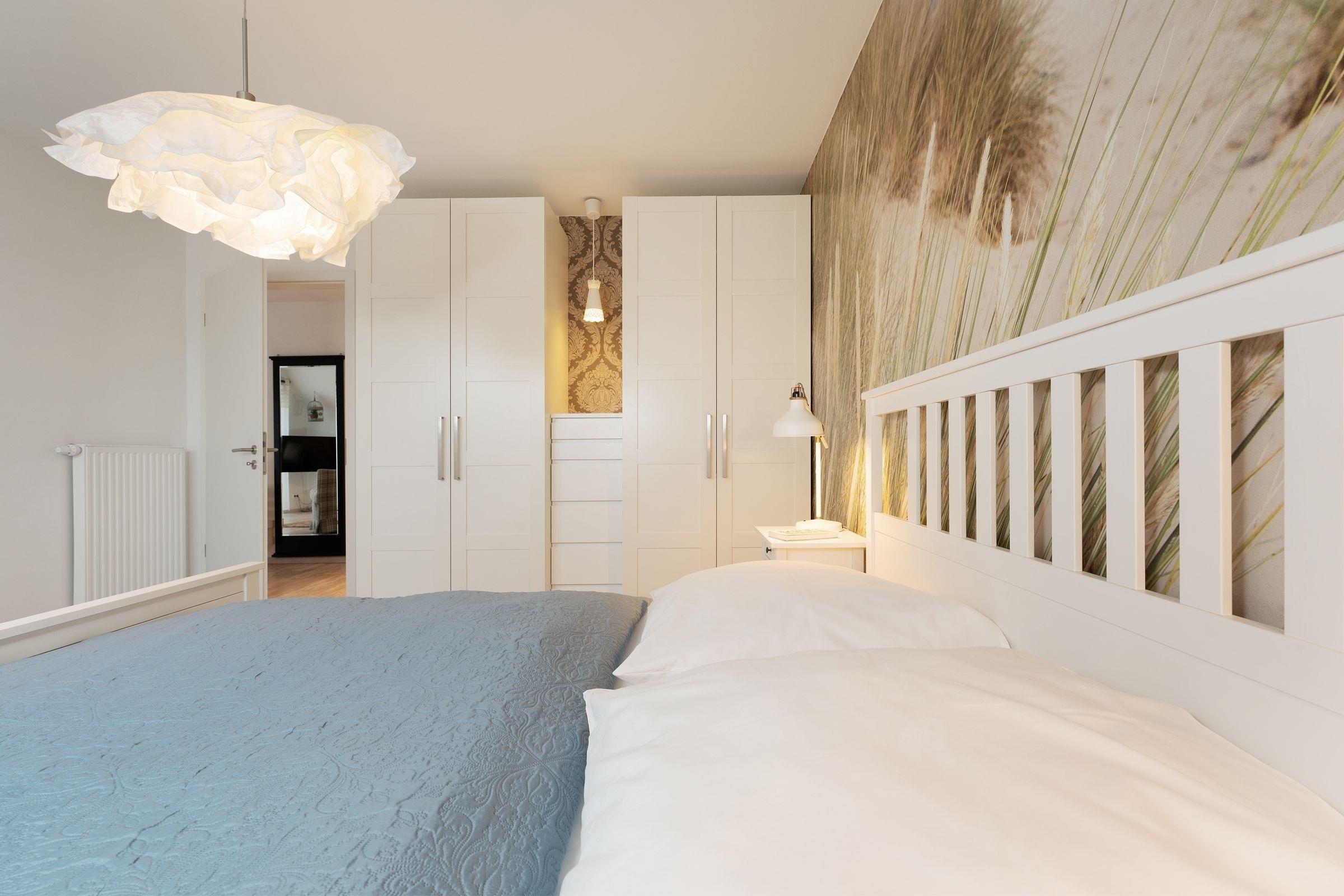 Ankommen ... Auspacken ... Wohlfühlen ... Diese Ferienwohnung erstreckt sich über 2 Ebenen und ist aufgeteilt in einen großzügigen Wohn-/Essbereich mit TV und Zugang zur 21 m² großen Dachterrasse mit Strandkorb - hier können Sie herrlich entspannen! Die Einbauküche ist zum Wohnbereich hin offen gestaltet und mit Backofen, Mikrowelle, Geschirrspüler, Kühlschrank, Kaffeemaschine, Toaster etc. ausgestattet. Ein Schlafzimmer verfügt über ein Doppelbett (2x 90x200 cm) und zusätzlichen TV, das zweite Schlafzimmer befindet sich in der oberen Etage und hat 2 Einzelbetten, die beide zu Doppelbetten (Liegefläche ca. 160x200 cm) ausgezogen werden können. Das moderne Bad mit WC und bodentiefer Dusche rundet das Angebot ab.