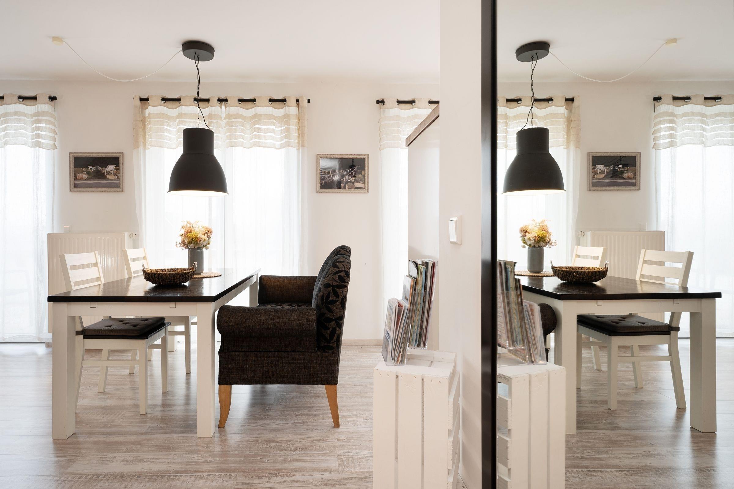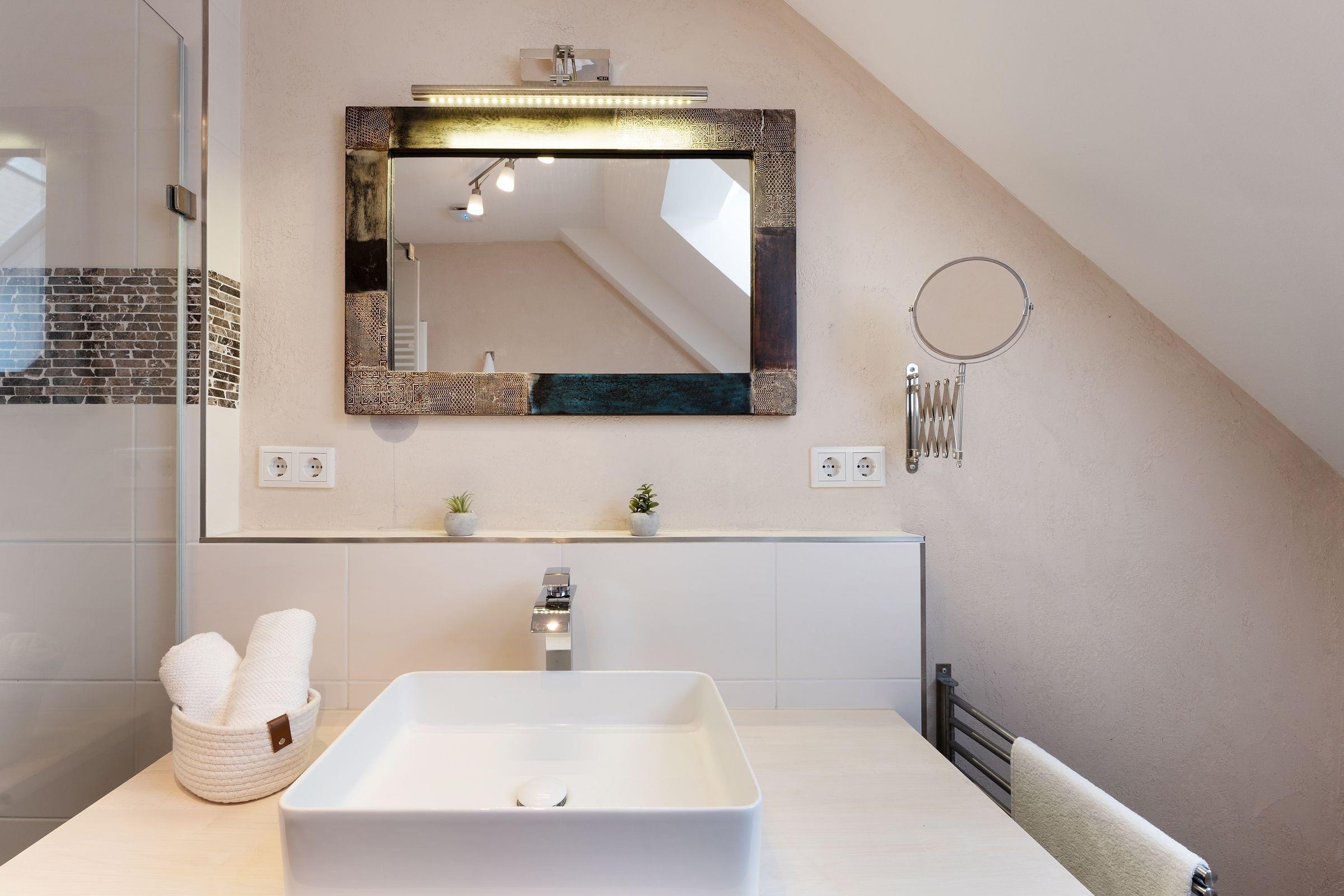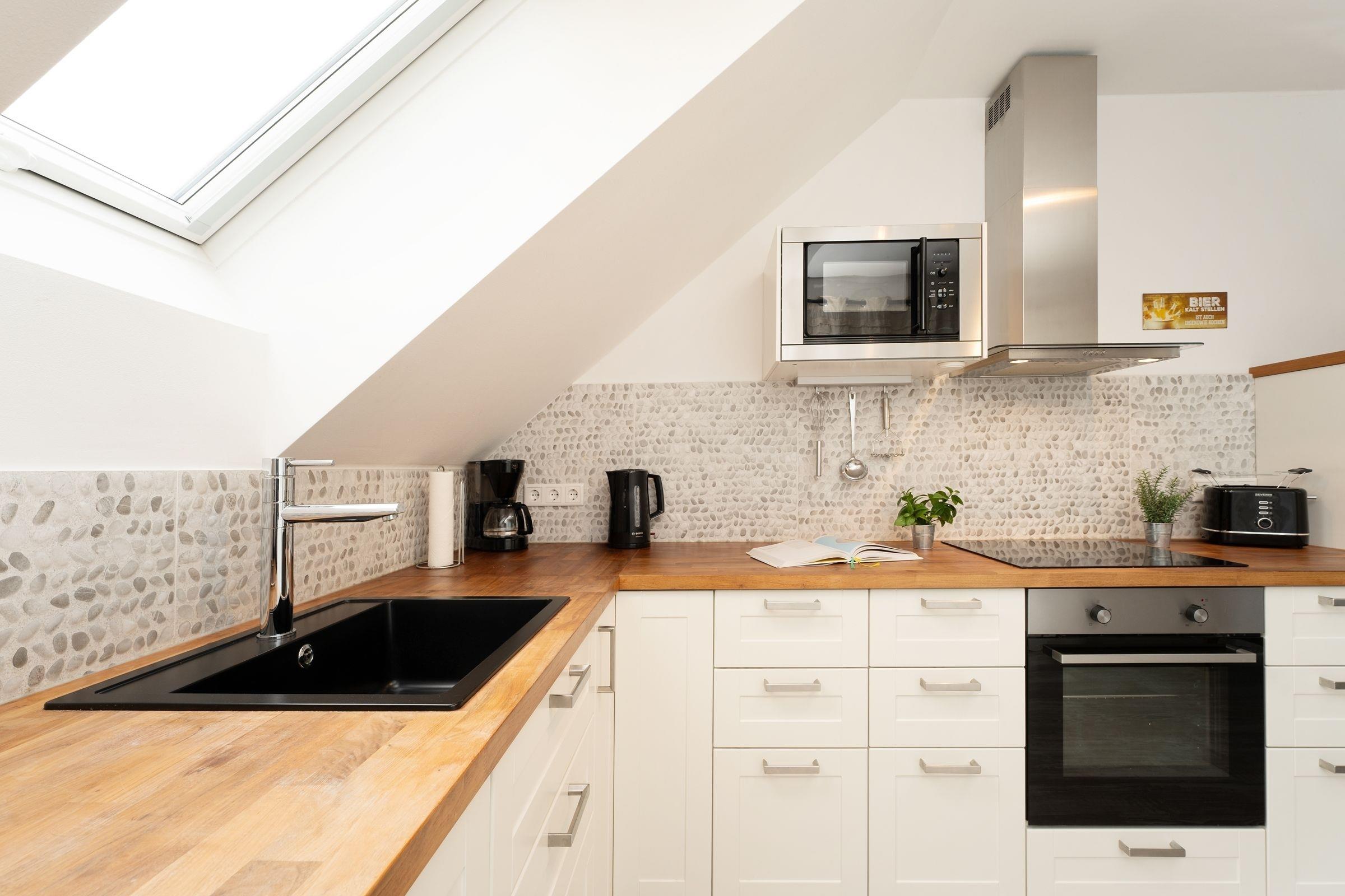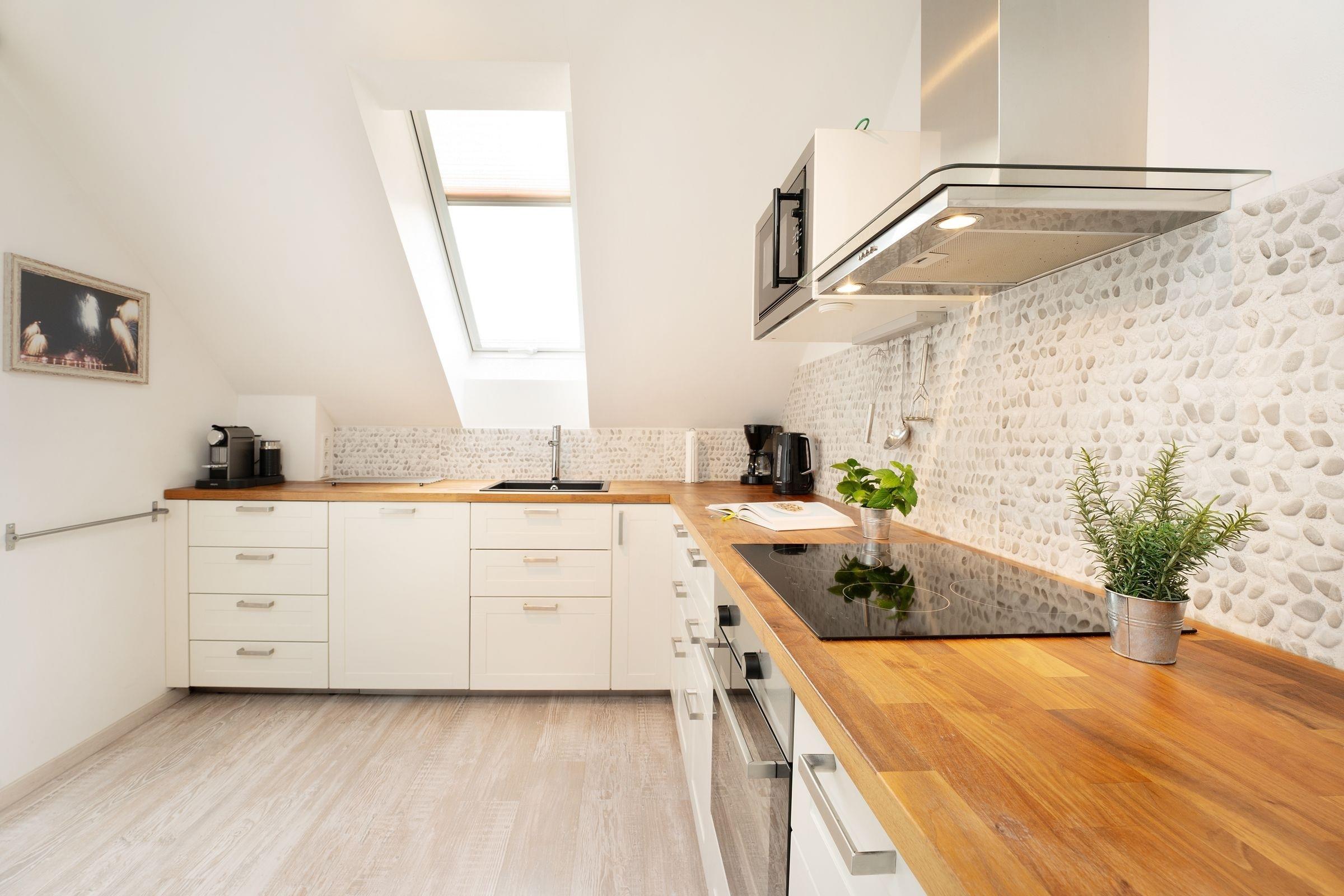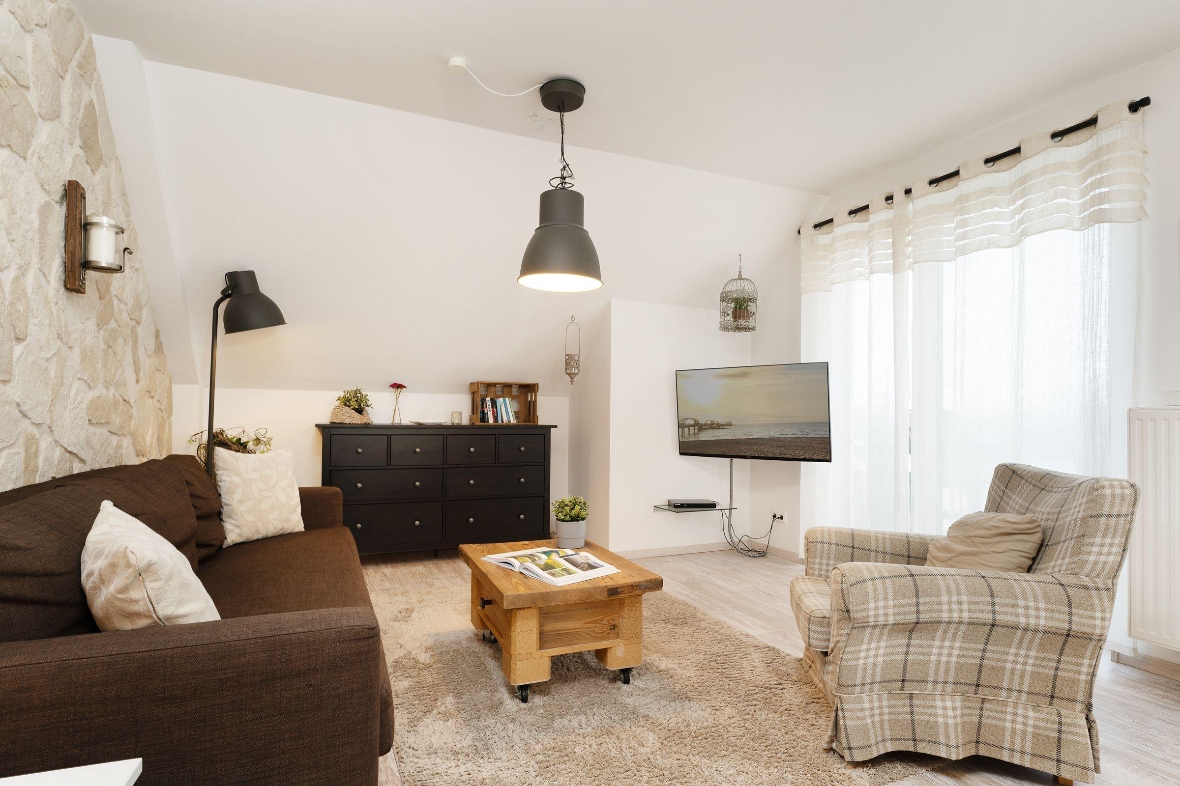 Ankommen ... Auspacken ... Wohlfühlen ... Diese Ferienwohnung erstreckt sich über 2 Ebenen und ist aufgeteilt in einen großzügigen Wohn-/Essbereich mit TV und Zugang zur 21 m² großen Dachterrasse mit Strandkorb - hier können Sie herrlich entspannen! Die Einbauküche ist zum Wohnbereich hin offen gestaltet und mit Backofen, Mikrowelle, Geschirrspüler, Kühlschrank, Kaffeemaschine, Toaster etc. ausgestattet. Ein Schlafzimmer verfügt über ein Doppelbett (2x 90x200 cm) und zusätzlichen TV, das zweite Schlafzimmer befindet sich in der oberen Etage und hat 2 Einzelbetten, die beide zu Doppelbetten (Liegefläche ca. 160x200 cm) ausgezogen werden können. Das moderne Bad mit WC und bodentiefer Dusche rundet das Angebot ab.