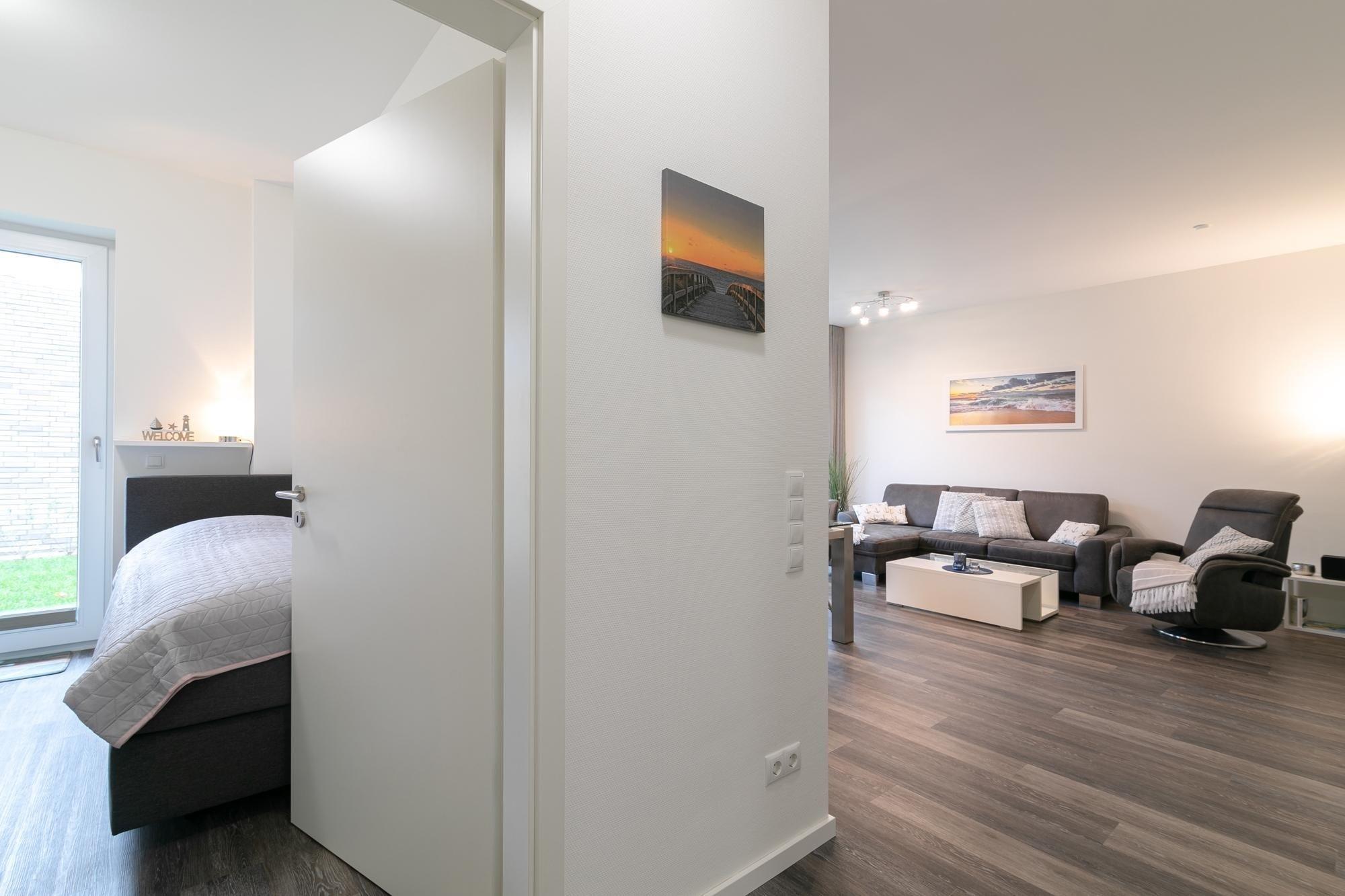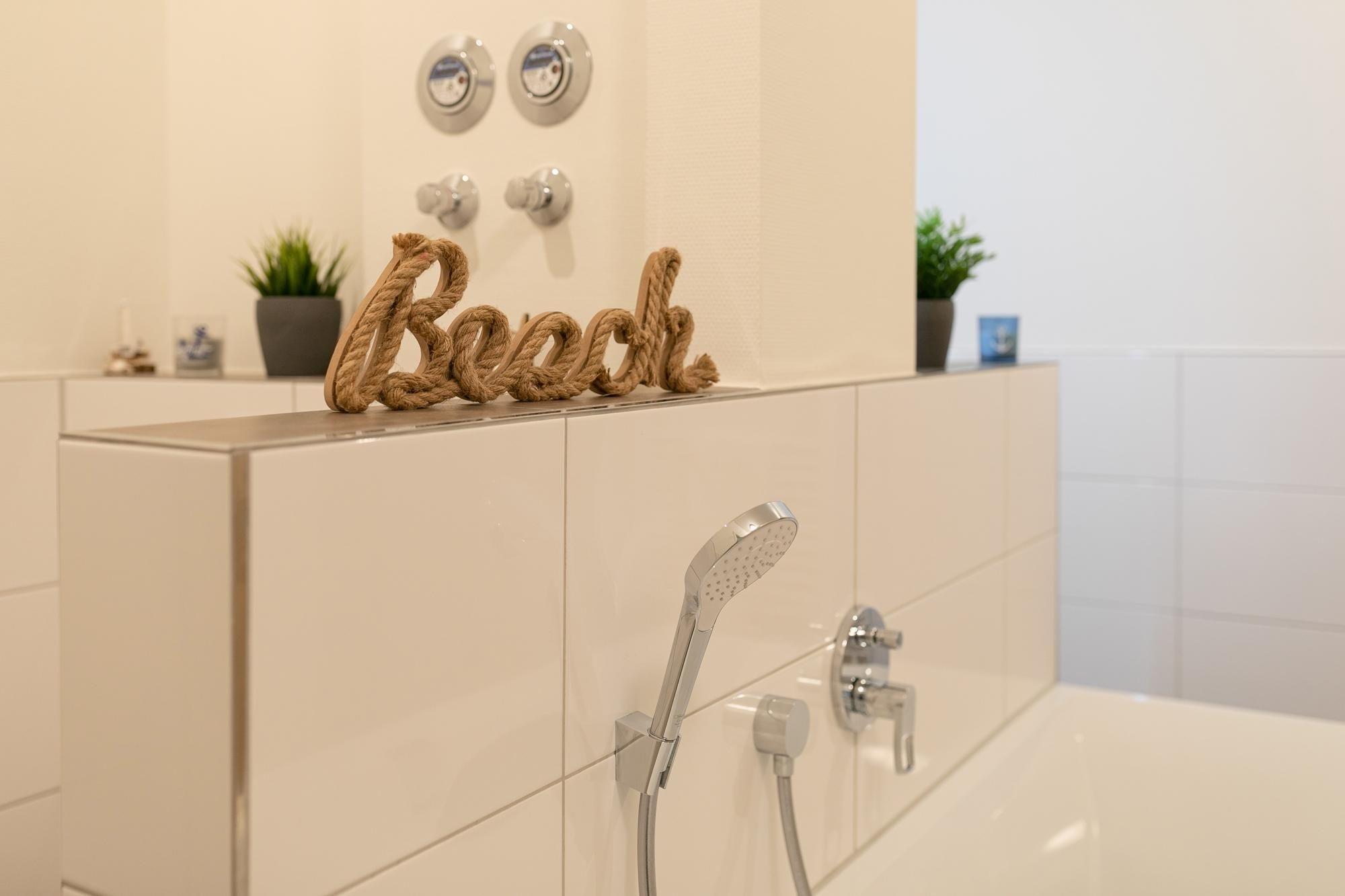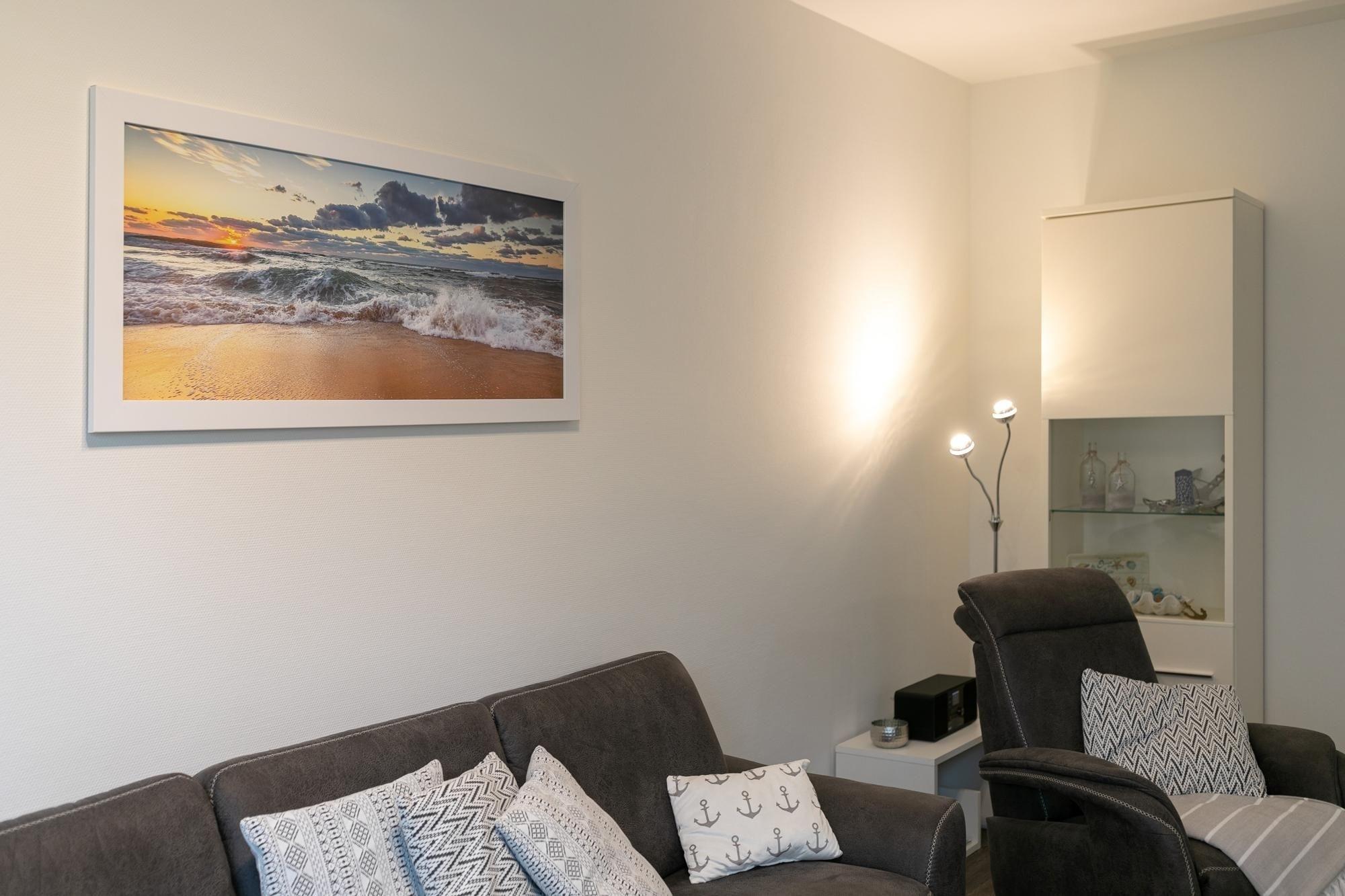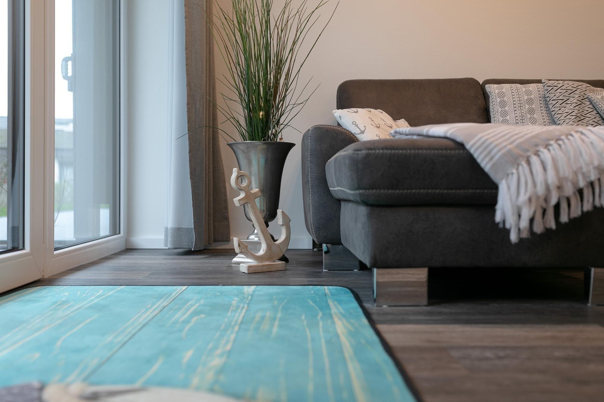 Ankommen, auspacken und sich wohlfühlen. Die moderne Wohnung Ankerplatz besticht durch ihre edle Ausstattung im maritimen Look. Hier fühlt man sich sofort wie im Urlaub. Genießen Sie den großzügigen Wohn-/Essbereich. Von der kuscheligen Sofa-Landschaft und auch von der schicken Sitzecke aus haben Sie einen Blick auf das TV-Gerät, was durchaus praktisch sein kann. Doch wenn man ehrlich ist, ist es doch draußen an der frischen Luft immer noch am schönsten: Zum gemütlichen Verweilen lädt die großzügige Terrasse ein. Lassen Sie hier den Abend bei guten Gesprächen ausklingen. Ein Grill sorgt dabei für eine kulinarische Abwechslung. Die moderne Küche mit Spülmaschine ist gut ausgestattet und im Wohnbereich integriert. Wunderbar träumen werden Sie sicher in den beiden Schlafräumen. Ein Zimmer verfügt über ein Boxspringbett (2x 90x200 cm) mit durchgängigem Topper, das zweite über 2 Einzel-Boxspringbetten (je 90x200 cm) – in beide Schlafzimmern steht jeweils ein TV-Gerät. Das großzügige Bad mit Sauna und Whirlwanne bietet auch an kälteren Tagen Wärme und Entspannung. Zusätzlich gibt es ein Gäste-WC sowie einen kleinen Abstellraum mit Waschmaschine. Ein bequemes Plus ist der Personenaufzug im Hause.