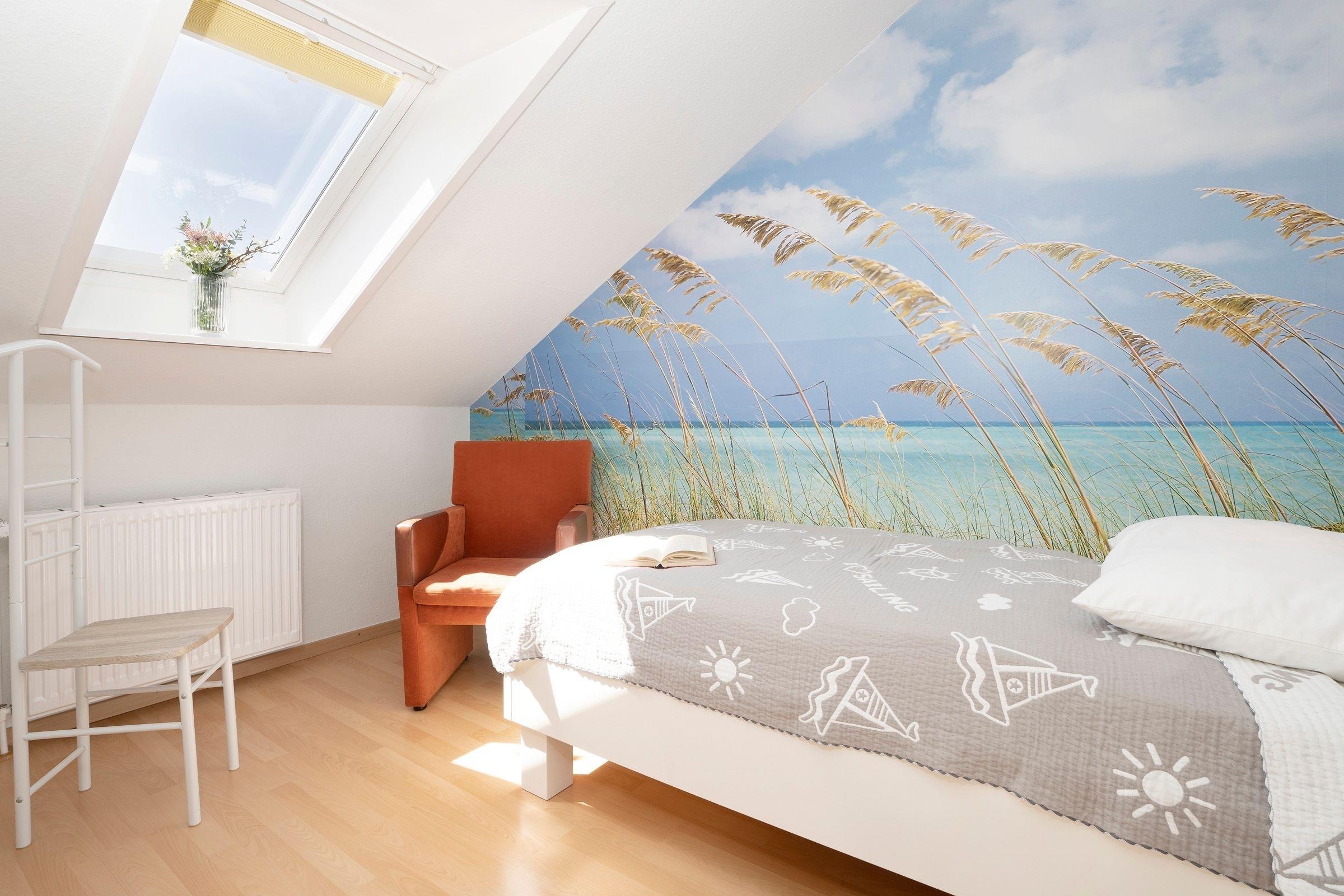 Klein und fein – ein schöner Ort zum Wohlfühlen. Die charmante Dachgeschosswohnung befindet sich im Apartmenthaus Im Sonnenwinkel und bietet auf kleinem Raum alles, was es für einen wunderbaren Urlaub braucht. Ein kuscheliges Sofa im Wohn-/Ess-Bereich empfängt Sie und verspricht Ihnen gemütliche Abende vor dem TV-Gerät. Bei schönem Wetter lockt natürlich der möblierte Balkon, der nach Süden ausgerichtet ist. Aber auch wenn die Sonne einmal nicht so lacht, sitzen Sie hier gut geschützt und können Ihre freie Zeit wunderbar genießen und entspannen. Das wird bestimmt Ihr neuer Lieblingsplatz. Wie wäre es hier mit einem guten Buch? Zurück im Wohnbereich präsentiert sich eine gut ausgestattete Küche – und in einer freundlichen Nische befindet sich eine kleine Ess-Ecke. Durch die Dachschrägen wirkt der Raum wunderbar gemütlich. Für die Nachtruhe geht es ins Schlafzimmer mit schicker Foto-Tapete. In dem Einzelbett (90x200 cm) werden Sie sicher gut nächtigen. In dem modernen Duschbad gleich um die Ecke können Sie perfekt in den Tag starten. Praktisch: Eine Waschmaschine und ein Trockner stehen Ihnen im Haus kostenfrei zur Verfügung.