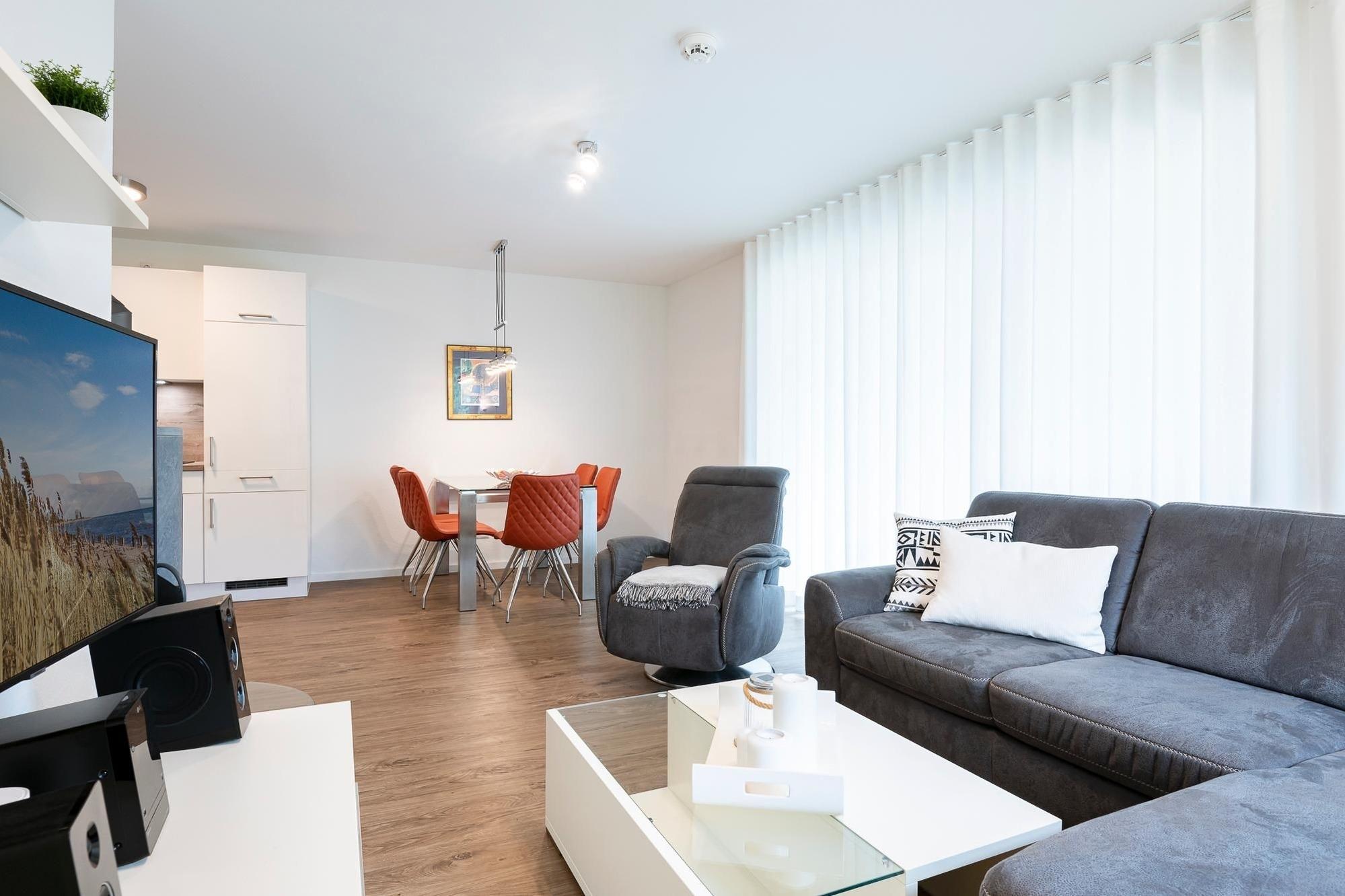 Herzlich willkommen – in dieser komfortablen Wohnung werden Sie sich sofort wohlfühlen. Hier treffen großzügige Räumlichkeiten auf guten Geschmack. Der lichtdurchflutete Wohnbereich begrüßt Sie mit einer kuscheligen Sofalandschaft. Entspannen Sie hier vor dem TV-Gerät mit DVD-Player oder lauschen Sie an kühleren Tagen dem Feuer im Kaminofen. Direkt hinter der Couch können Sie die großzügige, überdachte Terrasse mit Süd-Ausrichtung betreten. Genießen Sie Ihre Auszeit im gemütlichen Strandkorb oder nehmen Sie in der Sitzecke Platz. Wie wäre es mit einem guten Buch? Die zum Wohnraum hin offen gestaltete, moderne Küche verfügt über nette Annehmlichkeiten wie einer Nespresso-Maschine sowie einem Geschirrspüler. Ihre Speisen können Sie in der schicken Essecke zu sich nehmen. Für die Nacht stehen Ihnen zwei Schlafräume zur Verfügung: Ein Zimmer ist mit einem Boxspringbett (180x200 cm) sowie einem zusätzlichen TV-Gerät ausgestattet. In dem anderen Zimmer steht ein Etagenbett (je 90x200 cm). Das großzügige, tageslichthelle Duschbad mit Sauna bietet auch an kälteren Tagen Wärme und Entspannung .