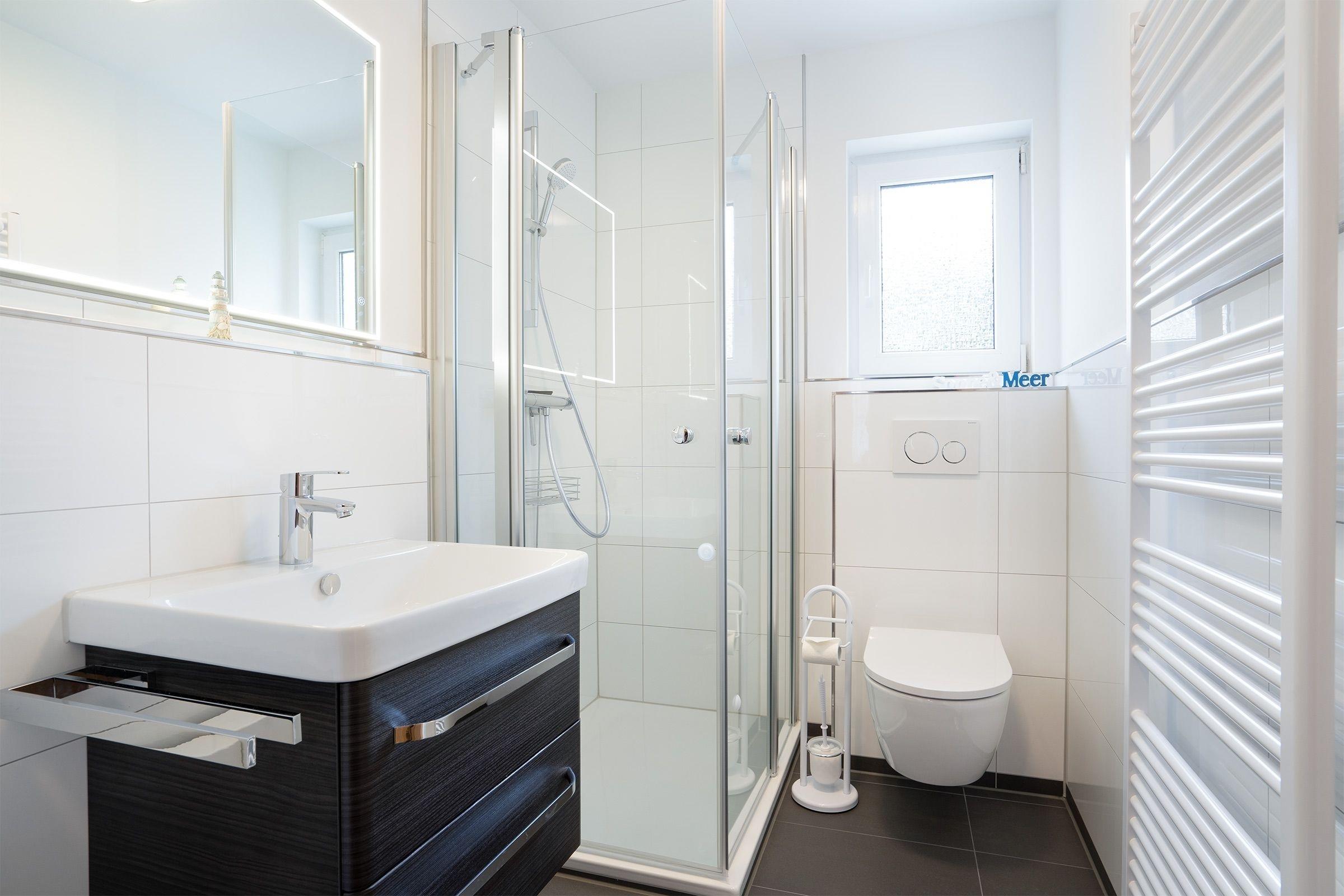 Der Wohn-/Schlafbereich ist mit hochwertiger Schlafcouch (Liegefläche ca. 120x200 cm, zwei Matratzen) möbliert, für Unterhaltung sorgen CD-Player, Radio, ein kostenfreier WLAN-Anschluss und TV. Die integrierte Küche ist mit Annehmlichkeiten wie 4-Platten-Ceranherd, Backofen, Kühlschrank mit Gefrierfach und Mikrowelle ausgestattet, die Spülmaschine erledigt den Abwasch. Eins der separaten Schlafzimmer ist mit bequemem Doppelbett (2x90x200cm) und Kleiderschrank ausgestattet, hier ist bei Bedarf auch Platz für ein Kinderreisebettchen. Das andere separate Schlafzimmer bietet mit zwei getrennt stehenden Einzelbetten (2x80x200cm) ebenfalls zwei Schlafplätze, auch hier nimmt der Kleiderschrank problemlos Ihre Urlaubsgarderobe auf. Verdunklungsmöglichkeiten bestehen im Wohn-/Schlafraum mit Vorhängen, in den Schlafzimmer mit Außenjalousien. Das tageslichthelle Badezimmer ist mit Dusche, Waschbecken und WC ausgestattet, des Weiteren steht zusätzlich ein Gäste-WC zur Verfügung.