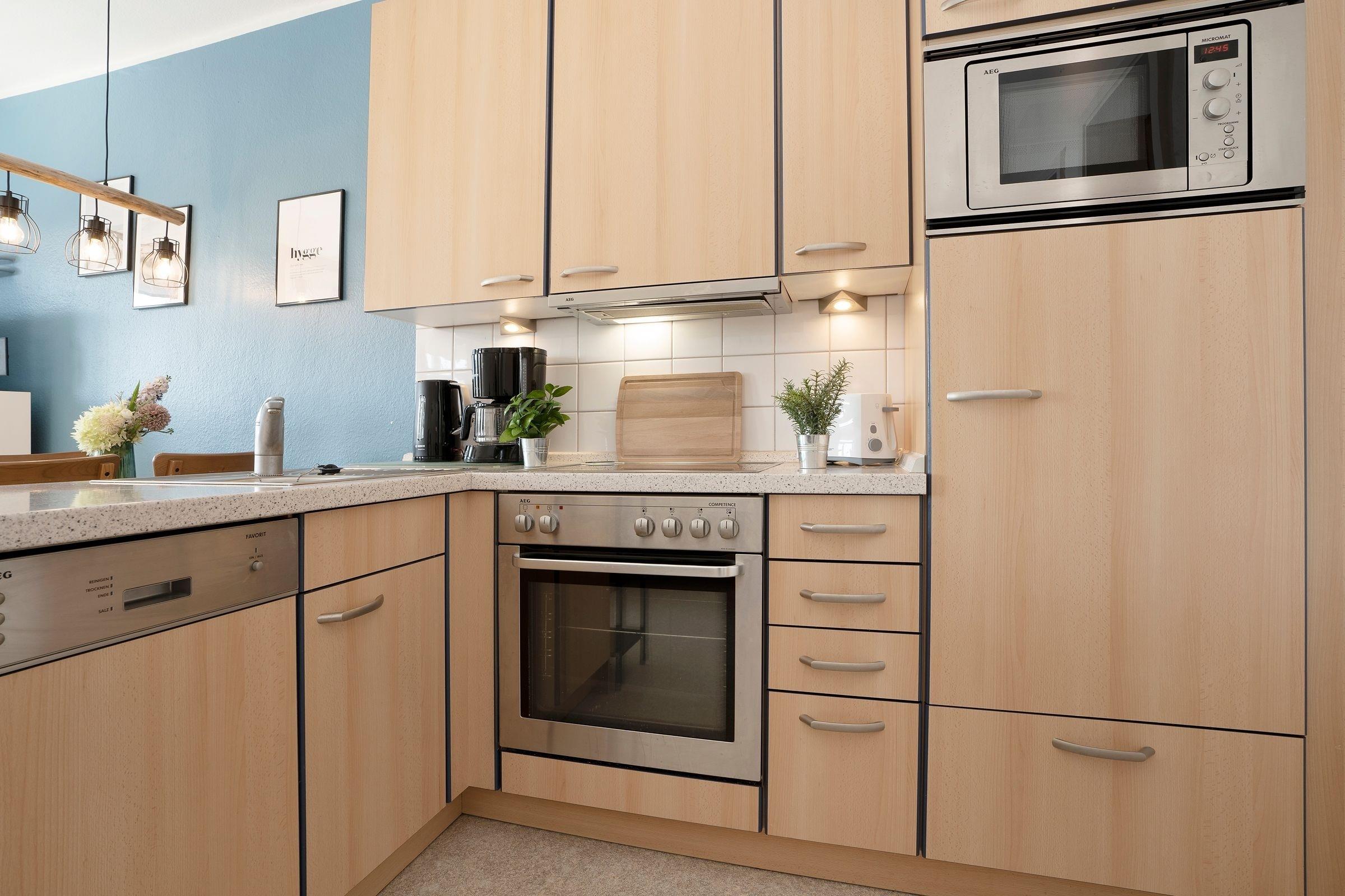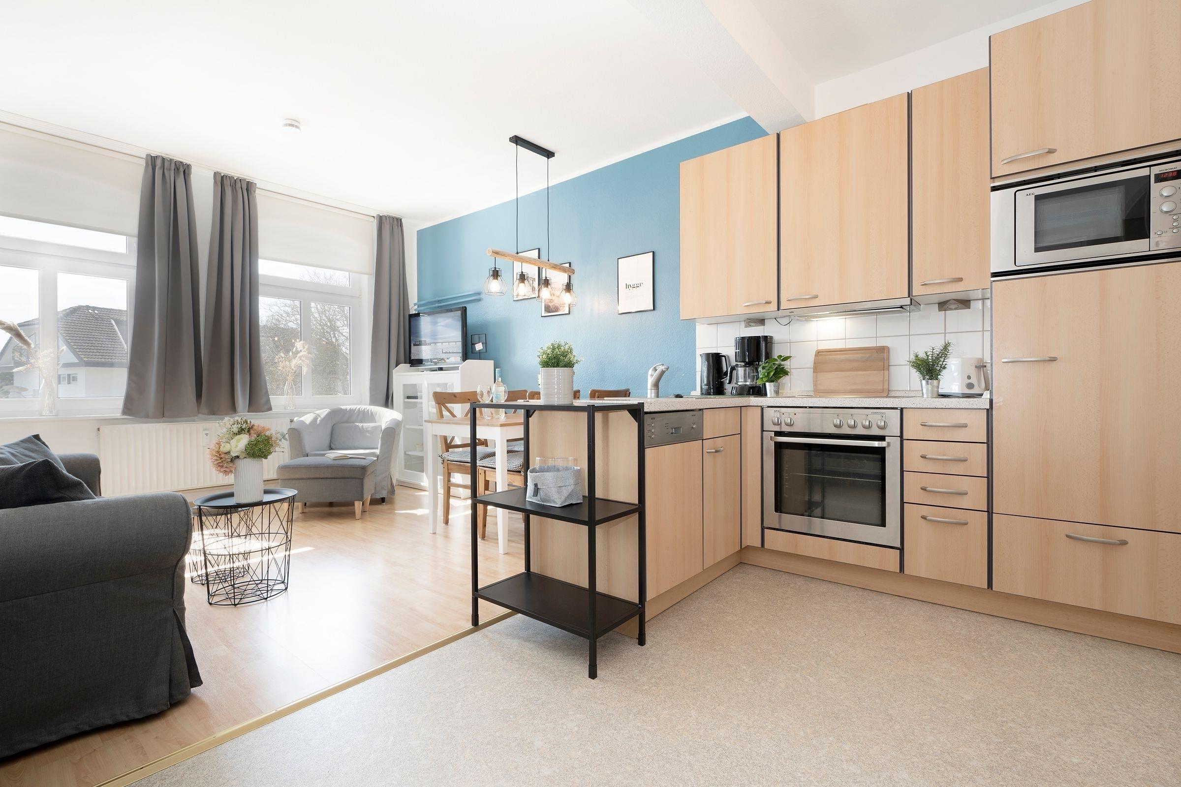 Klein und fein – durch ein durchdachtes Wohnkonzept punktet die Wohnung Strandoase in der gepflegten Wohnanlage Villa Hoffnung. Im Wohn- und Essbereich erwartet Sie eine komfortable Sitz-Ecke mit TV-Gerät sowie eine gemütliche Ess-Ecke. Die gut ausgestattete Küche mit Geschirrspüler ist offen gestaltet und bietet sämtliche Annehmlichkeiten, die ein Hobby-Koch im Urlaub braucht. Ein kleiner Tresen fungiert als Raumteiler und sorgt so für eine angenehme Atmosphäre. Nach einem herrlichen Urlaubstag an der Ostseeküste stehen Ihnen für die Nacht 3 Schlafräume zur Verfügung: In einem Zimmer befindet sich eine Schlafcouch (ca. 140x200 cm) für eine Person und in einem weiteren Zimmer steht ein bequemes Doppelbett (2x 90x200 cm). Von hier aus haben Sie Zugang zu einem weiteren kleinen Schlafraum mit einem Einzelbett (90x200 cm). Das Duschbad ist modern und komfortabel.