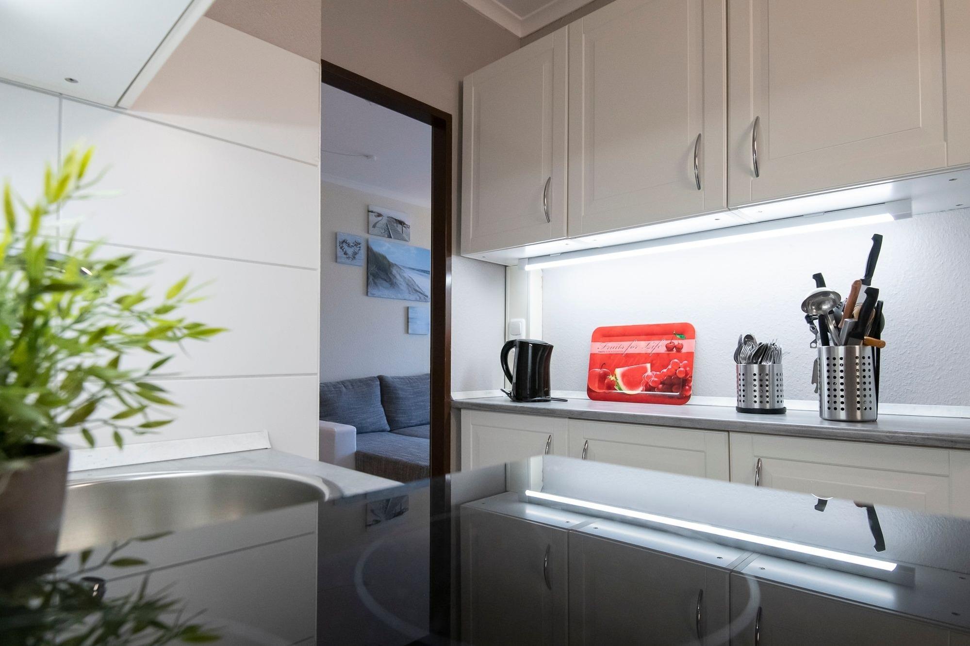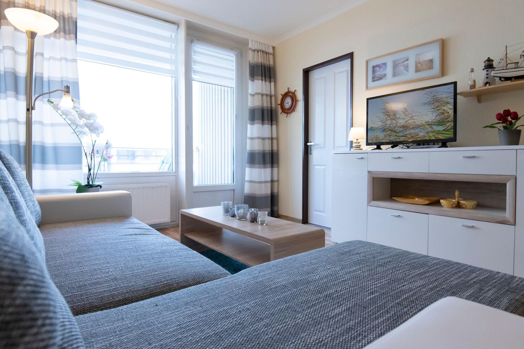 Im behaglichen Wohnbereich können Sie auf dem gemütlichen Sofa entspannt die Füße hochlegen. Für Unterhaltung sorgen der Flachbild-TV, Radio und CD-Player sowie der kostenlose WLAN-Anschluss, über den Sie Ihre Lieblingsmusik streamen. Angrenzend, durch einen Vorhang abgetrennt, befinden sich 2 Einzelbetten (je 90x200 cm). Am Esstisch kann die ganze Familie gesellige Stunden beim Spielen oder Essen verbringen. Vom Wohnbereich aus haben Sie Zugang zum möblierten Balkon, von dem Sie einen seitlichen Meerblick haben. Essen und Trinken hält Geist und Seele zusammen - in der übersichtlichen Küchenzeile finden Sie alles, um sich selbst zu verpflegen. Im separaten Schlafzimmer können 2 Personen im Etagenbett (2x 90x200 cm) und eine weitere Person auf dem ausklappbaren Schlafsessel (90x200 cm) neue Energie für den nächsten Urlaubstag tanken. Im Kleiderschrank finden Sie ausreichend Platz und Stauraum für Ihre Urlaubsgarderobe. Ein hell gefliestes Duschbad rundet die Ausstattung dieser schönen Ferienwohnung ab.