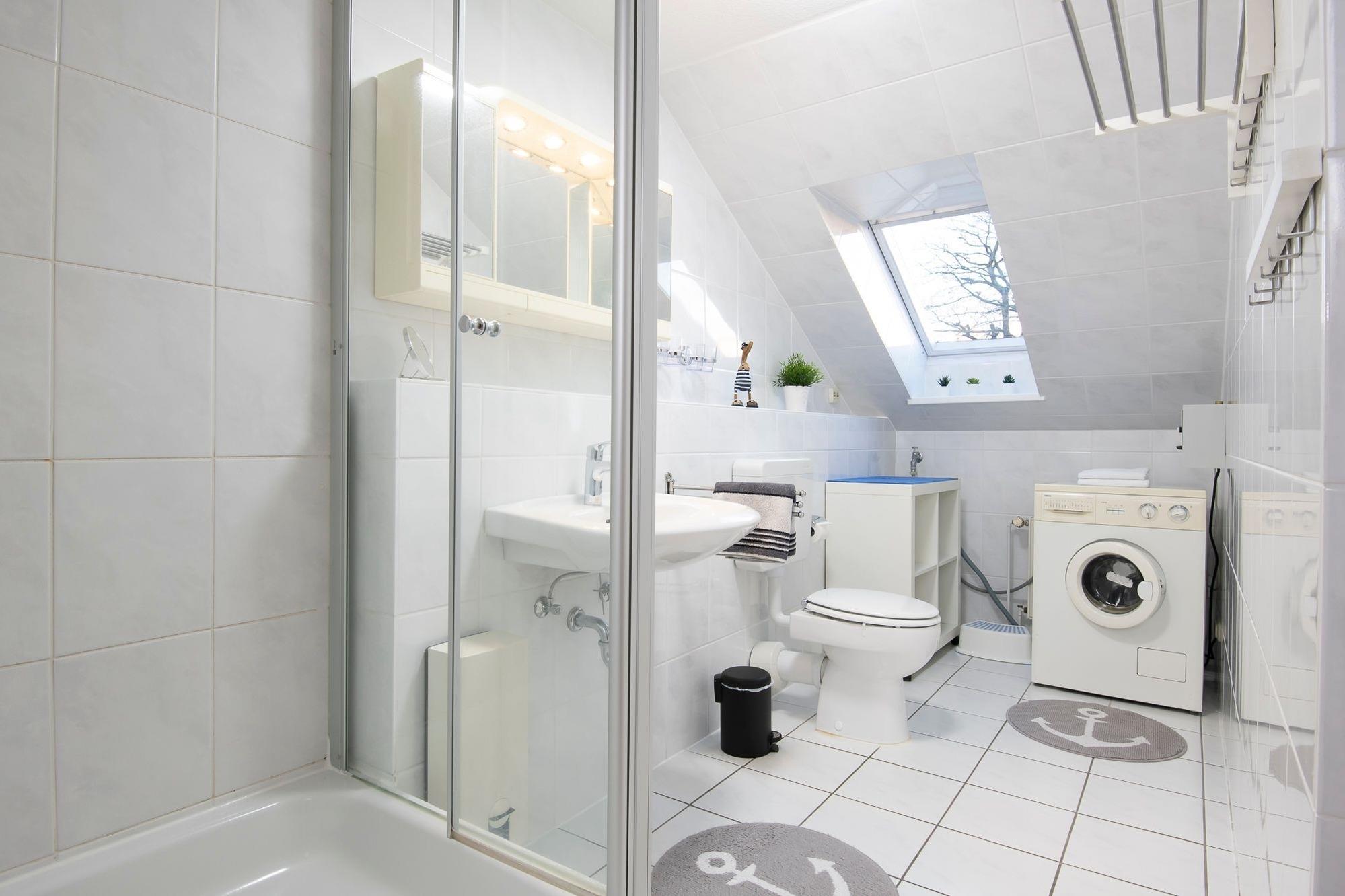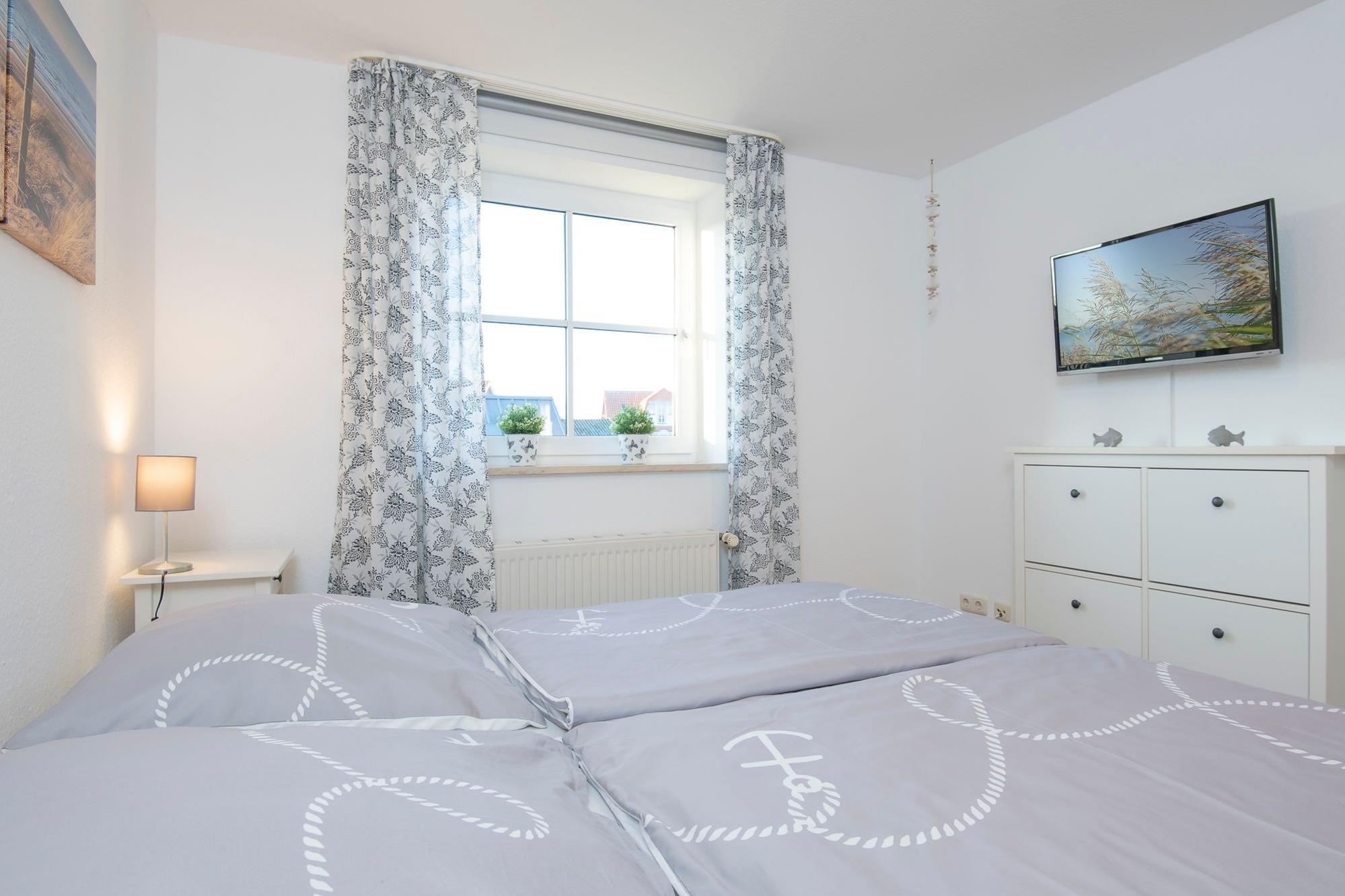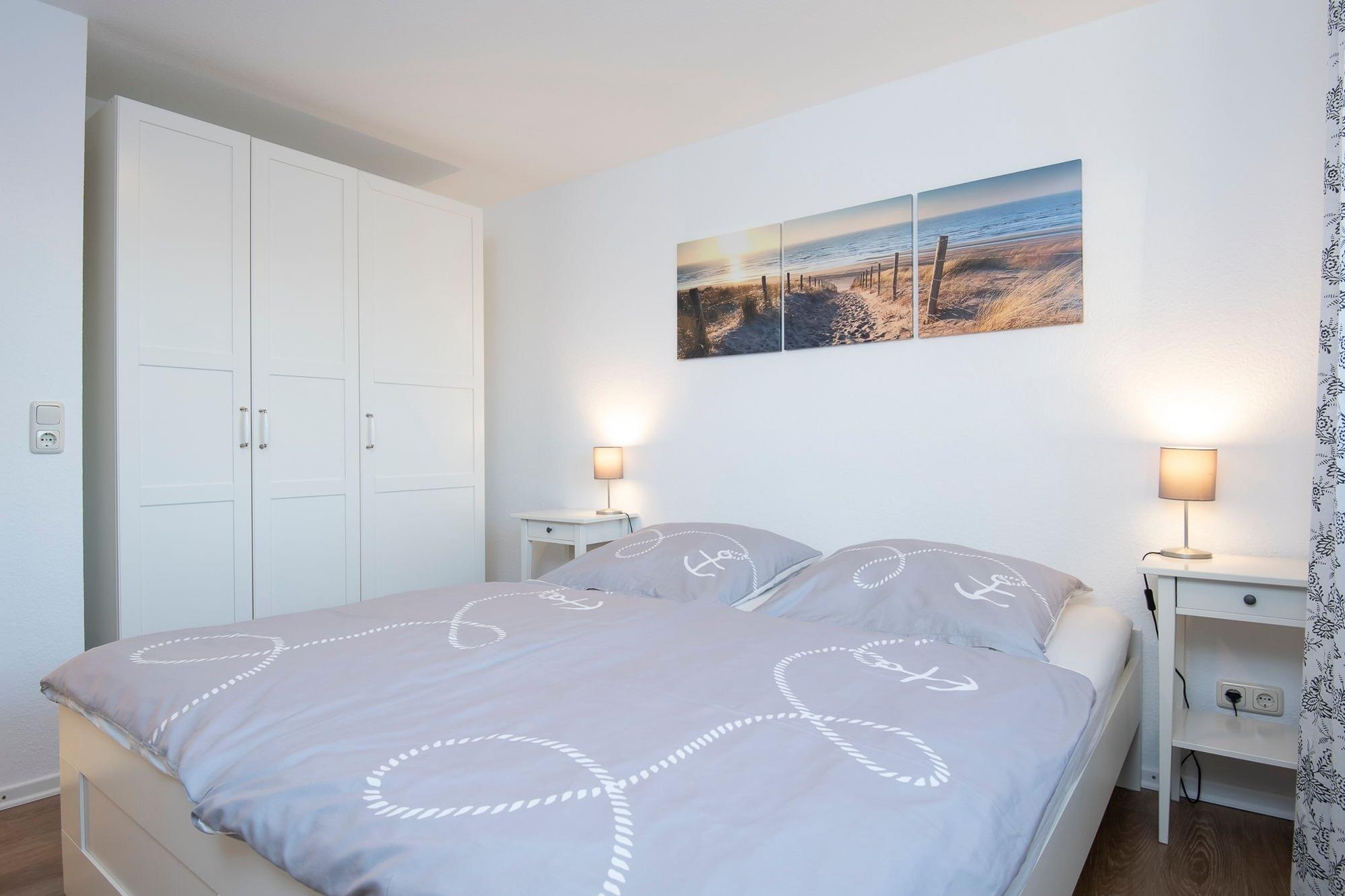 Für erholsame Nächte sorgt in einem der separaten Schlafzimmer ein großes Doppelbett (2x 90x200 cm). Auch hier befindet sich ein TV-Gerät und ein Kleiderschrank, in dem Sie mühelos Ihre Urlaubsgarderobe verstauen können. Das zweite separate Schlafzimmer ist besonders liebevoll und durchdacht gestaltet. Hier werden sich kleine Gäste in zwei Einzelbetten (je 80x200 cm), einem Kinderbett, Kleiderschrank und viel Platz zum Spielen und Malen besonders wohl fühlen. Im Tageslichtduschbad können Sie nach einem langen Strandtag eine erfrischende Dusche nehmen und auch eine Waschmaschine (gegen Gebühr) ist vor Ort.