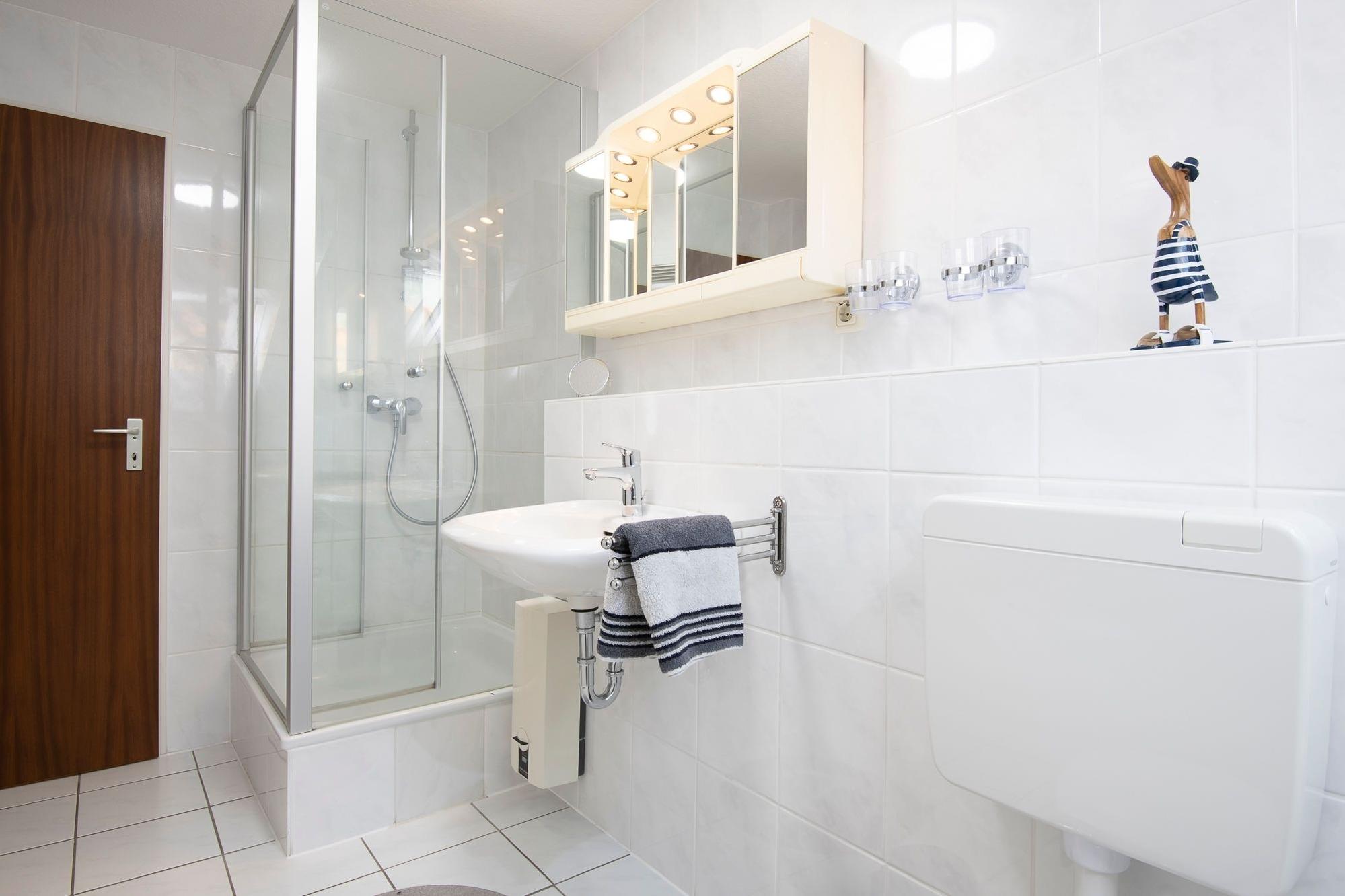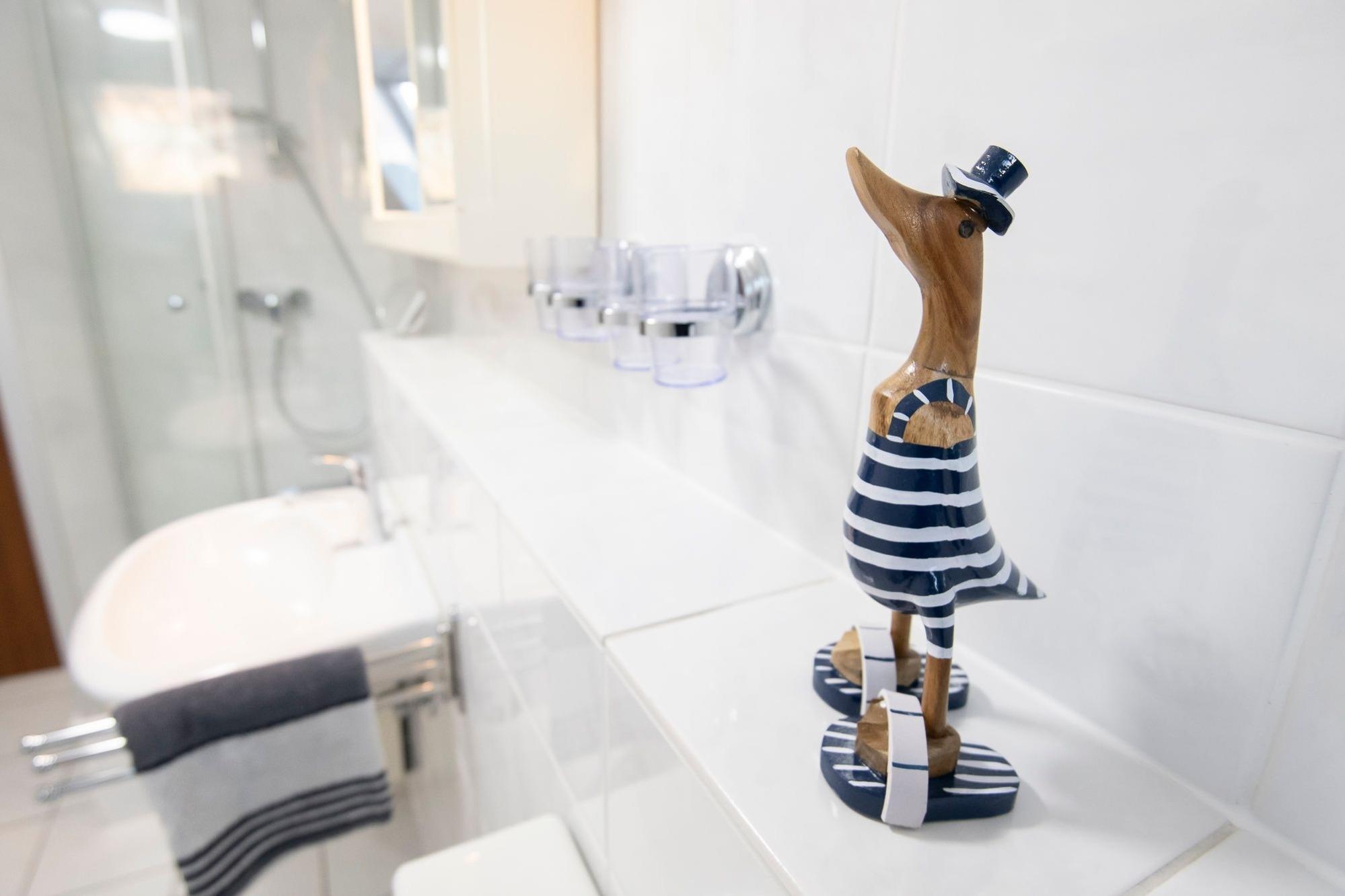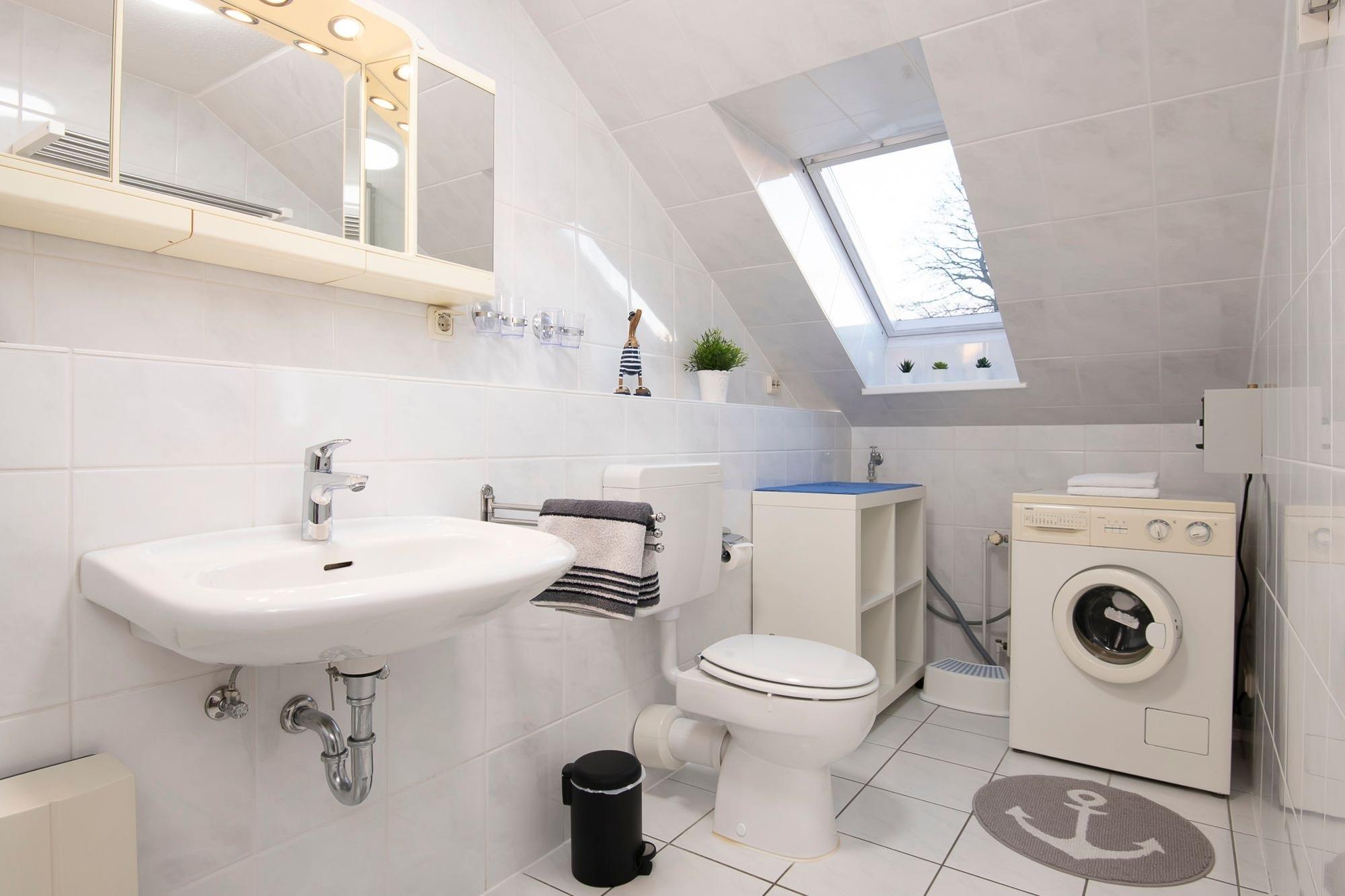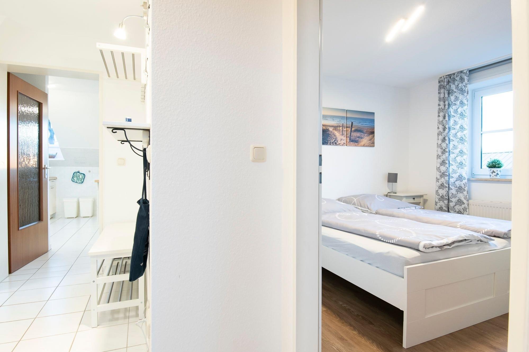 Für erholsame Nächte sorgt in einem der separaten Schlafzimmer ein großes Doppelbett (2x 90x200 cm). Auch hier befindet sich ein TV-Gerät und ein Kleiderschrank, in dem Sie mühelos Ihre Urlaubsgarderobe verstauen können. Das zweite separate Schlafzimmer ist besonders liebevoll und durchdacht gestaltet. Hier werden sich kleine Gäste in zwei Einzelbetten (je 80x200 cm), einem Kinderbett, Kleiderschrank und viel Platz zum Spielen und Malen besonders wohl fühlen. Im Tageslichtduschbad können Sie nach einem langen Strandtag eine erfrischende Dusche nehmen und auch eine Waschmaschine (gegen Gebühr) ist vor Ort.