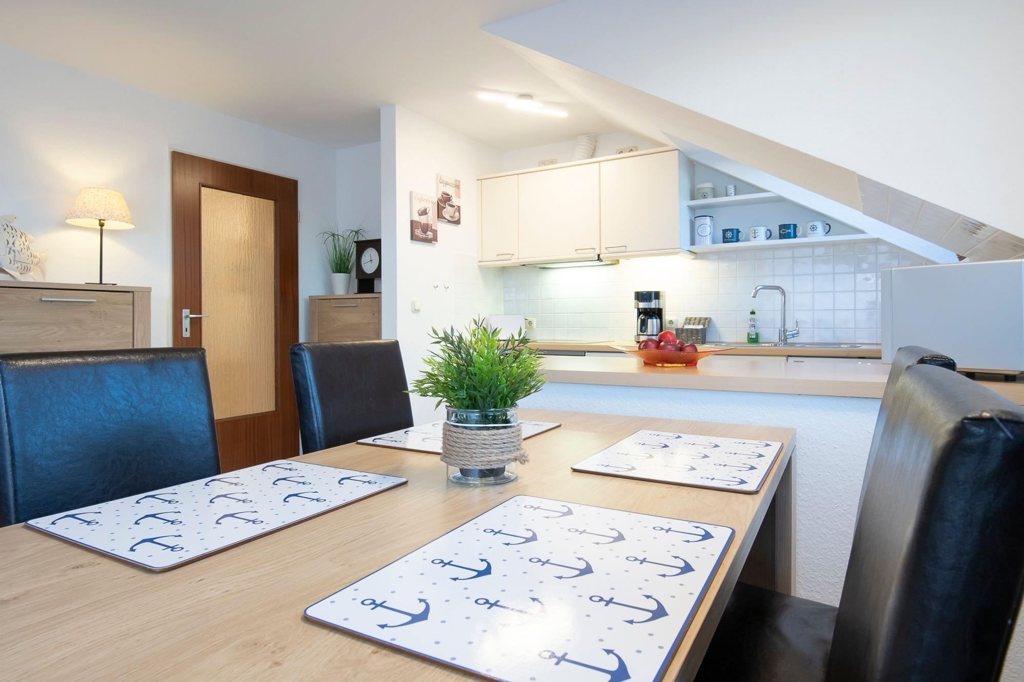 Nach Ihrer Ankunft können Sie sich erstmal auf dem gemütlichen Sofa ausruhen oder die Beine auf dem Chaiselongue hochlegen. Vielleicht knurrt Ihnen der Magen und Sie wollen sich erstmal mit einem leckeren selbst zubereiteten Snack stärken? In der offenen, modernen, gut ausgestatteten Küche sollte dies kein Problem sein. Für das gemeinsame Essen finden dann alle am großzügigen Esstisch Platz. Für Unterhaltung nach dem Essen sorgt ein Flachbild-TV und auch ein kostenloser WLAN-Anschluss ist vorhanden. Betreten Sie den möblierten Balkon und werfen Sie einen Blick über die Dächer Kellenhusens und schnuppern Sie die gute Ostseeluft.