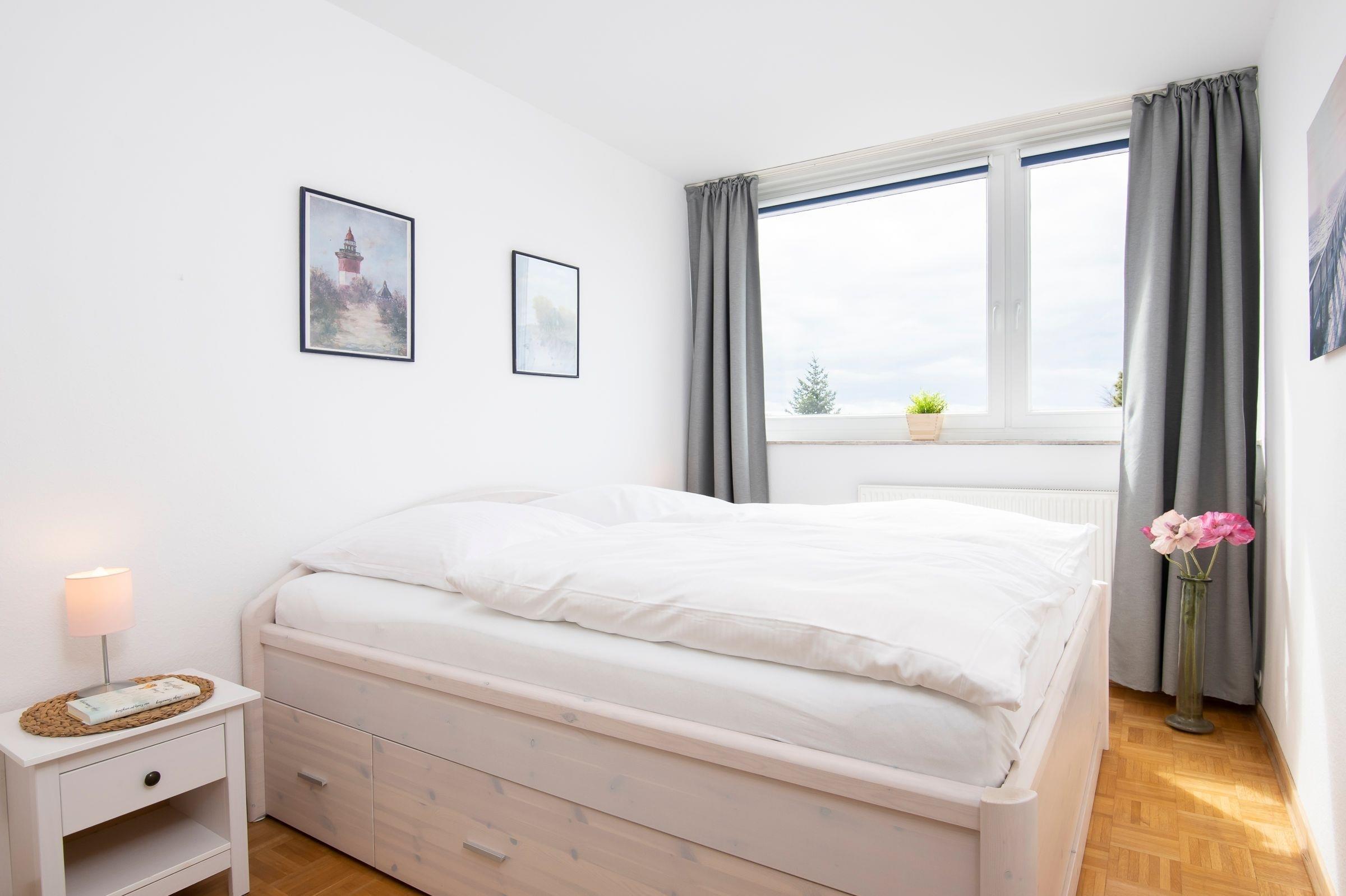 Schlafzimmer: 1 Doppelbett (2x 90x200 cm), Verdunkelung (Innenrollo, Vorhänge).