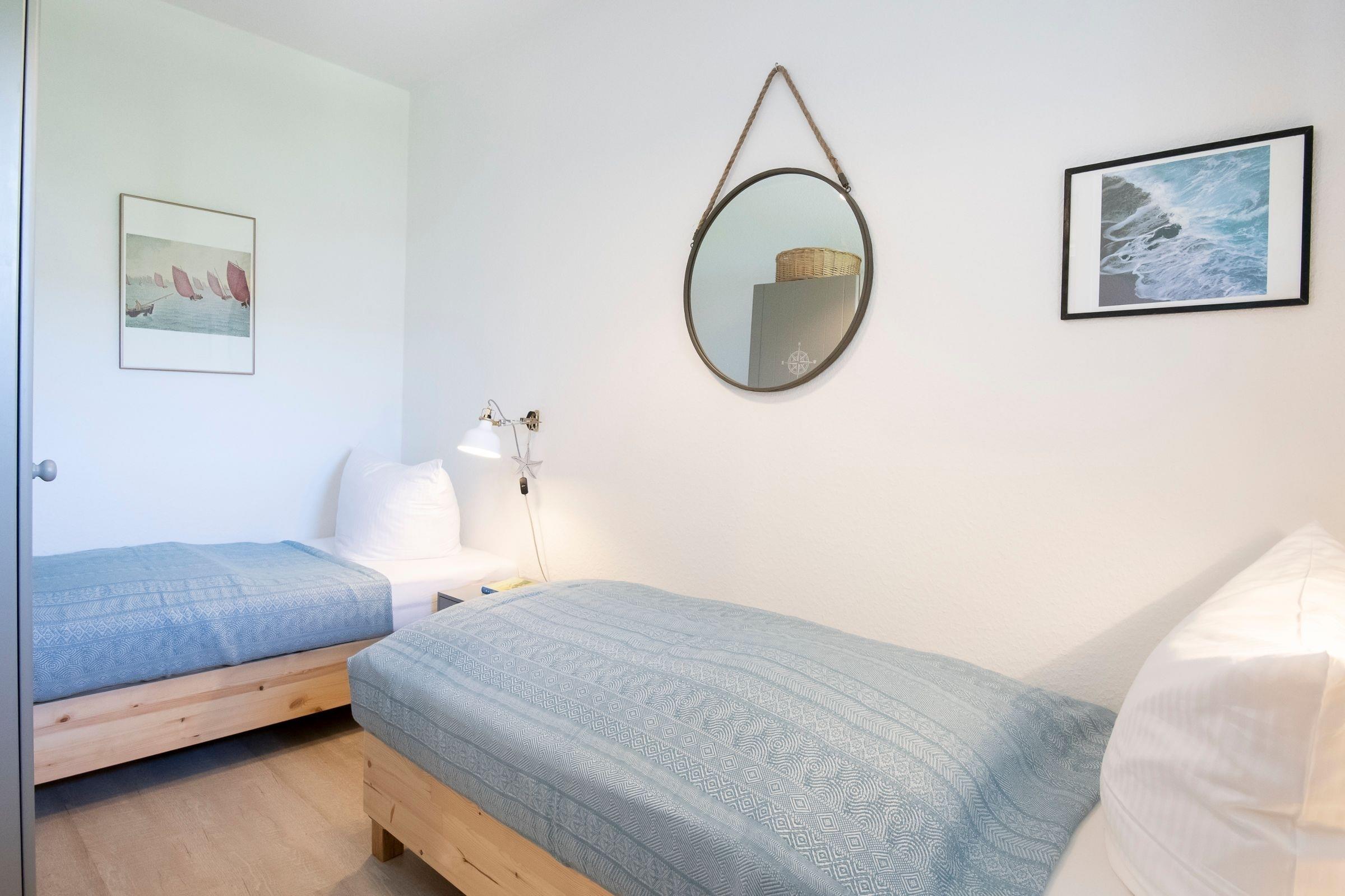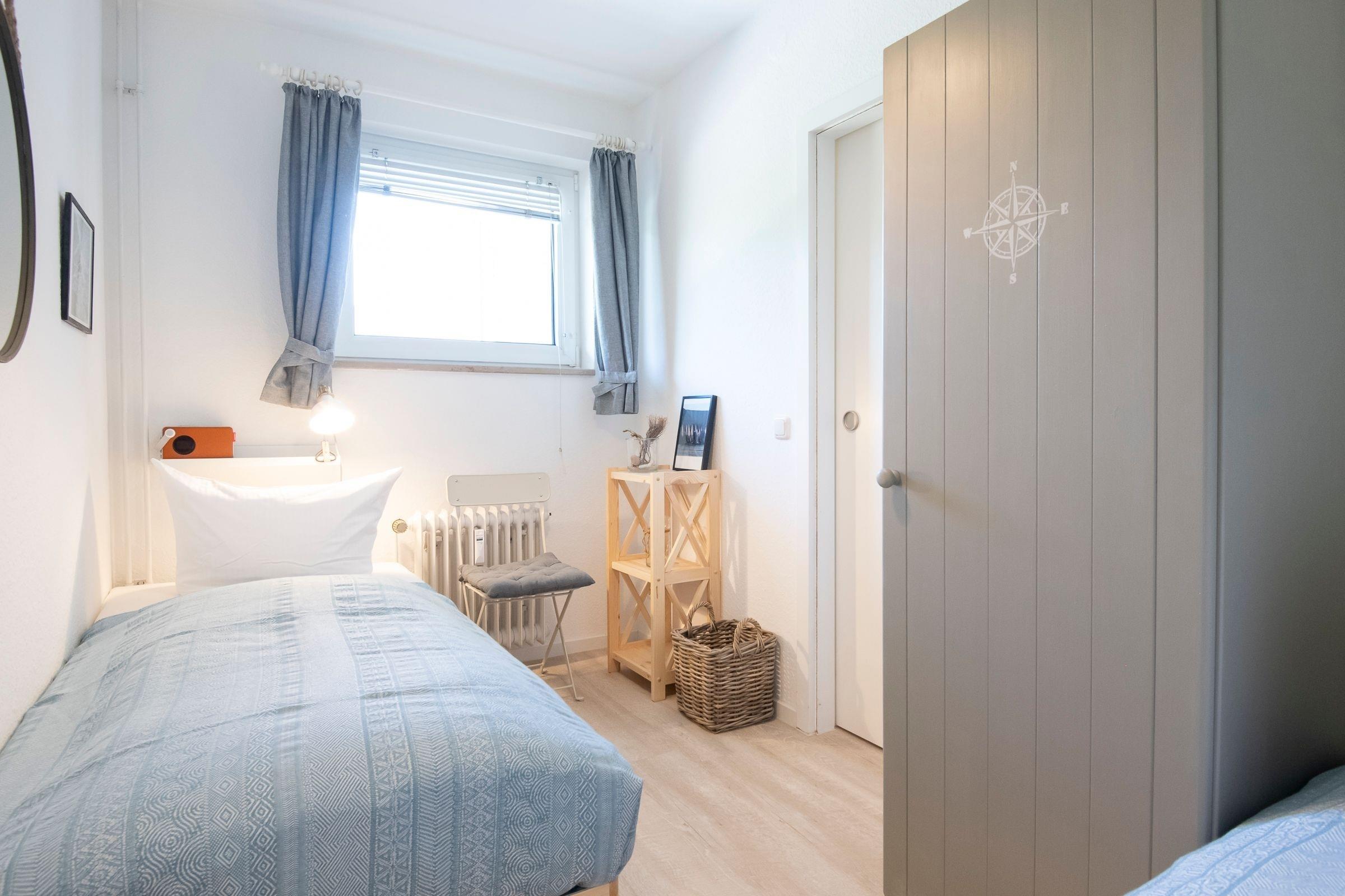 Schlafzimmer: 2 Einzelbetten (je 90x200 cm), Kleiderschrank, Verdunkelung (Jalousie und Vorhang)