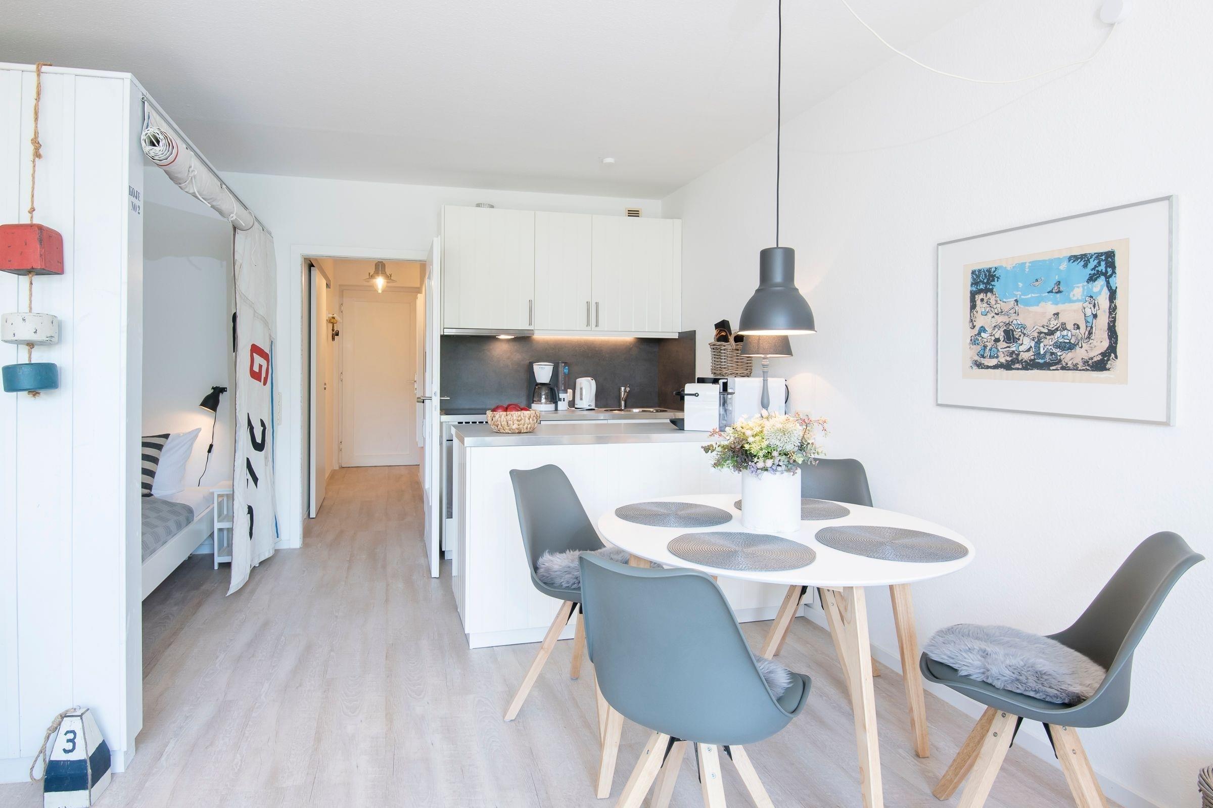 Durch den Flur geradeaus erreichen Sie den kombinierten Wohn- und Essbereich mit offener Küche und Zugang zum Balkon. Das Sofa und zwei weitere Sitzgelegenheiten eignen sich für einen gemeinsamen Abend mit der Familie. Leckere Mahlzeiten lassen sich bequem in der modernen Küchenzeile zaubern. In der Küche sind z. b. ein Backofen, ein Cerankochfeld, eine Geschirrspülmaschine sowie ein Kühlschrank vorhanden. Weiterhin steht Ihnen eine Kaffee-Kapselmaschine (Nespresso) für den täglichen Kaffeegenuss zur Verfügung. Als Schlafmöglichkeit im Wohnbereich dient das Doppelbett (160x200 cm), welches durch eine Koje räumlich abgetrennt ist. Für Verdunklung sorgen zum einen die Vorhänge vor den Fenstern und zum anderen die Segel vor der Koje. Im separaten Schlafzimmer befinden sich zwei getrennt stehende Einzelbetten (je 90x200 cm) als weitere Schlafmöglichkeiten. Im Kleiderschrank können Sie Ihre Urlaubsgarderobe verstauen und Jalousien sorgen für Verdunklung in der Nacht. Das innenliegende Badezimmer verfügt über ein WC, eine Dusche und einen beheizbaren Handtuchhalter. Der möblierte Balkon lädt Sie zum Verweilen ein. Der WLAN-Anschluss ist für Sie selbstverständlich inklusive.