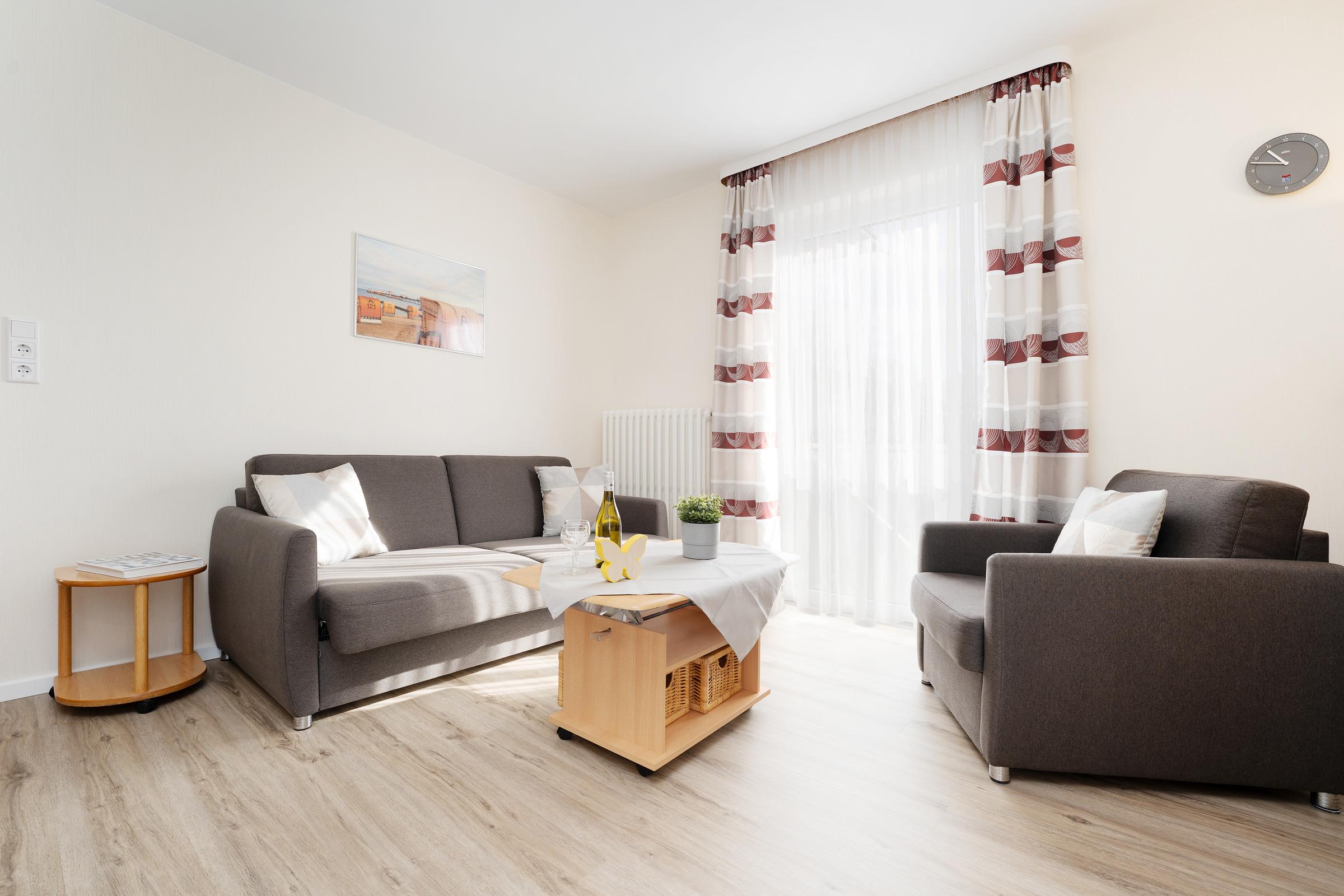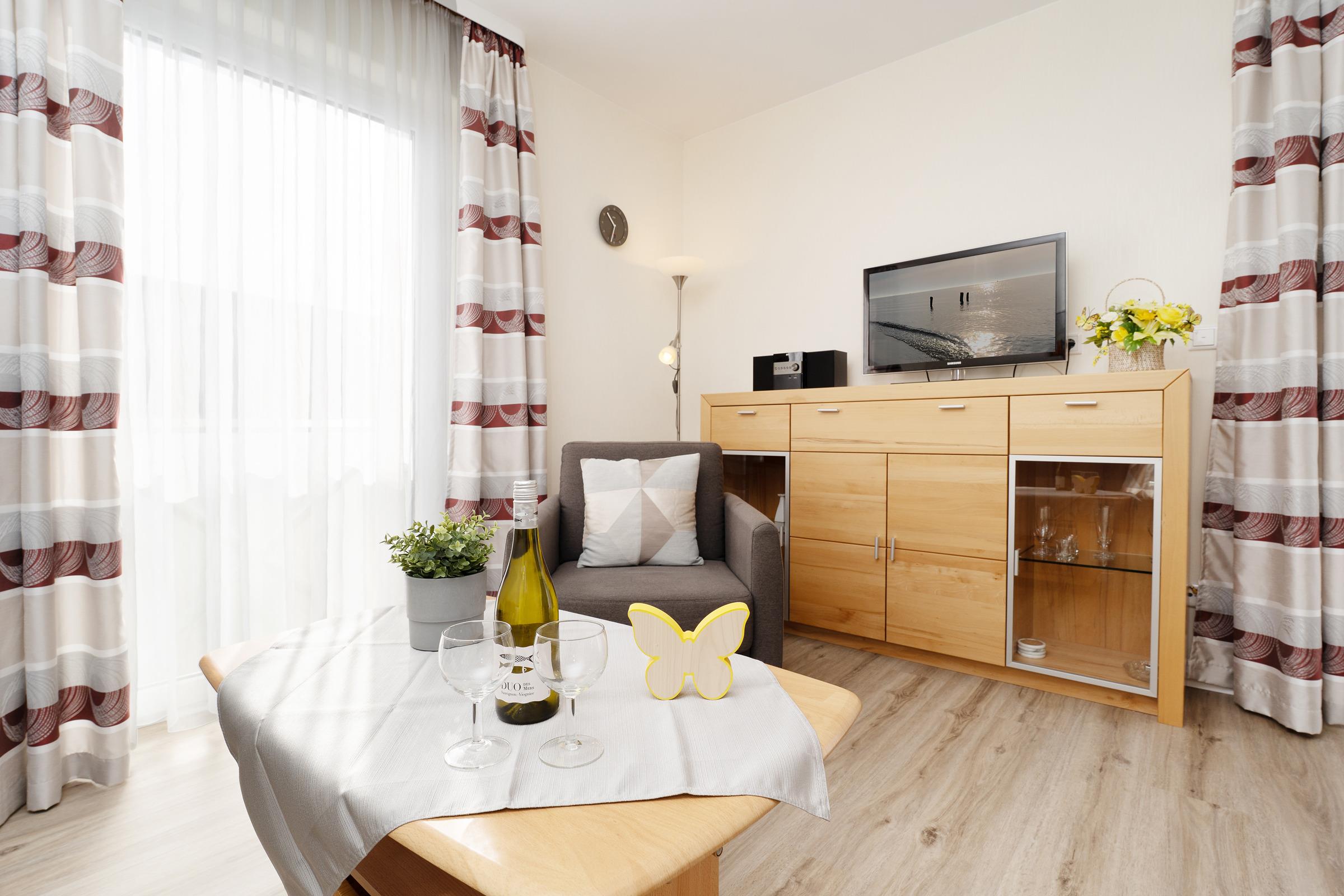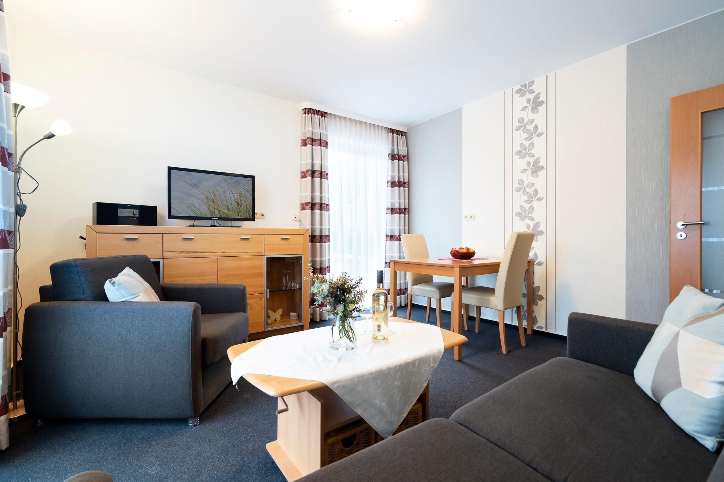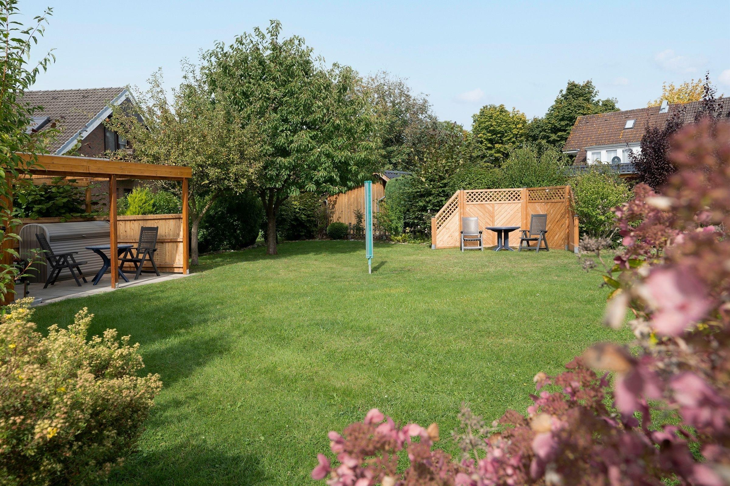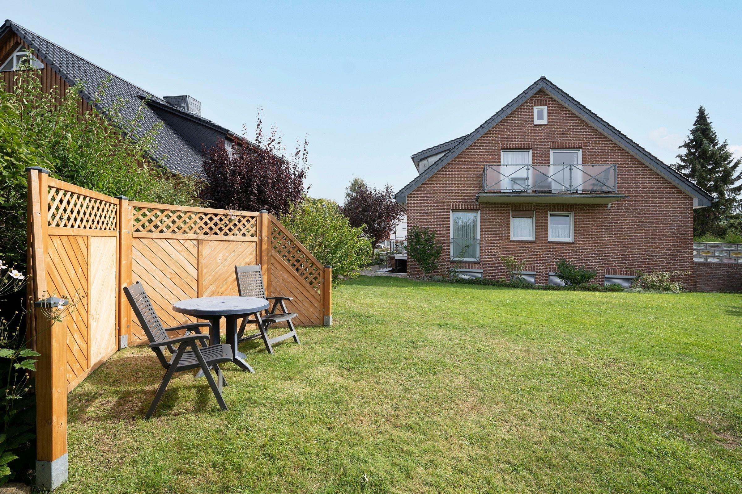 Im gemütlichen Wohn- und Essbereich können Sie entspannt die Füße hochlegen oder den Urlaubstag bei einem leckeren Essen Revue passieren lassen. Dank Flachbild-TV müssen Sie auch im Urlaub auf Ihre Lieblingsserie nicht verzichten. Für den dritten Urlaubsgast lässt sich das Sofa in eine kuschelige Schlafstätte verwandeln (ca. 150x200 cm). An lauschigen Abenden können Sie bei einem guten Glas Wein auf der möblierten Terrasse sitzen. Diese ist natürlich mit Gartenmöbeln und Sonnenschirm ausgestattet. Im Gemeinschaftsgarten steht allen Gästen des Hauses darüber hinaus ein Kohlegrill zur Verfügung. Über den kostenlosen WLAN-Anschluss bleiben Sie auch im Urlaub erreichbar und können Ihre Lieben daheim mit Urlaubsfotos versorgen. Die helle Küche eignet sich perfekt, um Restaurantbesuche und Selbstverpflegung im Urlaub zu kombinieren. Kleine Gerichte und Snacks lassen sich hier problemlos zubereiten. Im separaten Schlafzimmer mit Kleiderschrank wartet ein komfortables Doppelbett auf Sie (2x 90x190 cm). Im Tageslichtbad mit Dusche und Spiegelschrank starten Sie erfrischt in den Tag.