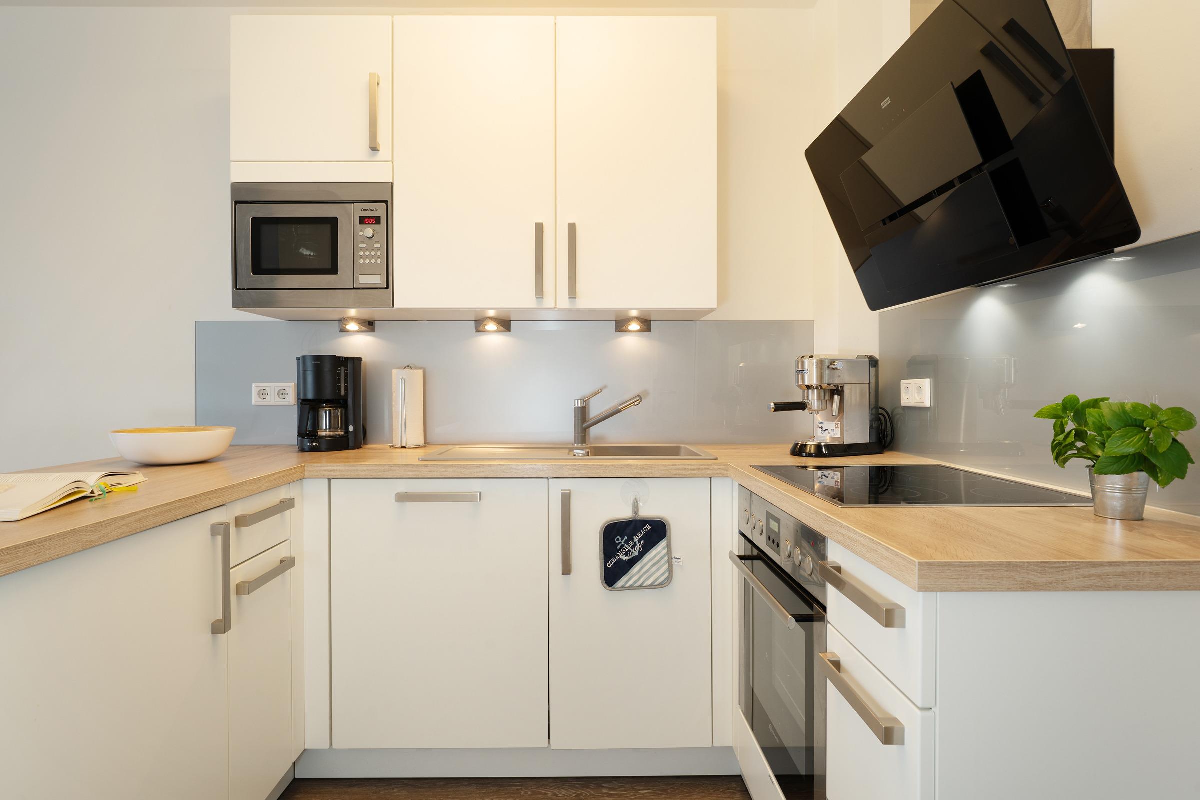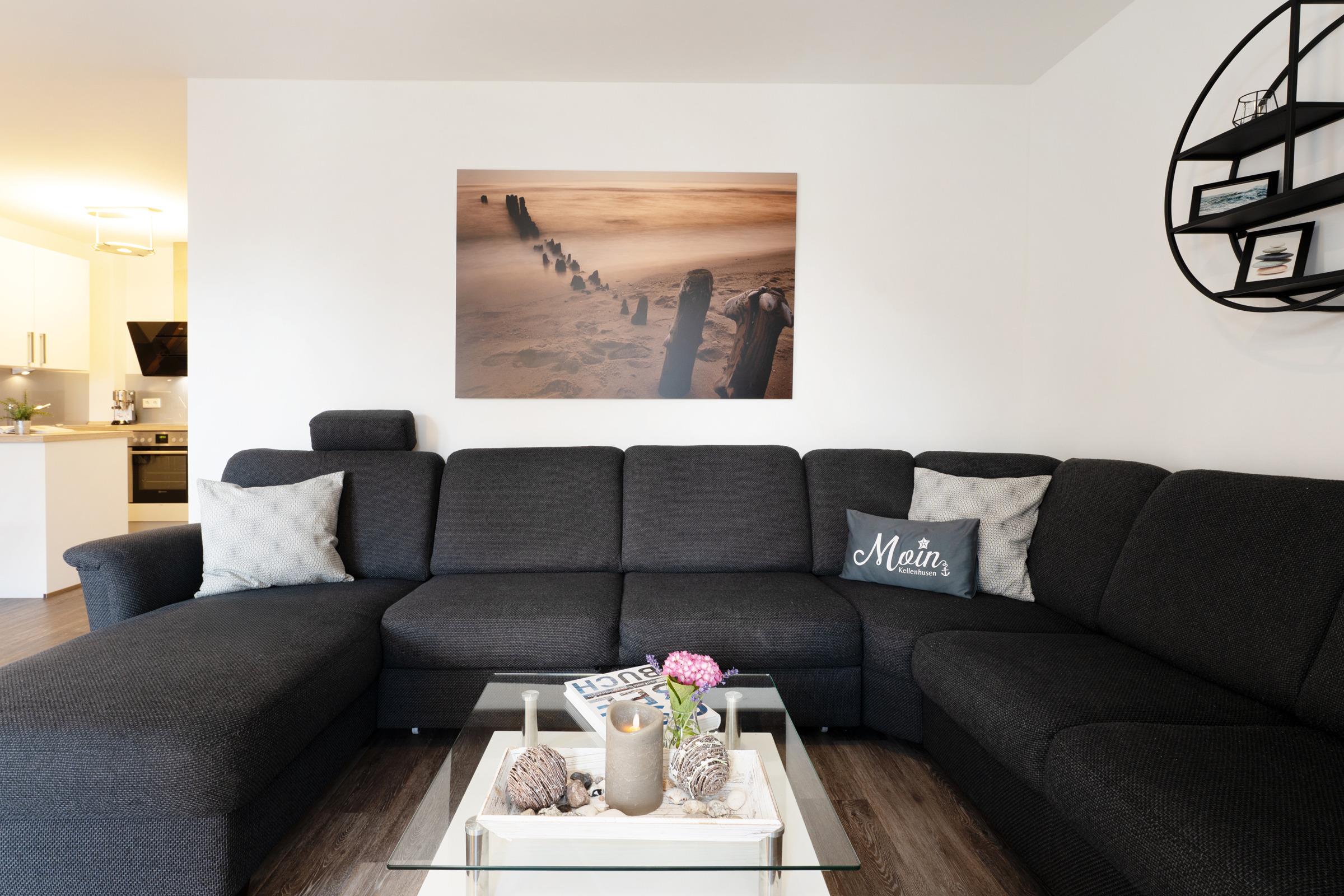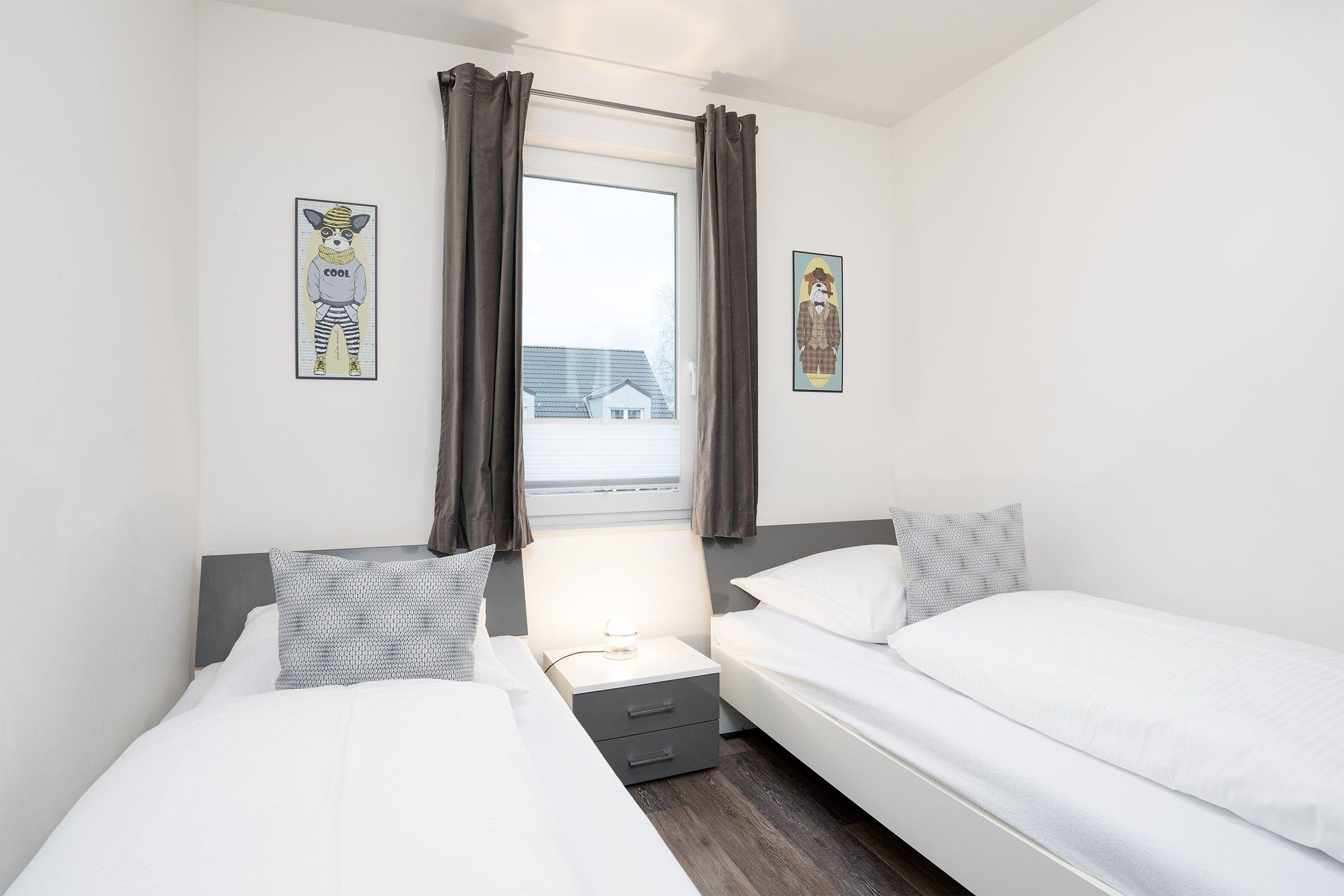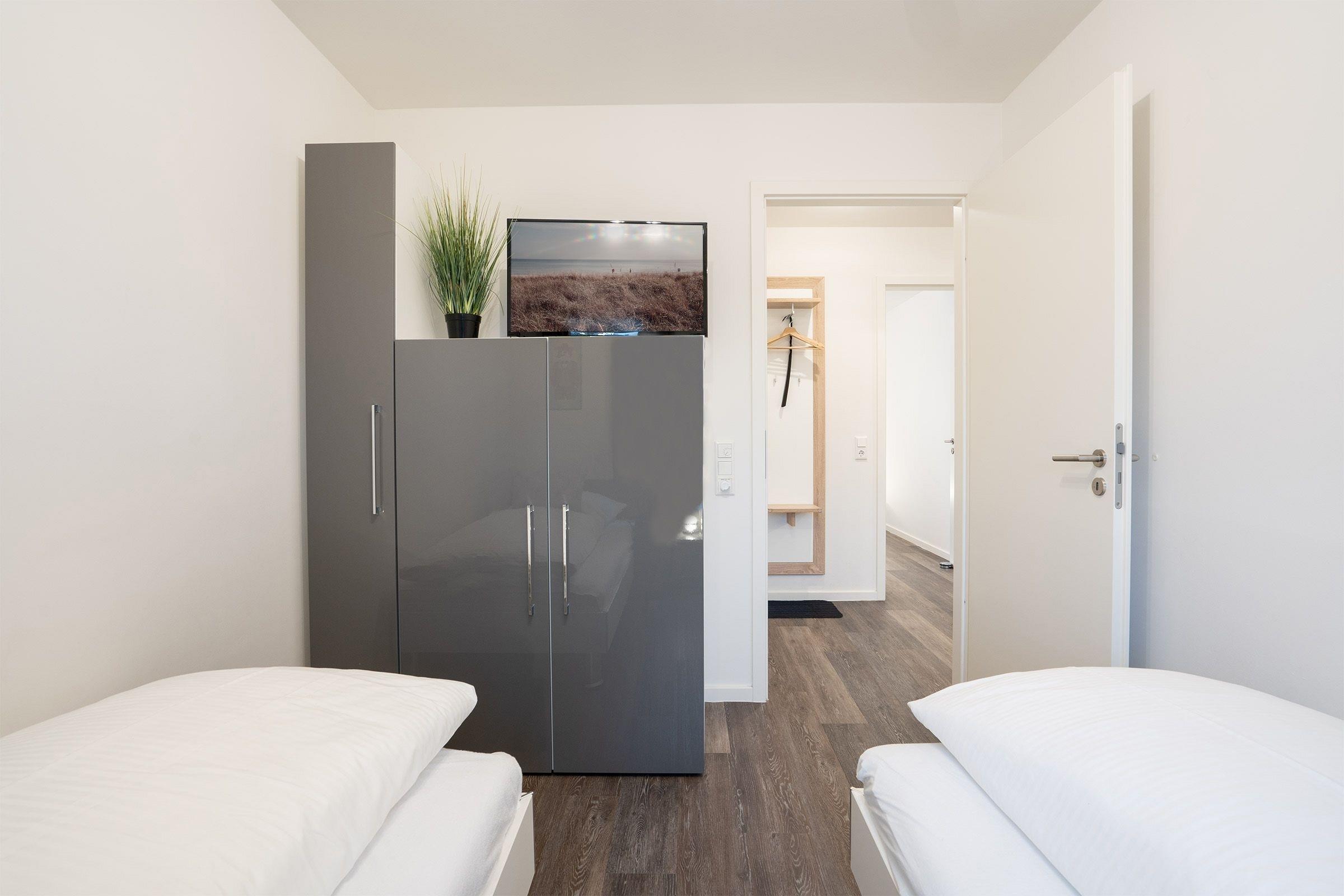 Ganz bequem mit dem Fahrstuhl können Sie Ihr Feriendomizil im 1.OG erreichen. Vom Flur aus gelangen Sie rechts in den Wohn-/Essbereich, der mit einer großzügigen Wohnlandschaft und einem Esstisch mit 4 Stühlen zu gemütlichen Fernseh- & Spieleabenden einlädt. Von hier aus gelangen Sie auch auf den überdachten Balkon und können es sich auf der Sitzgruppe richtig gemütlich machen. Die in den Wohnbereich integrierte Küche lässt keine Wünsche offen und bietet Ihnen alle Annehmlichkeiten. Das erste der beiden Schlafräume ist mit einem Doppelbett (2x 90x200 cm) und das Kinderzimmer mit 2 Einzelbetten (je 90x200 cm) und einem weiteren TV ausgestattet. Gleich nebenan befindet sich das fußbodenbeheizte Bad mit ebenerdiger Dusche und Waschmaschine. Der gesamte Innenbereich der Wohnung ist schwellenlos und eignet sich daher auch für Menschen mit Mobilitätseinschränkungen.