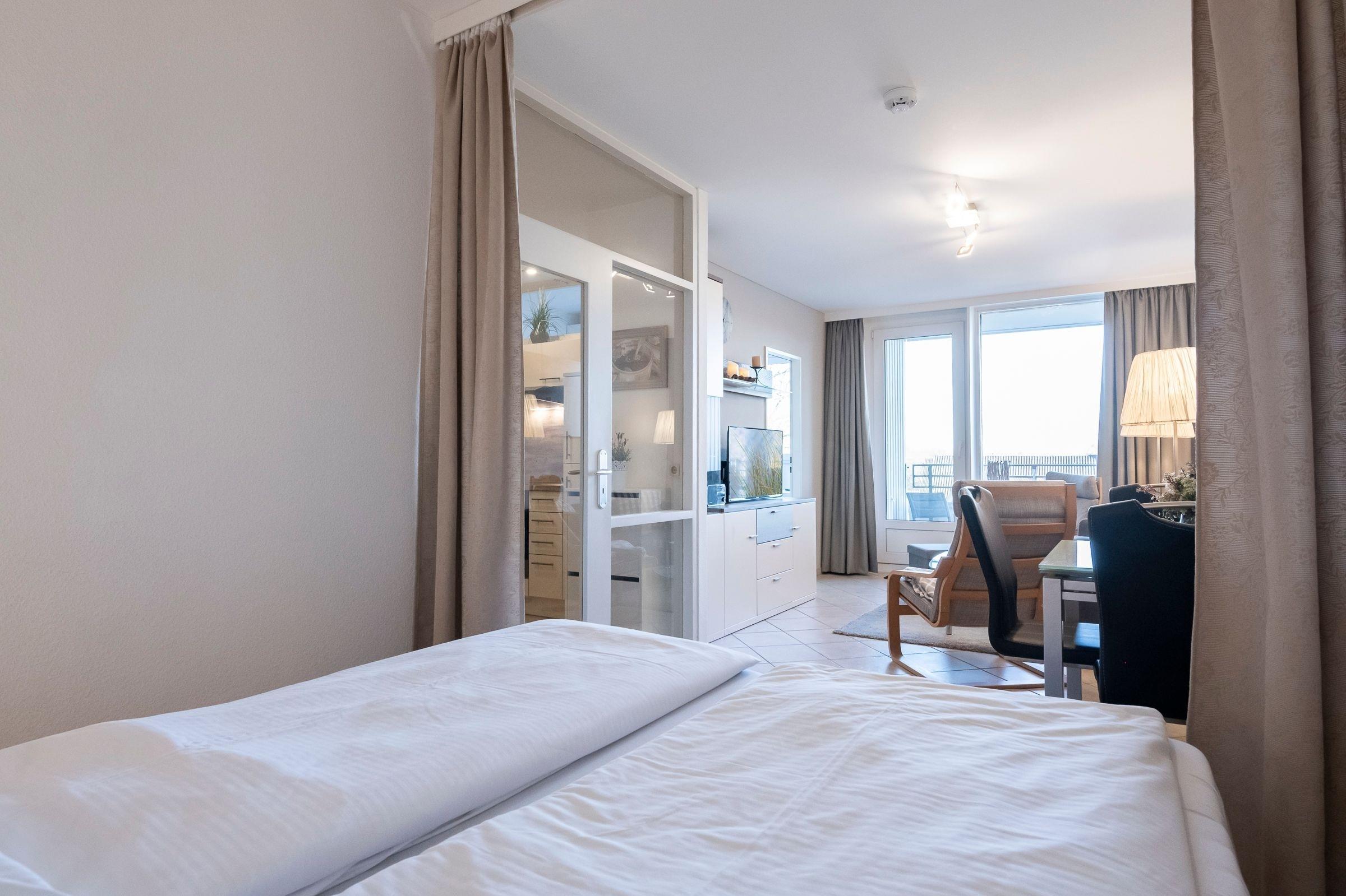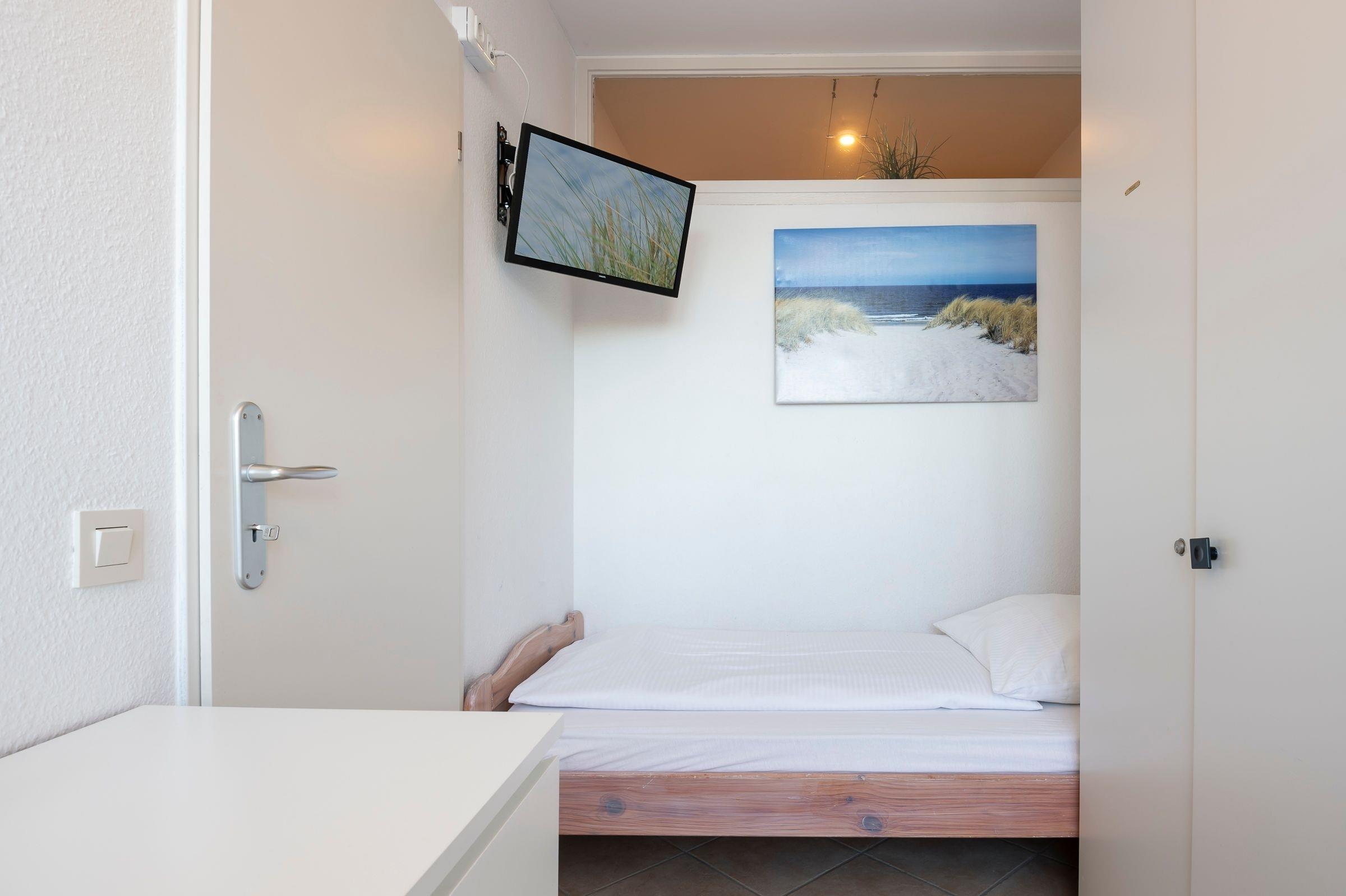 Schlafzimmer: 2 Einzelbetten (je 80x190 cm), TV, Verdunkelung (Vorhänge)