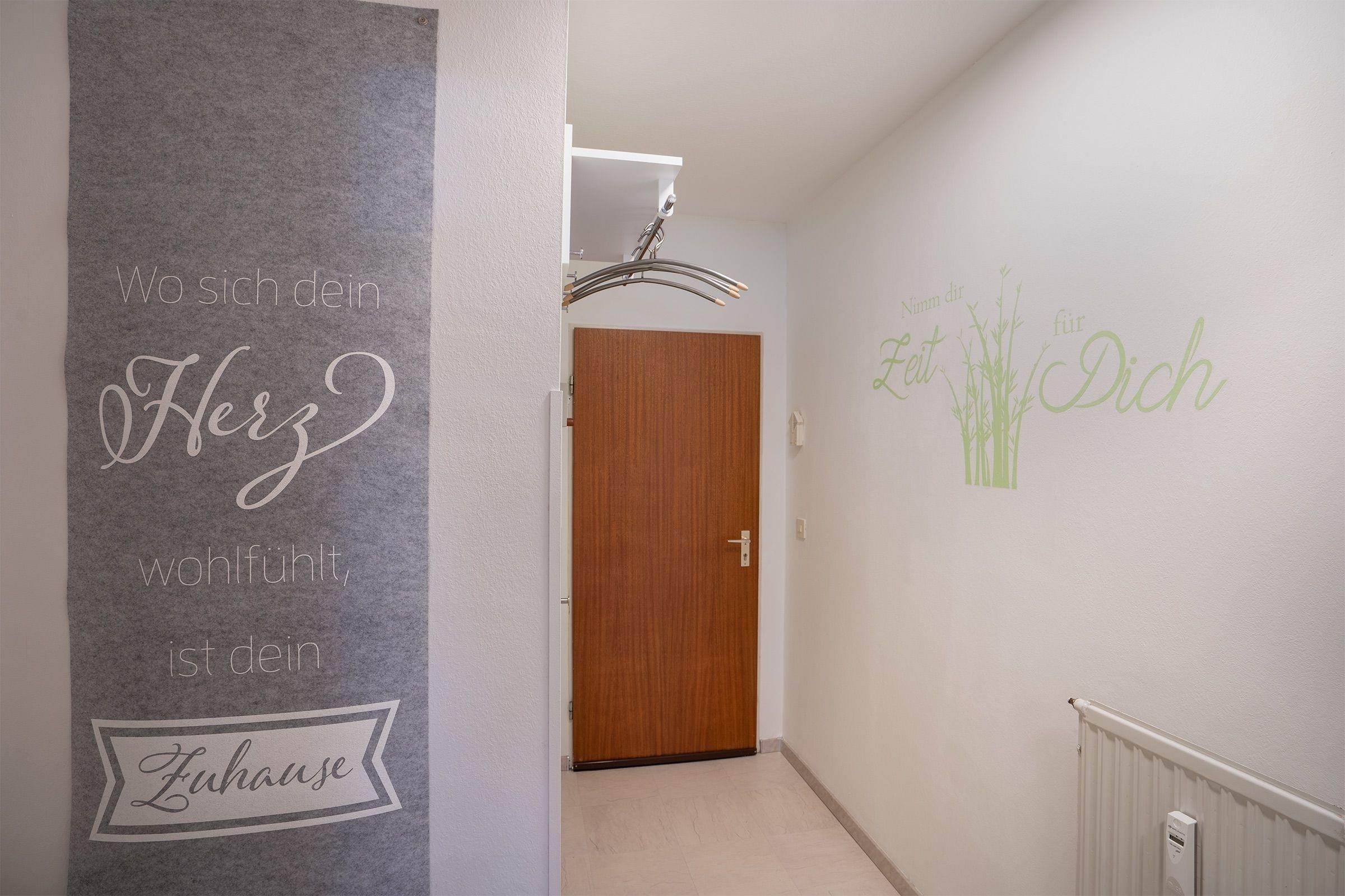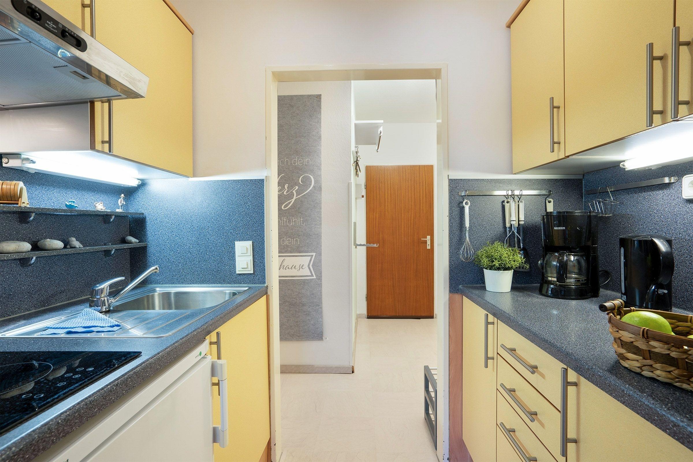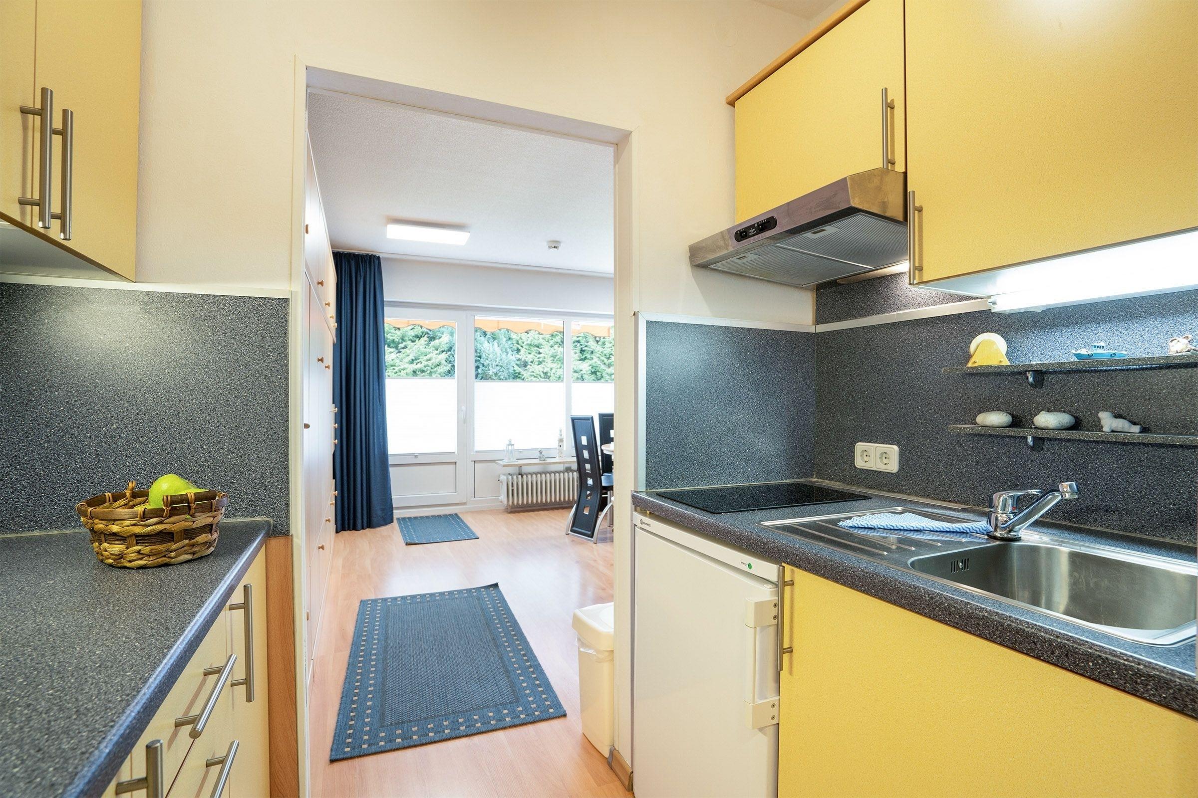 Machen Sie es sich im Wohn-/Schlafbereich auf der Couch bequem oder nutzen den angrenzenden Essplatz für gute Gespräche oder entspannte Fernsehabende. Zur Nacht lässt sich das Sofa in eine Schlafmöglichkeit für 2 Personen umwandeln (160x200 cm). Eine weitere Schlafmöglichkeit bietet die Schrankwand mit einem großen, ausklappbarem Doppelbett (2x 90x200 cm). Die offene Küche ist mit vielen Annehmlichkeiten ausgestattet und lädt zum gemeinsamen Kochen ein oder Sie nutzen das umfangreiche gastronomische Angebot in der Umgebung. Genießen Sie zahlreiche Sonnenstunden auf der großzügigen, möblierten Südwest-Terrasse mit Blick in den Garten. Ein modernes, hell gefliestes Duschbad rundet die Ausstattung dieser Ferienwohnung ab.