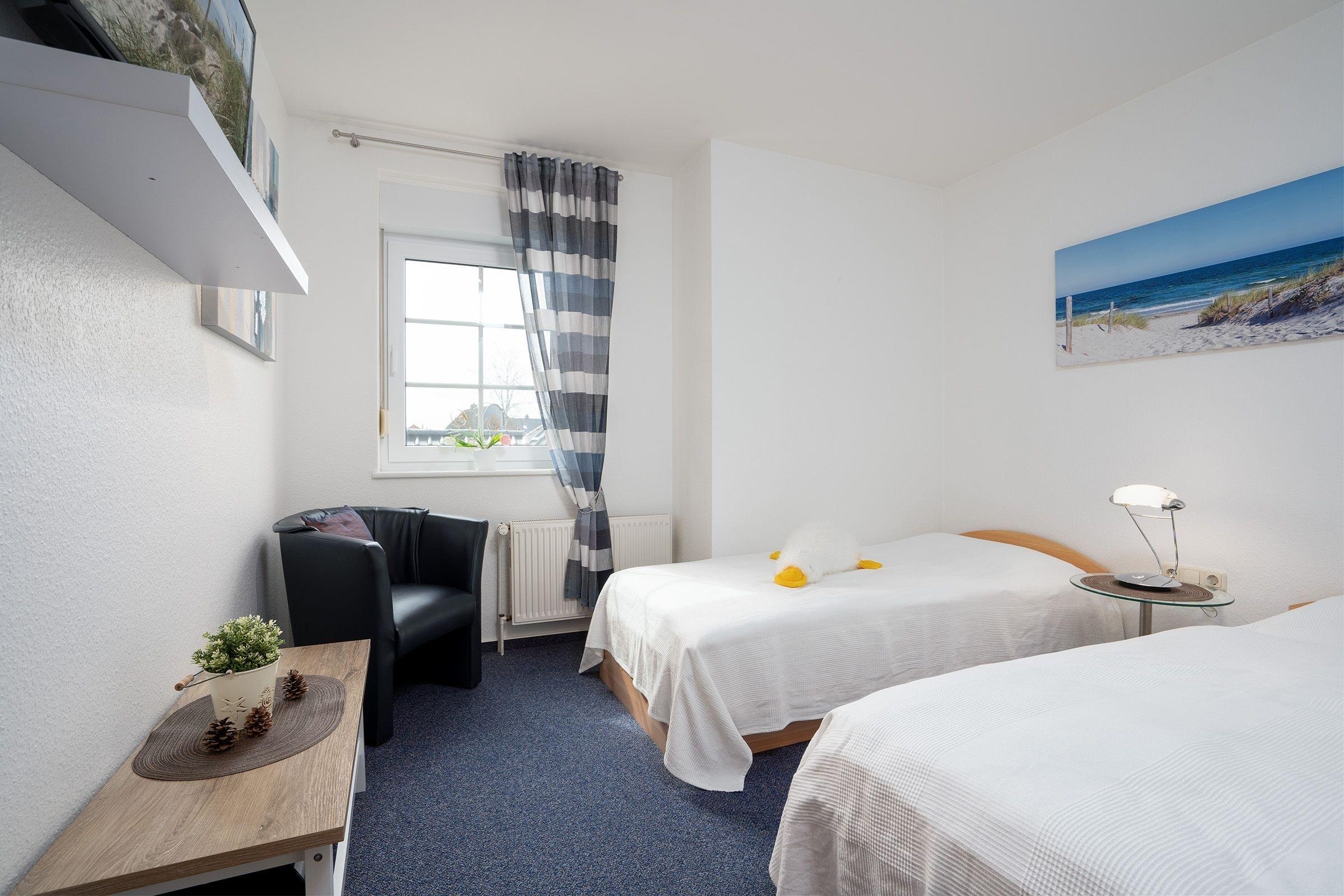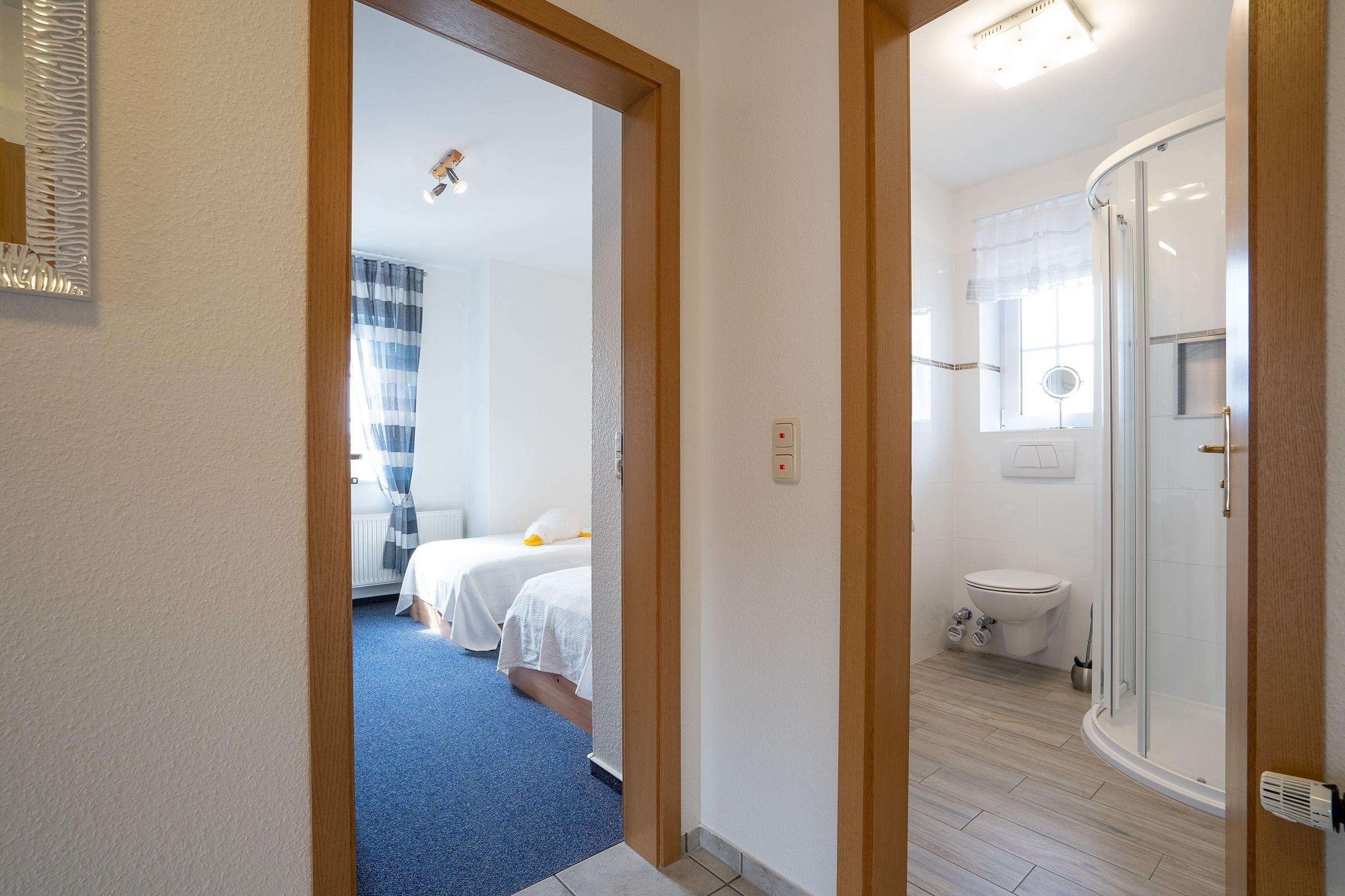 (1 Doppelbett 2x 90x200 cm und 2 Einzelbetten je 90x200 cm) laden zum Entspannen und Träumen ein. Ein modernes, tageslichthelles Duschbad rundet diese Ferienwohnung ab.