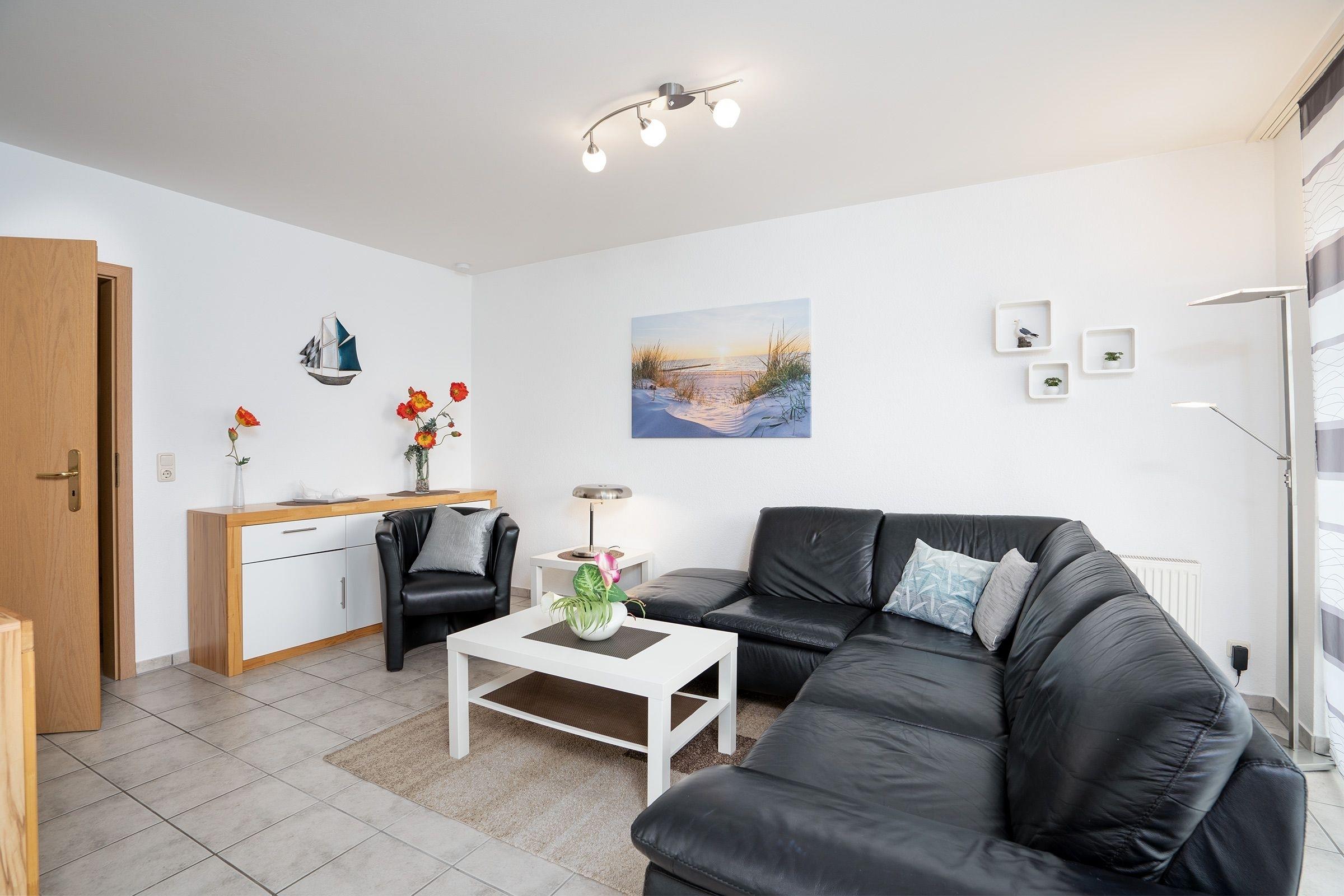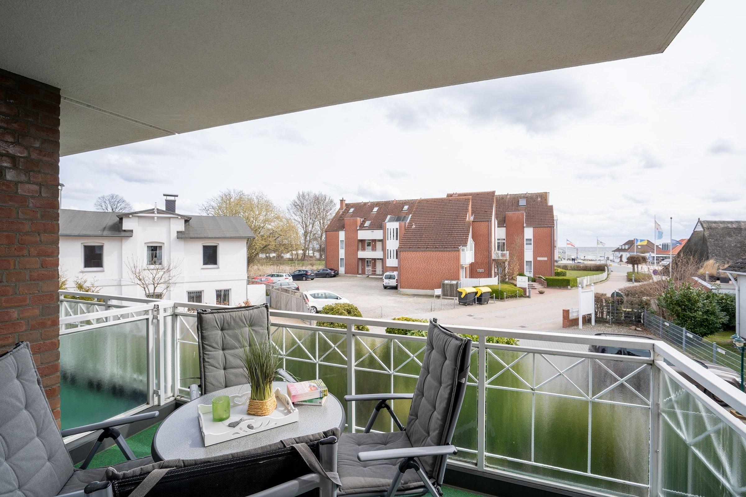 Der offene Wohnbereich empfängt Sie mit gemütlicher Sitzecke, Flat-TV, Essbereich und gut ausgestatteter Küche, hier ist alles harmonisch aufeinander abgestimmt! Vom Wohnbereich aus geht es direkt nach draußen - von Ihrem überdachten Balkon mit Südost-Ausrichtung haben Sie einen wunderschönen Blick auf die Ostsee. Zwei Schlafzimmer