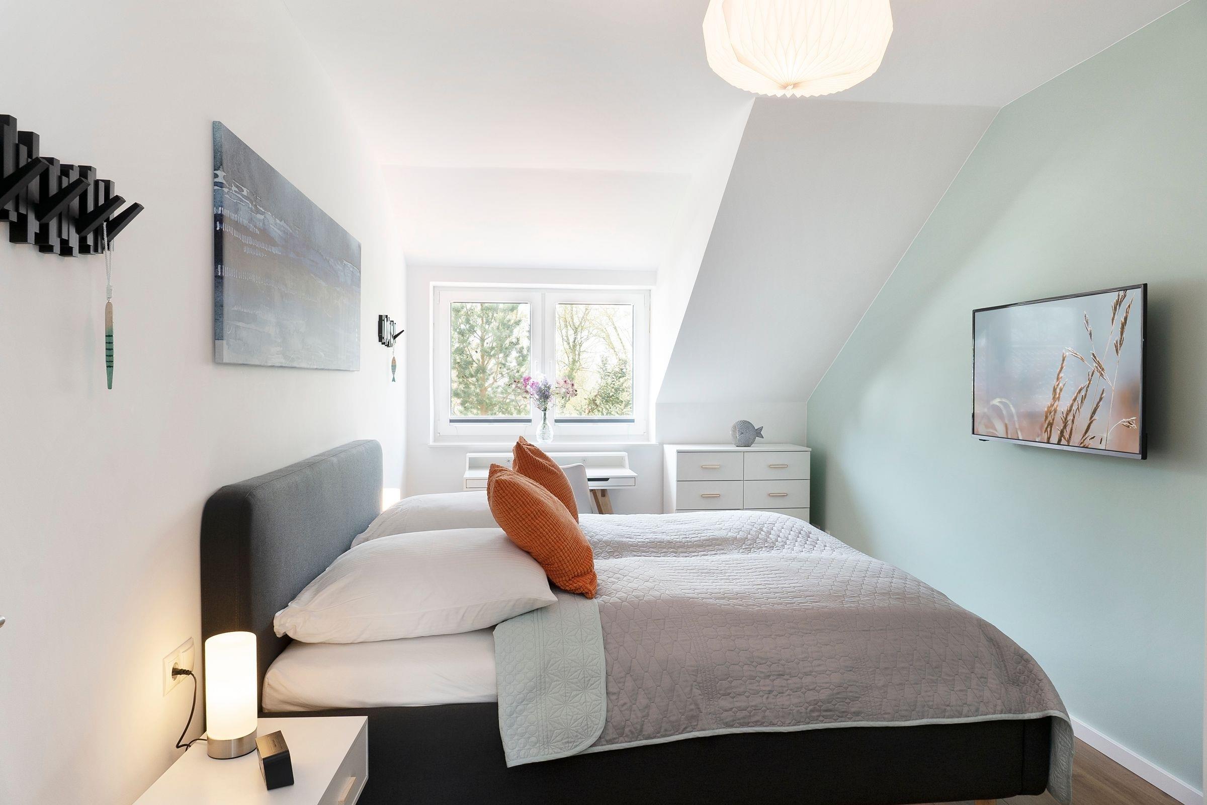 Schlafzimmer 3 (1.OG): Doppelbett (2x 90x200cm), Kleiderschrank, Verdunkelung: Plissees, TV, Platz für Kinderreisebett