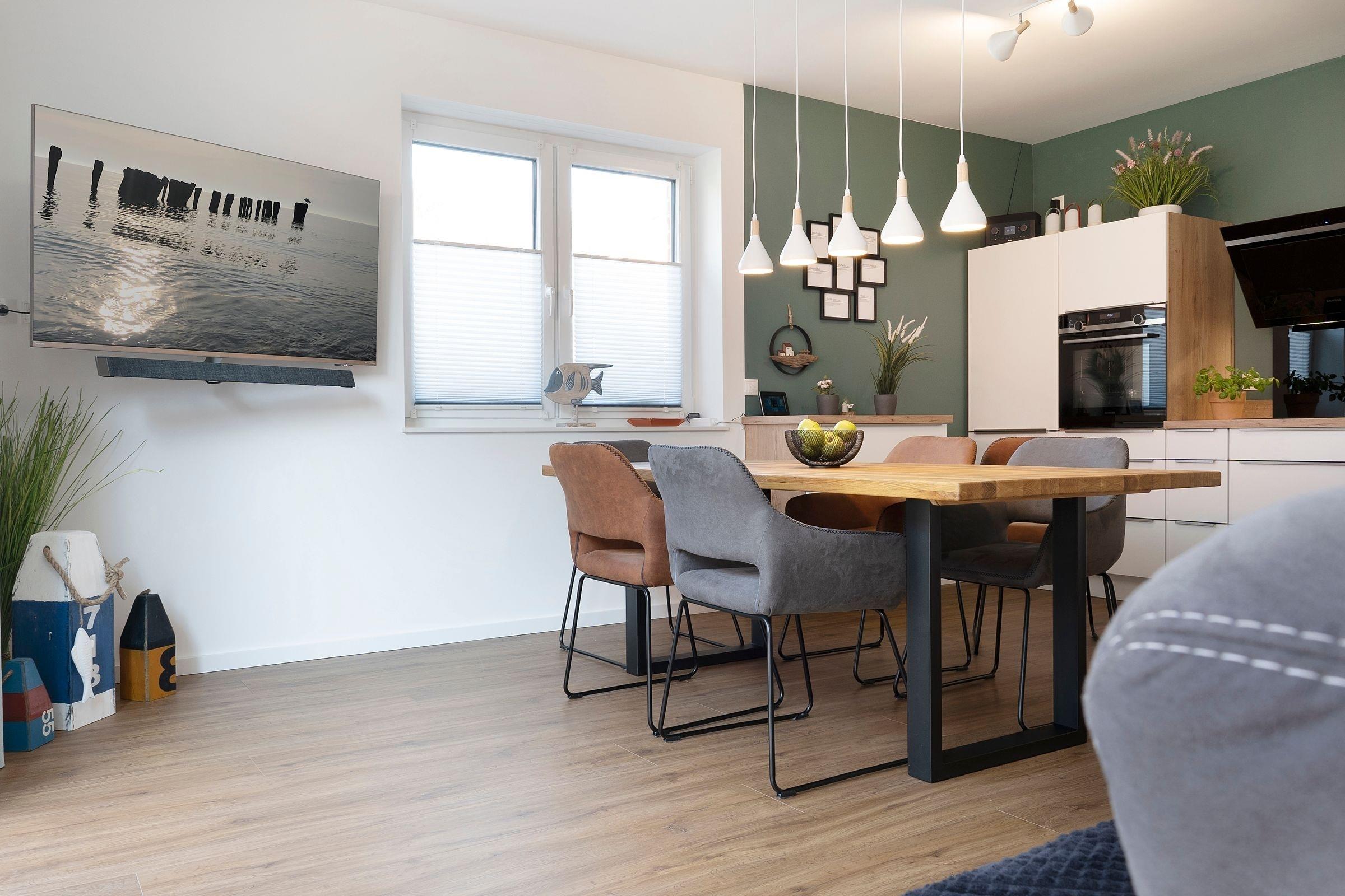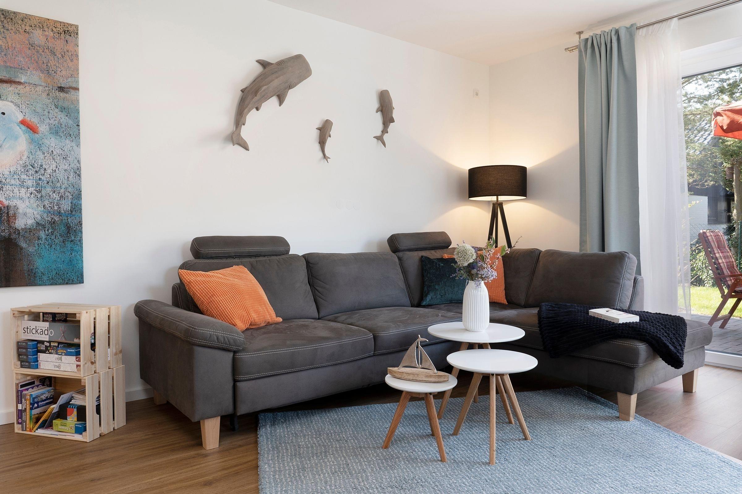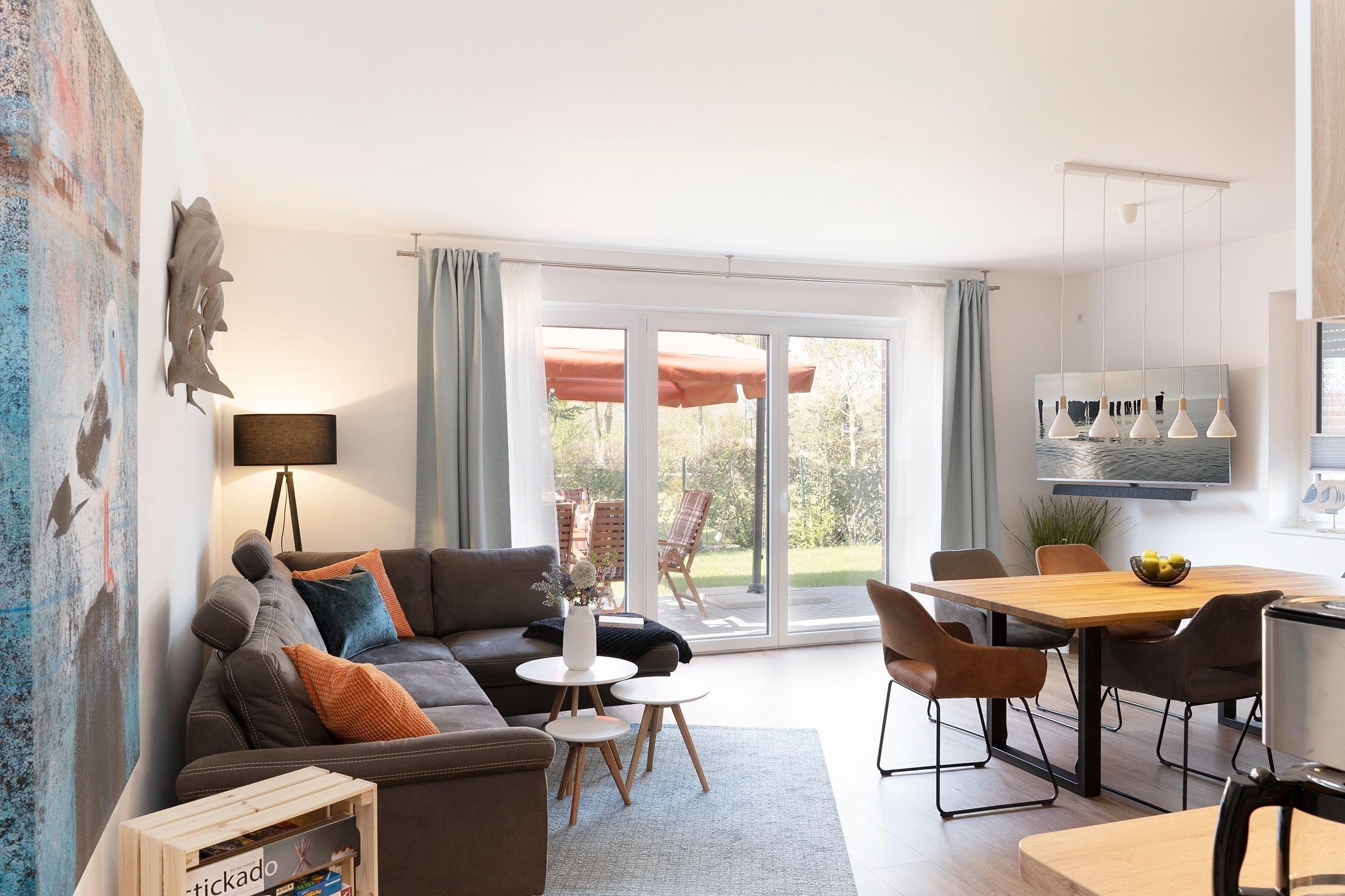 Das Herzstück dieses modern eingerichteten Feriendomizils bildet das zum Essbereich und zur Küche offen gestaltete, großzügige Wohnzimmer. Hier können Sie gemeinsam kochen, essen, lachen und die Seele baumeln lassen. Für gemeinsame Spieleabende finden Sie hier eine liebevoll zusammengestellte Auswahl an Gesellschaftsspielen. Die drei individuell eingerichteten Schlafzimmer mit jeweils eigenem TV bilden die perfekten Rückzugsorte. Im Erdgeschoss finden Sie ein Schlafzimmer mit einem Boxspring-Einzelbett (100x200 cm). Und im Obergeschoss sind die beiden Schlafräume jeweils mit einem Doppelbett (2x 80x200 cm bzw. 2x 90x200 cm) ausgestattet. Dank praktischer Außenjalousien bzw. Plissees sind Sie nachts bestens abgeschirmt und können sich auf einen erholsamen Schlaf freuen. Sie haben viel Programm für den nächsten Urlaubstag geplant? Dank der zwei modernen Duschbäder kommt keine Hektik auf und Sie starten entspannt in den Tag. Neben den ebenerdigen Duschen runden hier gemütliche Fußbodenheizungen das Wohlfühlerlebnis ab. Im Strandkorb auf der Terrasse lassen Sie gemütlich den Tag ausklingen - genießen Sie hier die gesunde Ostseeluft bei einem gut temperierten Glas Wein aus dem Weinkühlschrank.