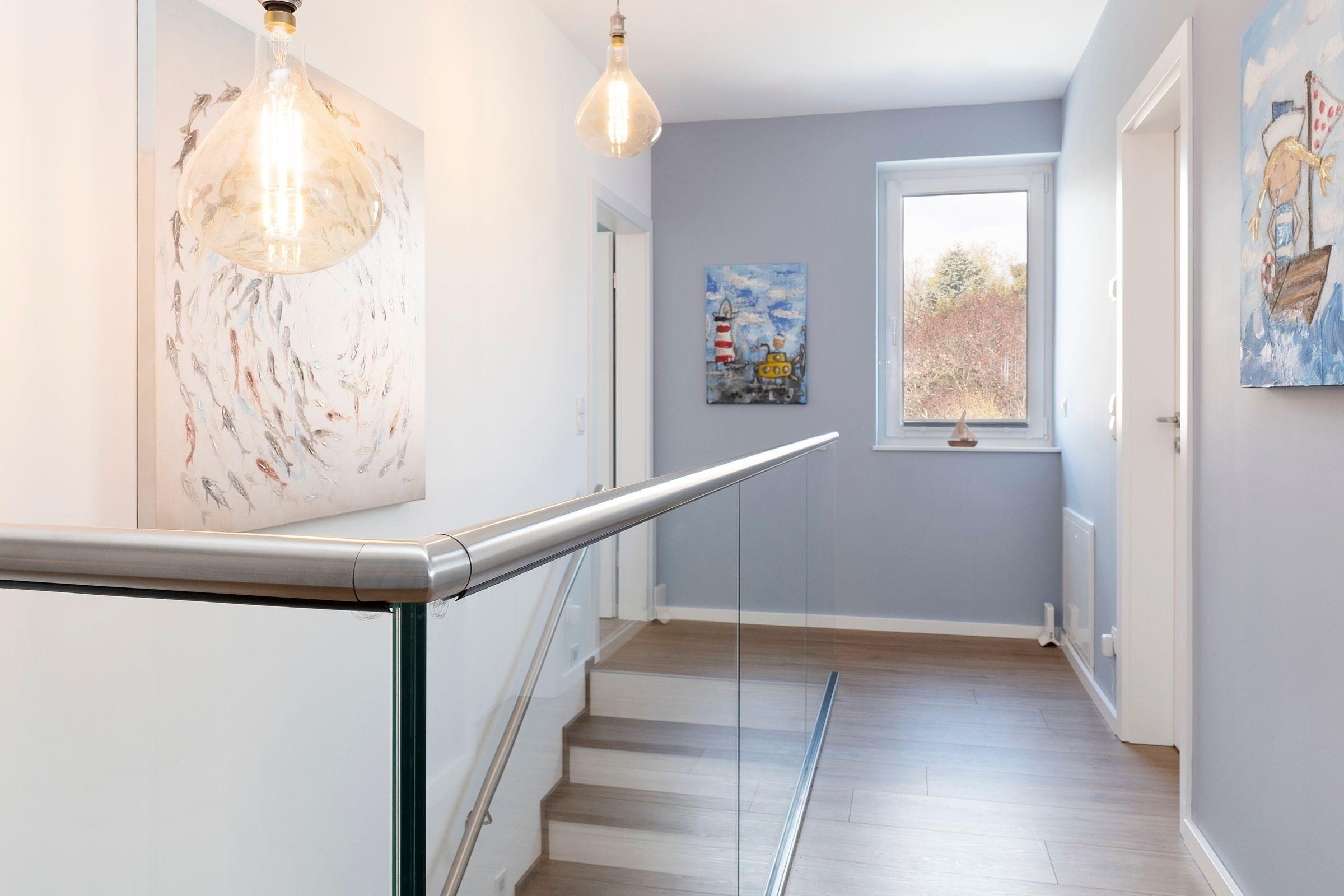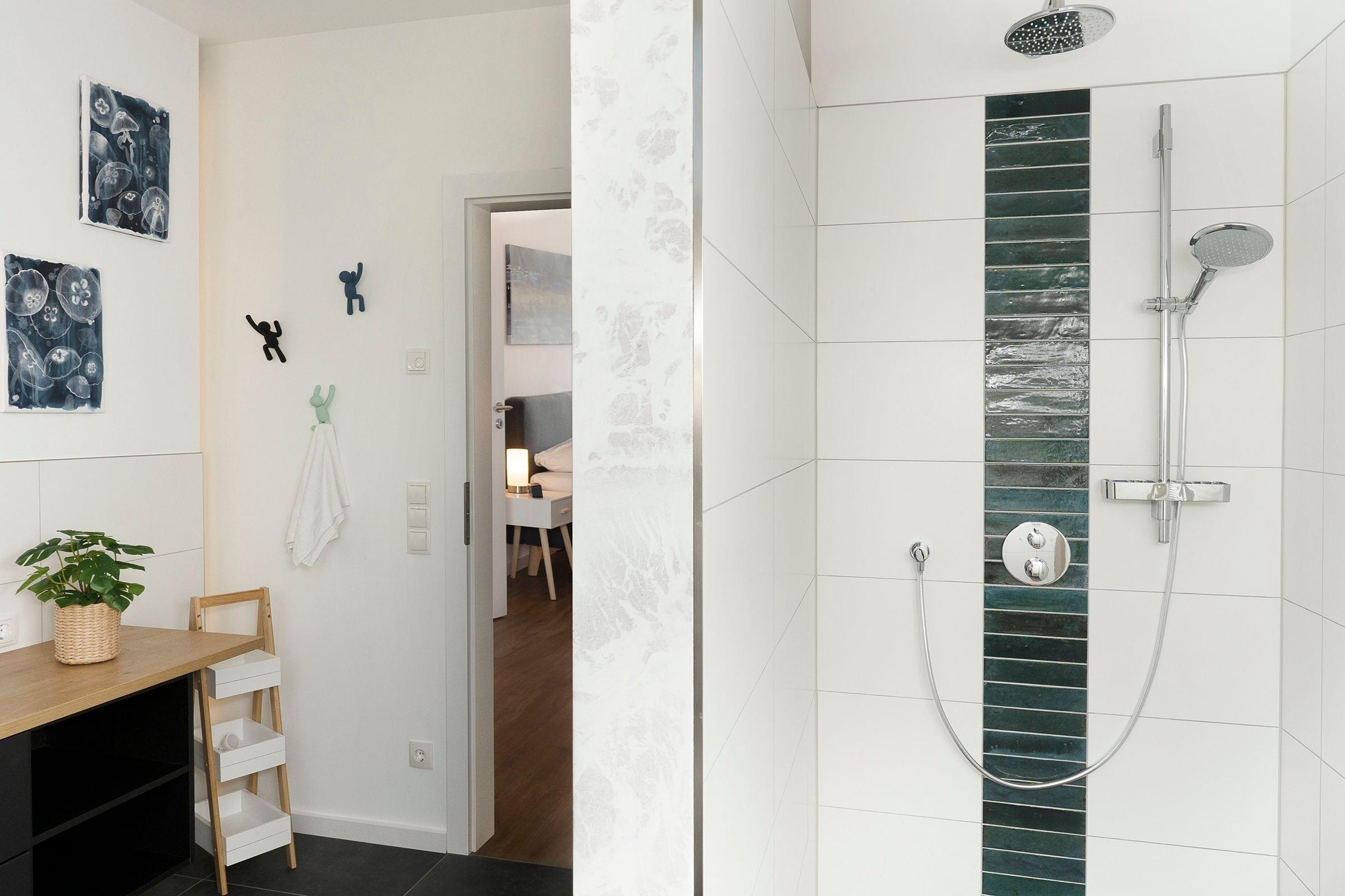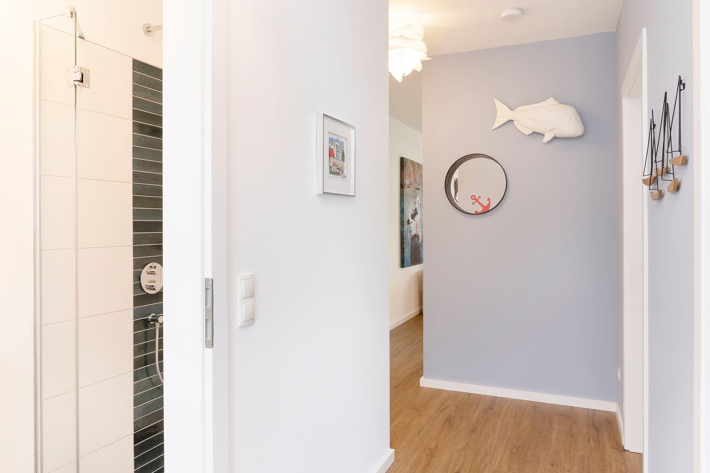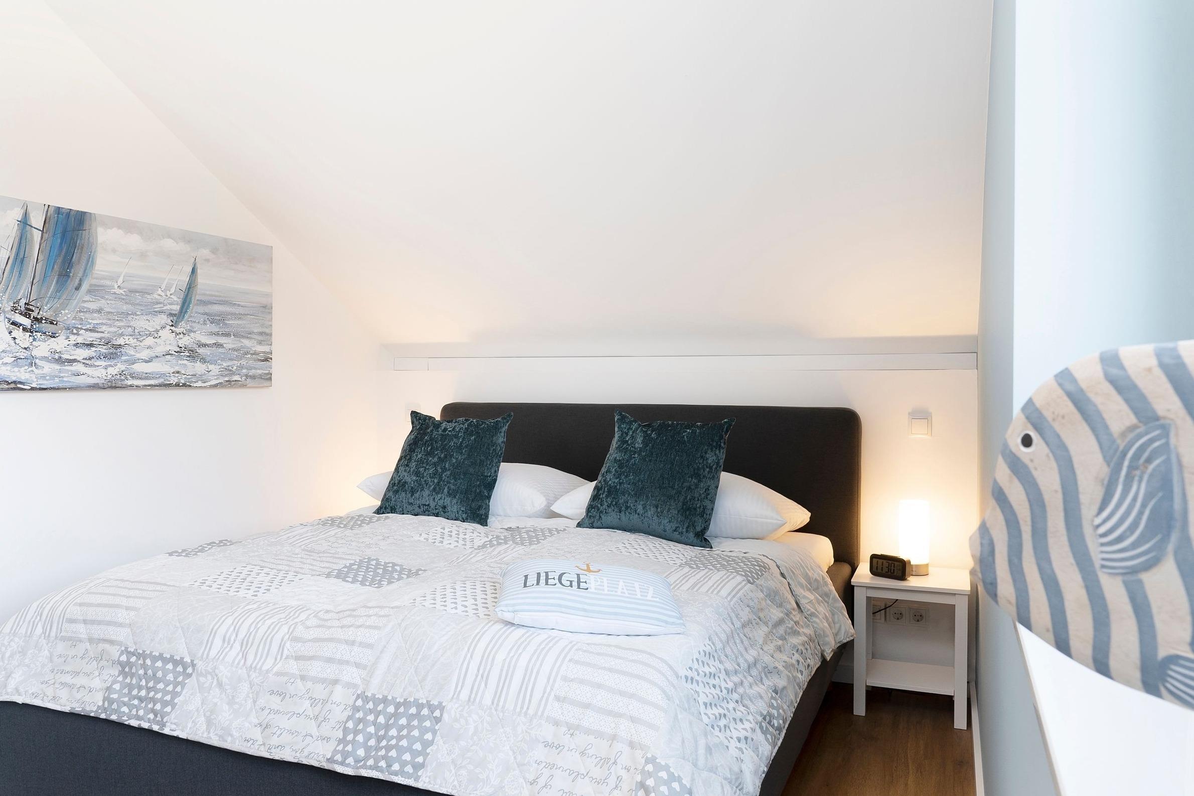 Das Herzstück dieses modern eingerichteten Feriendomizils bildet das zum Essbereich und zur Küche offen gestaltete, großzügige Wohnzimmer. Hier können Sie gemeinsam kochen, essen, lachen und die Seele baumeln lassen. Für gemeinsame Spieleabende finden Sie hier eine liebevoll zusammengestellte Auswahl an Gesellschaftsspielen. Die drei individuell eingerichteten Schlafzimmer mit jeweils eigenem TV bilden die perfekten Rückzugsorte. Im Erdgeschoss finden Sie ein Schlafzimmer mit einem Boxspring-Einzelbett (100x200 cm). Und im Obergeschoss sind die beiden Schlafräume jeweils mit einem Doppelbett (2x 80x200 cm bzw. 2x 90x200 cm) ausgestattet. Dank praktischer Außenjalousien bzw. Plissees sind Sie nachts bestens abgeschirmt und können sich auf einen erholsamen Schlaf freuen. Sie haben viel Programm für den nächsten Urlaubstag geplant? Dank der zwei modernen Duschbäder kommt keine Hektik auf und Sie starten entspannt in den Tag. Neben den ebenerdigen Duschen runden hier gemütliche Fußbodenheizungen das Wohlfühlerlebnis ab. Im Strandkorb auf der Terrasse lassen Sie gemütlich den Tag ausklingen - genießen Sie hier die gesunde Ostseeluft bei einem gut temperierten Glas Wein aus dem Weinkühlschrank.