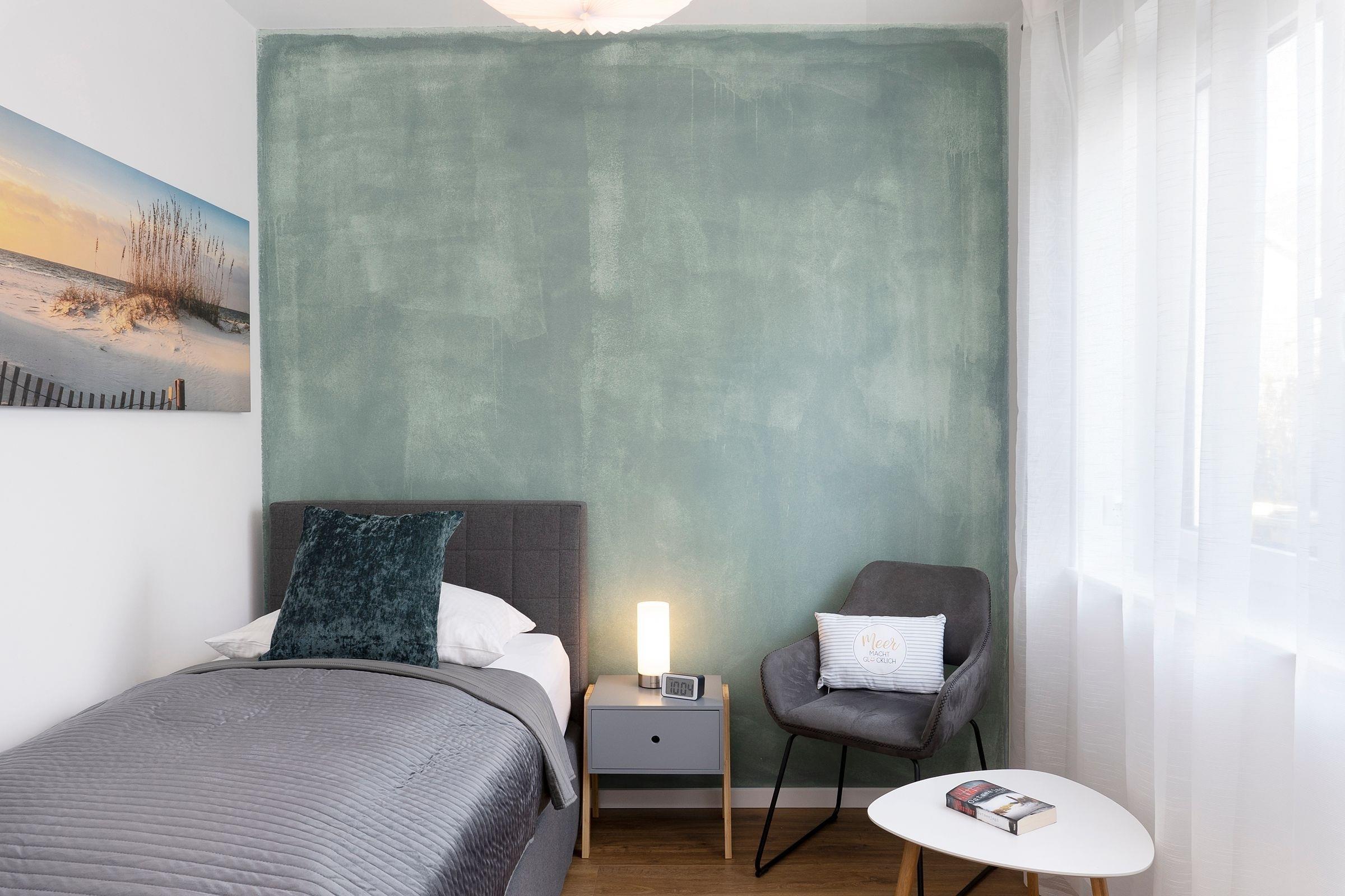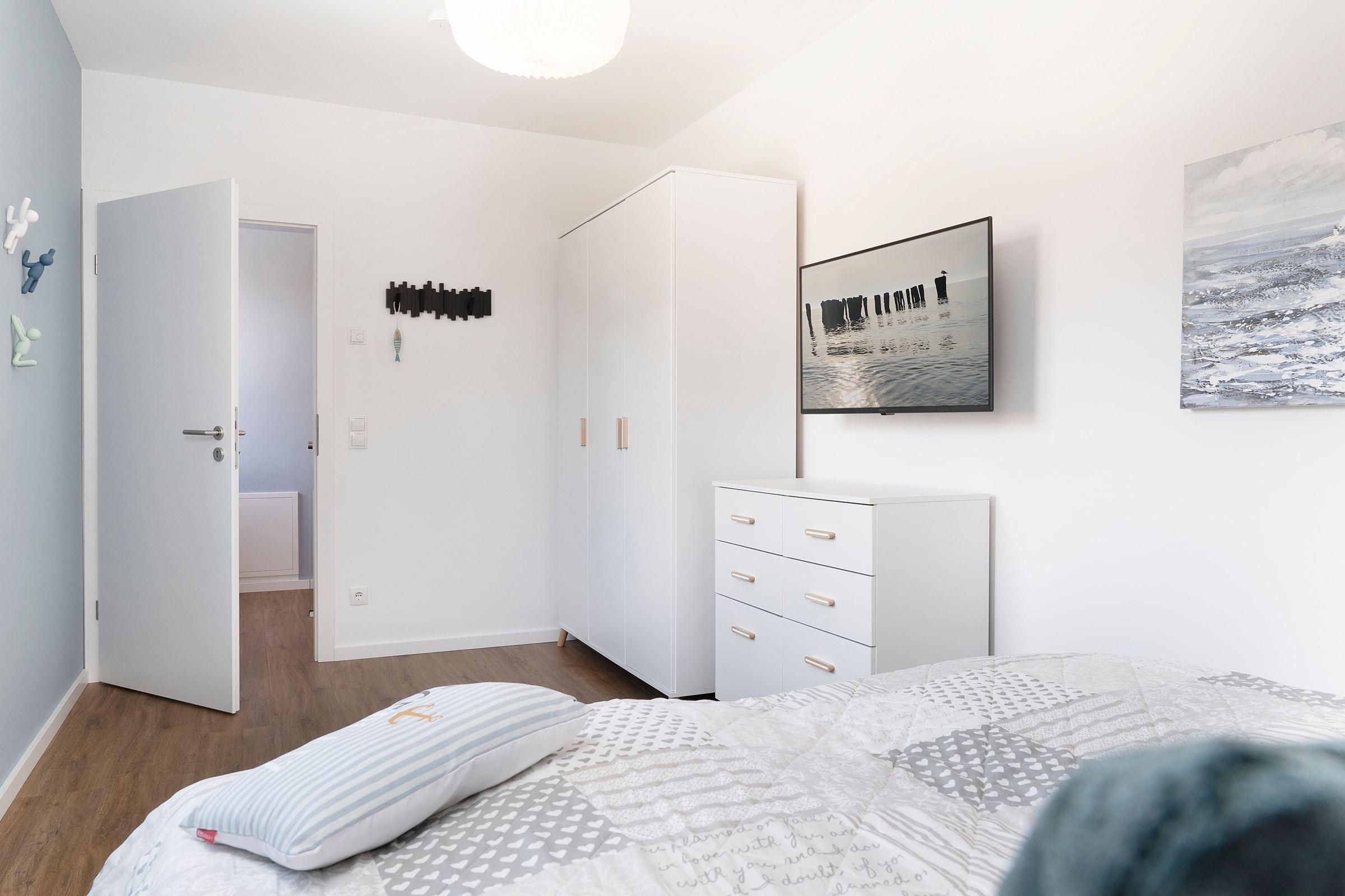 Schlafzimmer 1 (EG): Boxspring-Einzelbett (100x200cm), Kleiderschrank, Verdunkelung: Außenjalousien, TV, Platz für Kinderreisebett