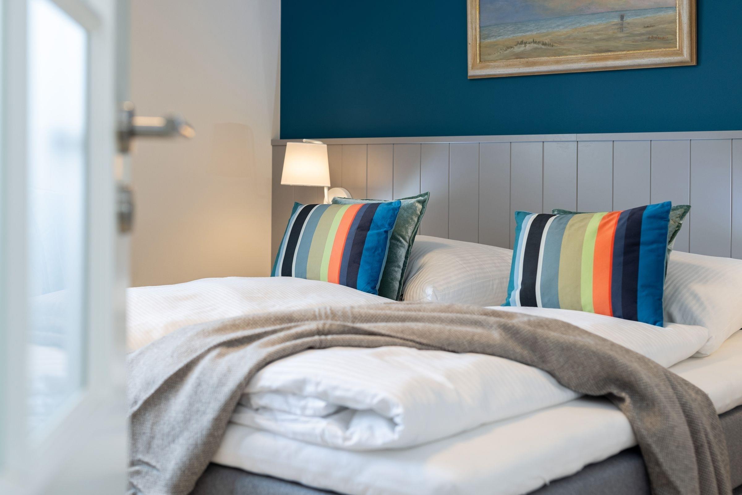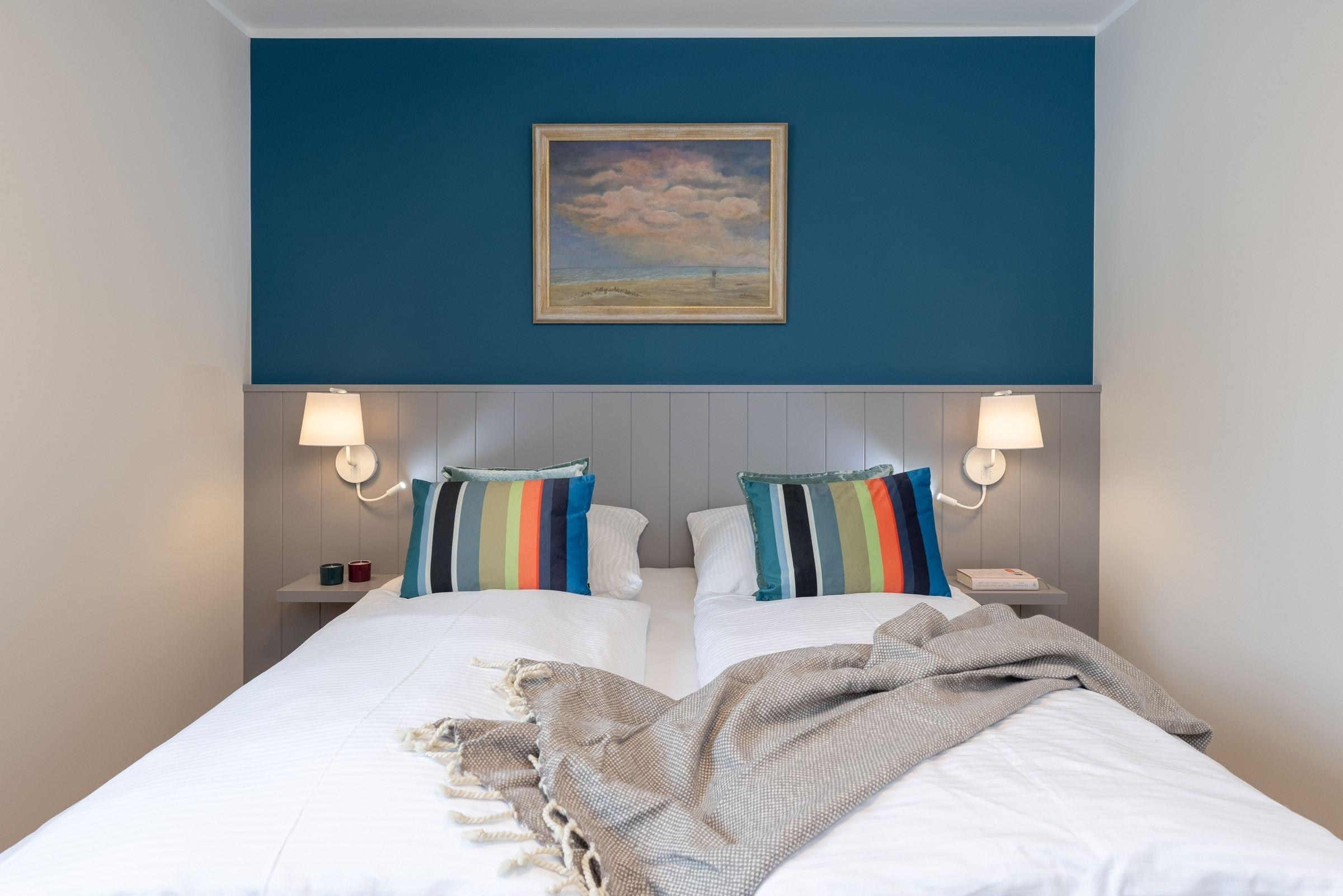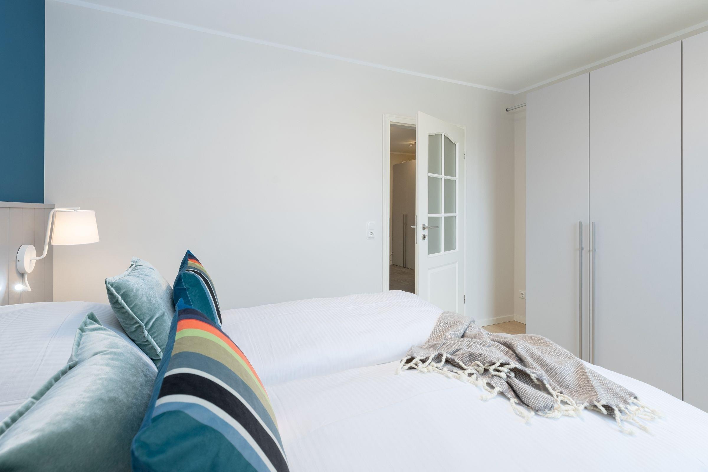 Schlafzimmer: 1 Doppel-Boxspringbett (2x 90x200 cm), Verdunkelung: Plissee + Verdunkelungsvorhänge, Kleiderschrank
