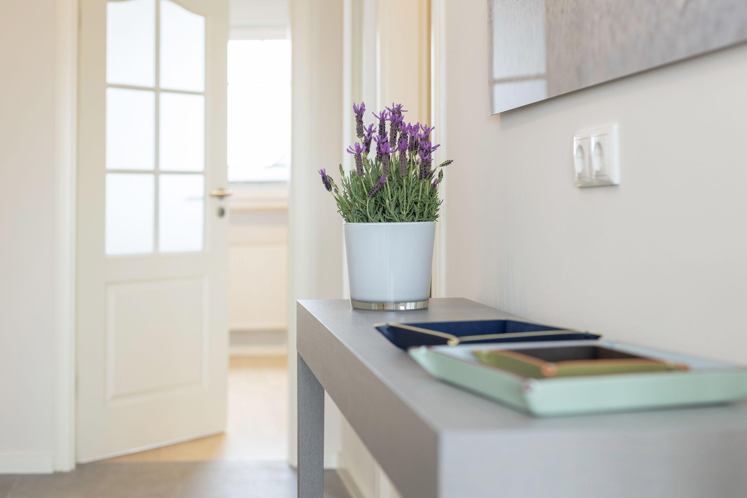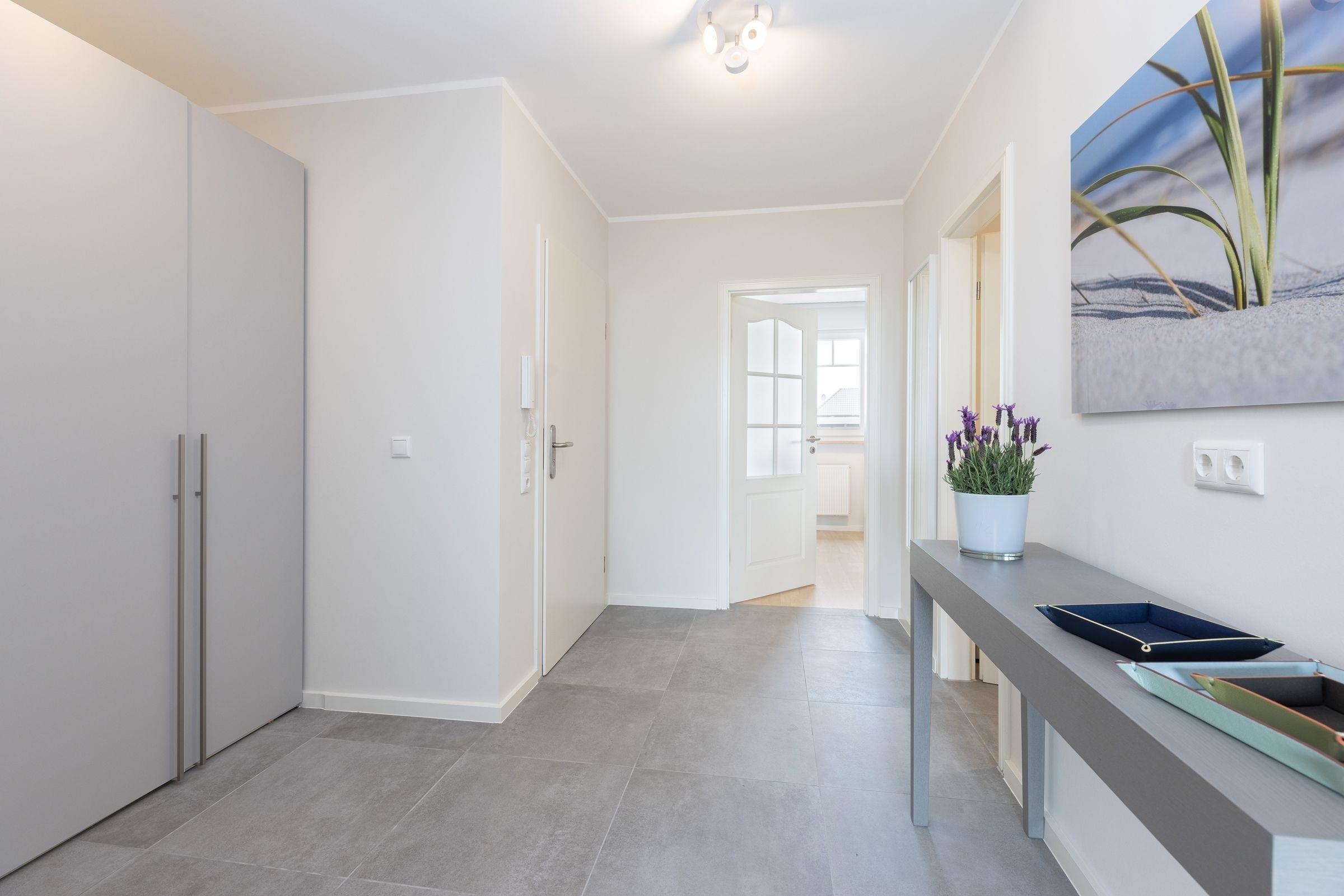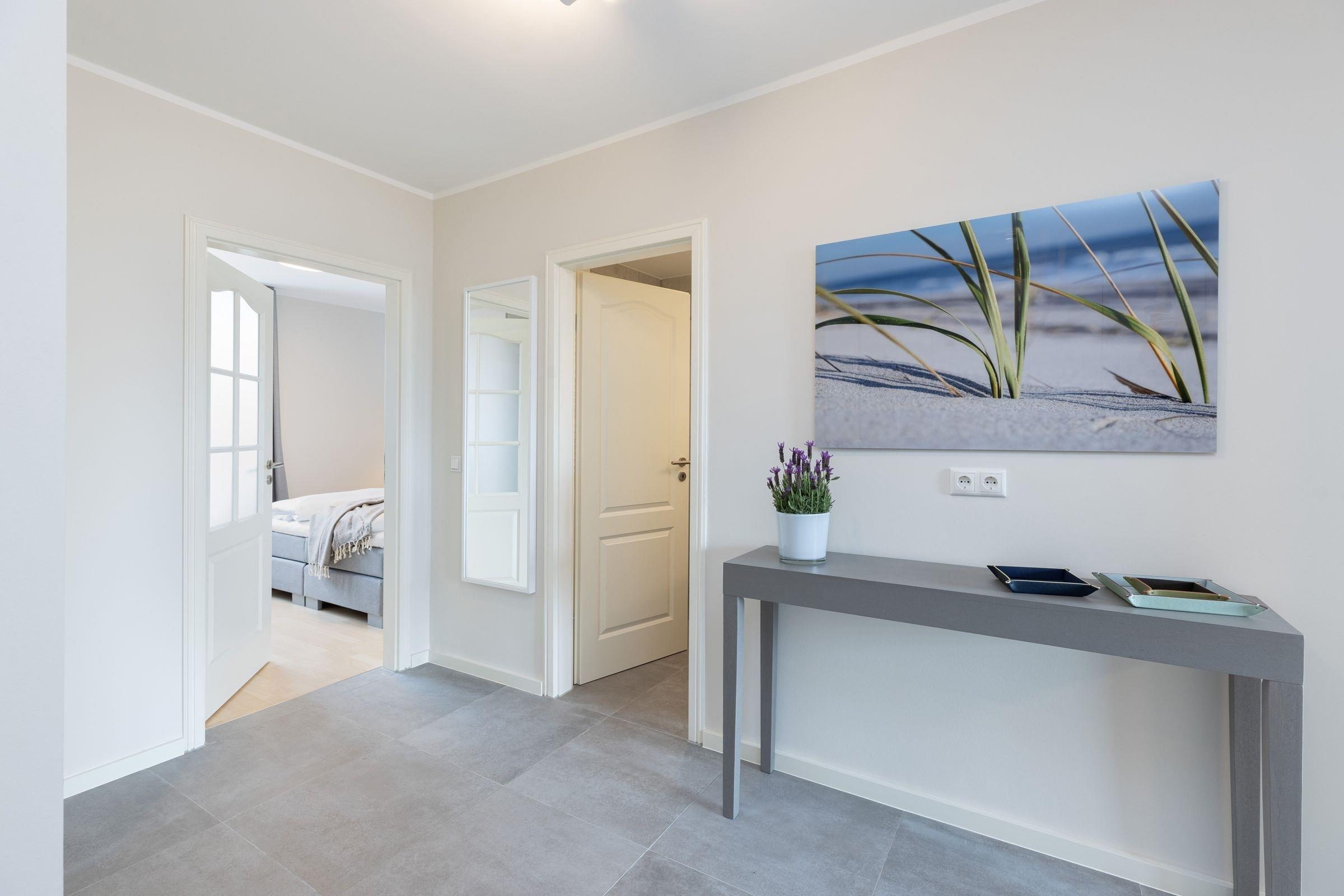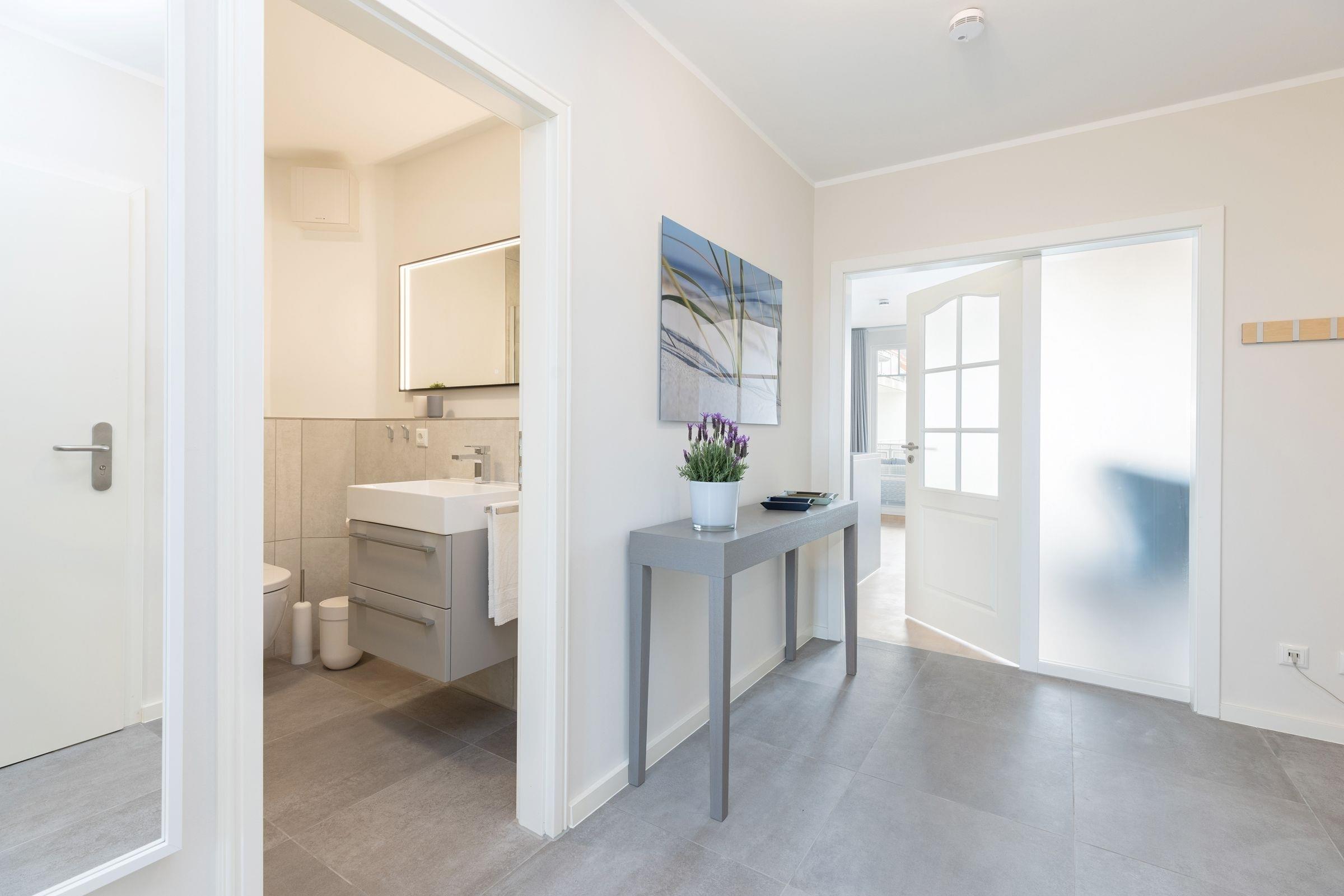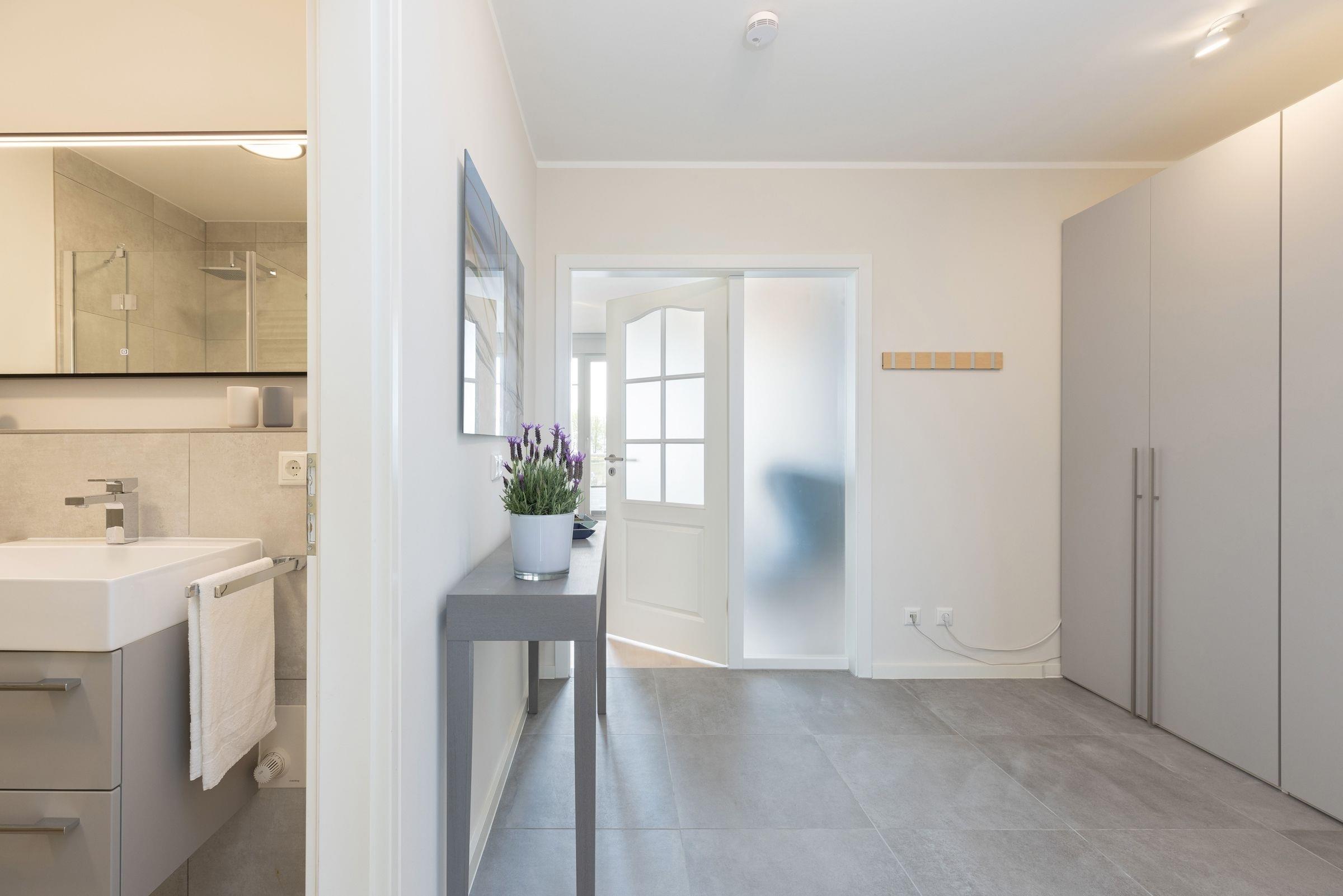 Im ersten Stock des Ferienhauses Ostseeperle empfängt Sie diese stilvolle Ferienwohnung mit einem großzügigen Eingangsbereich. Von dort aus gelangen Sie in den hellen und offen gestalteten Wohnbereich mit einem gemütlichen Schlafsofa (ca. 160x200 cm) und zwei einladenden Sesseln. Die angrenzende moderne Küche ist gut ausgestattet und verwöhnt Sie im Urlaub schon morgens mit einem Espressobereiter und Milchaufschäumer. Vom Wohnbereich aus gelangen Sie auf den Süd-Balkon mit gemütlicher Lounge-Ecke und saisonalem Blick auf die nicht weit entfernte Ostsee. Die Eindrücke des Tages verarbeiten Sie im bequemen Boxspring-Doppelbett (2x 90x200 cm) im geschmackvoll eingerichteten Schlafzimmer. Ein großer Kleiderschrank sowie verschiedene Verdunkelungsmöglichkeiten runden die Einrichtung ab. Das hell geflieste Badezimmer mit bodengleicher Walk-In-Dusche und Handtuchheizung besticht durch eine eigene Waschmaschine. Im Haus stehen noch eine weitere Waschmaschine sowie ein Münz-Trockner für Sie zur Verfügung.