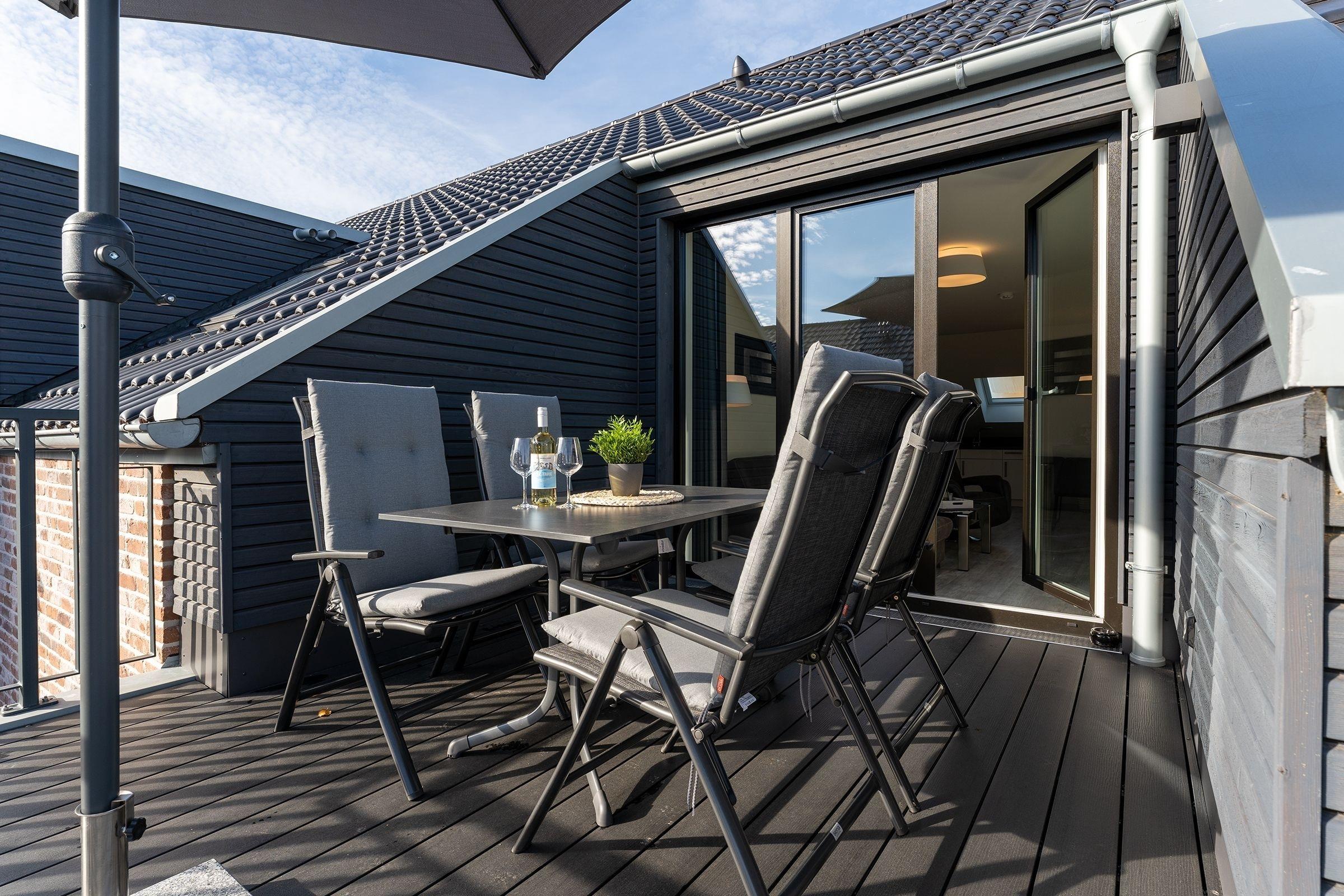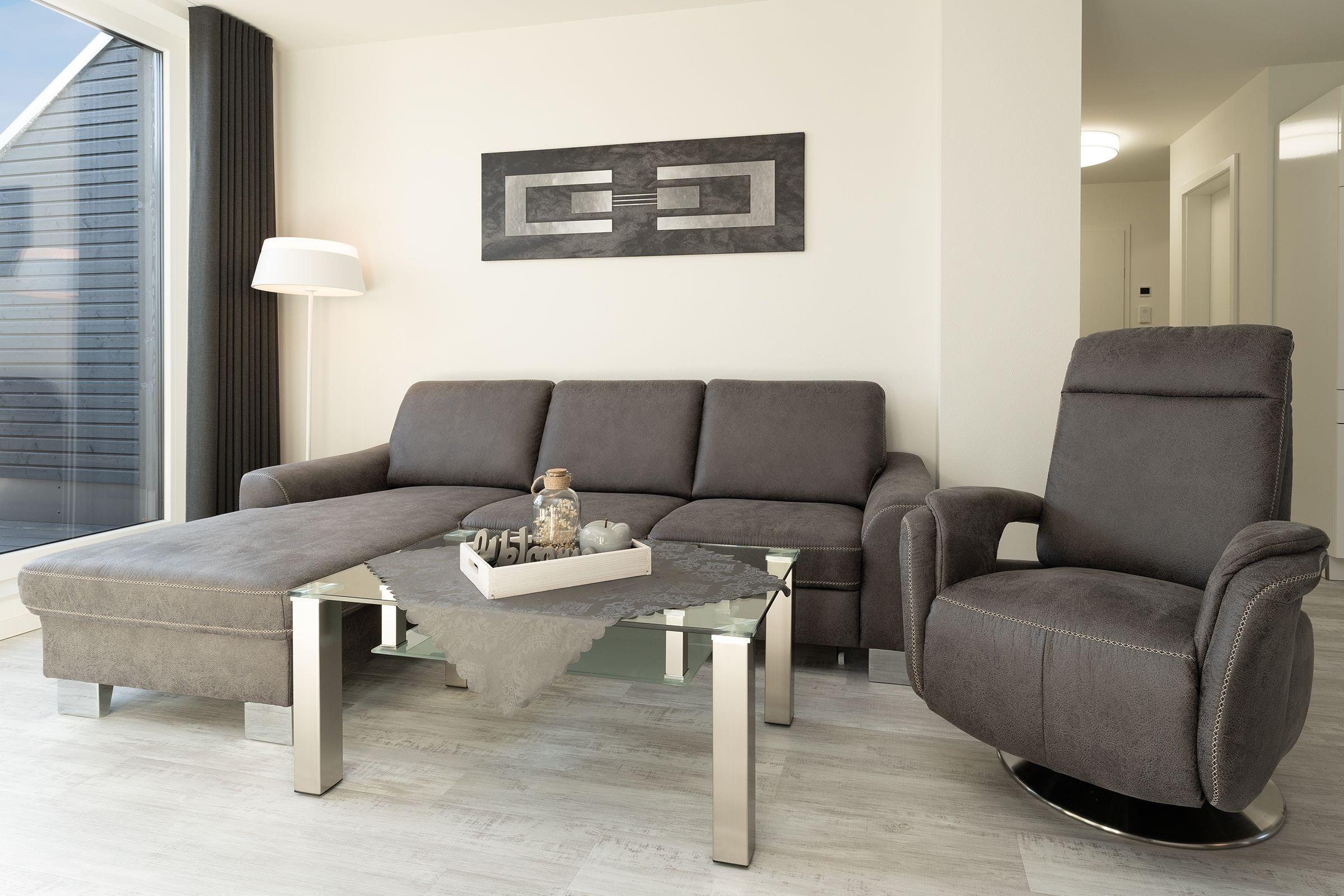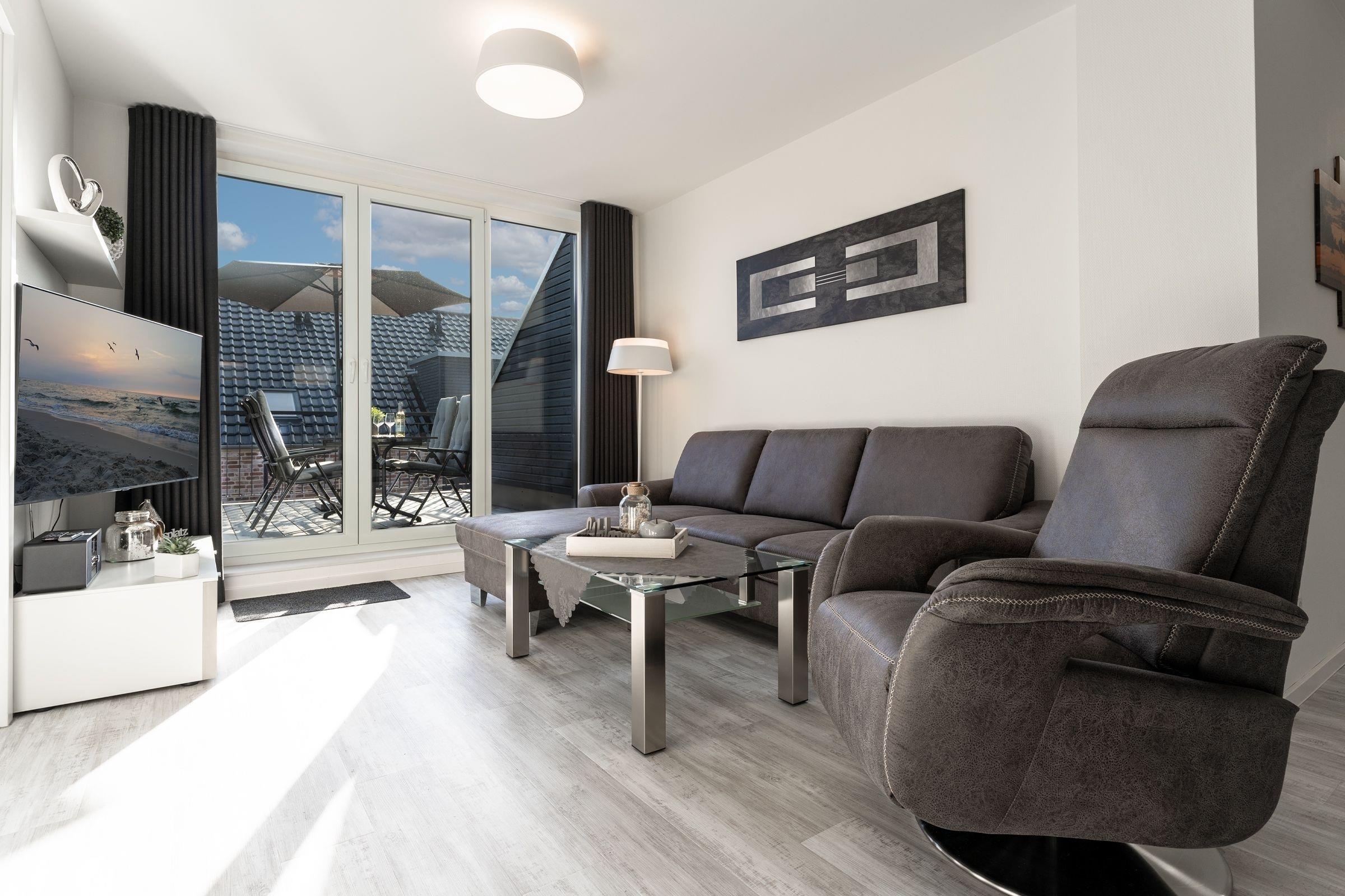 Das Herzstück dieser Wohnung bildet das Wohnzimmer mit Schlafsofa (130x200cm) und offener Küche, welche zum Verweilen und gemeinsamen Kochen einlädt. Von dort gelangen Sie auf den Balkon mit Südausrichtung, der mit Sonnenschirm und Balkonmöbeln ausgestattet ist. Für die Erholung im Urlaub gibt es ein separates Schlafzimmer, das sich mit Jalousien abdunkeln lässt, und mit eigenem TV und Boxspringbett (2x 90x200cm) überzeugt. Das Tageslichtbad verfügt über eine bodengleiche Dusche und Annehmlichkeiten wie einen Haartrockner und eine Handtuchheizung, damit es Ihnen an nichts fehlt, wenn Sie aus der eigenen Sauna kommen. Als weitere Besonderheit verfügt die gesamte Wohnung über eine angenehme Fußbodenheizung. Kostenfreies WLAN und ein Internetradio stehen hier zur Verfügung.