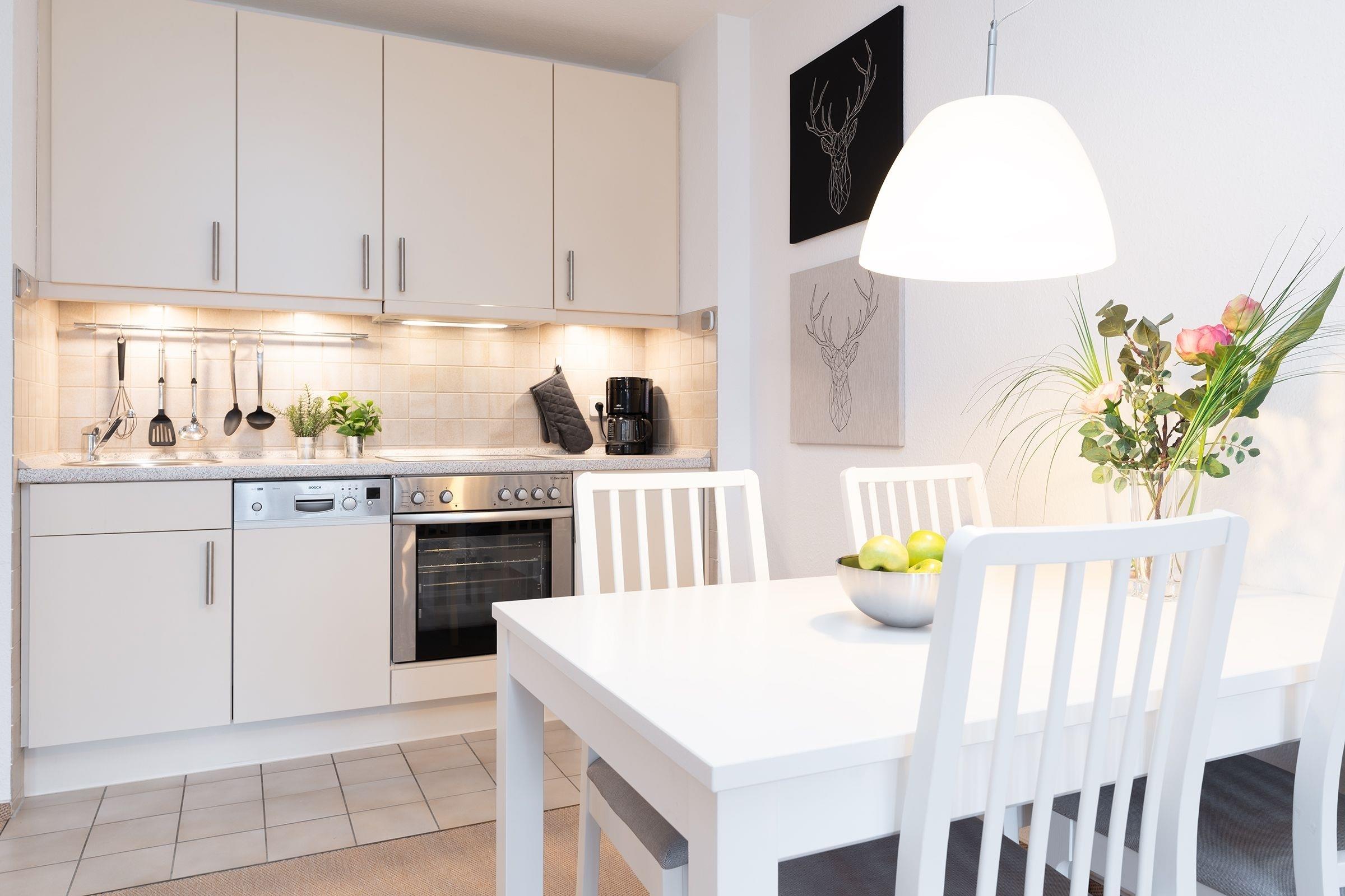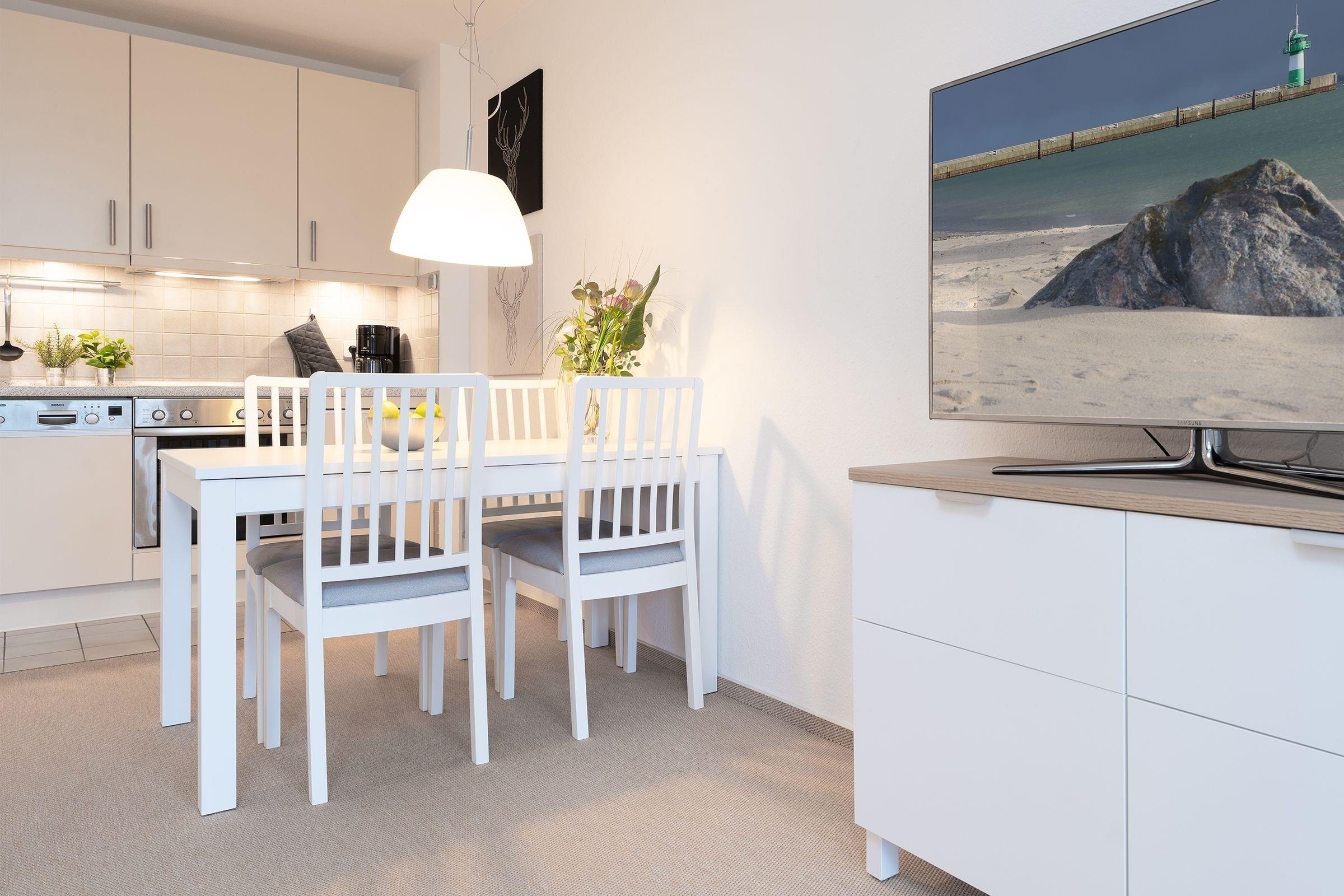 Im gemütlichen Wohnbereich mit offener Küchenzeile können Sie mit der Familie vom Alltag abschalten. Von hier haben Sie auch direkten Zugang auf den überdachten Balkon, der Ihnen wetterunabhängig lauschige Abende ermöglicht. Je nach Saison können einen Blick auf die Ostsee erhaschen.