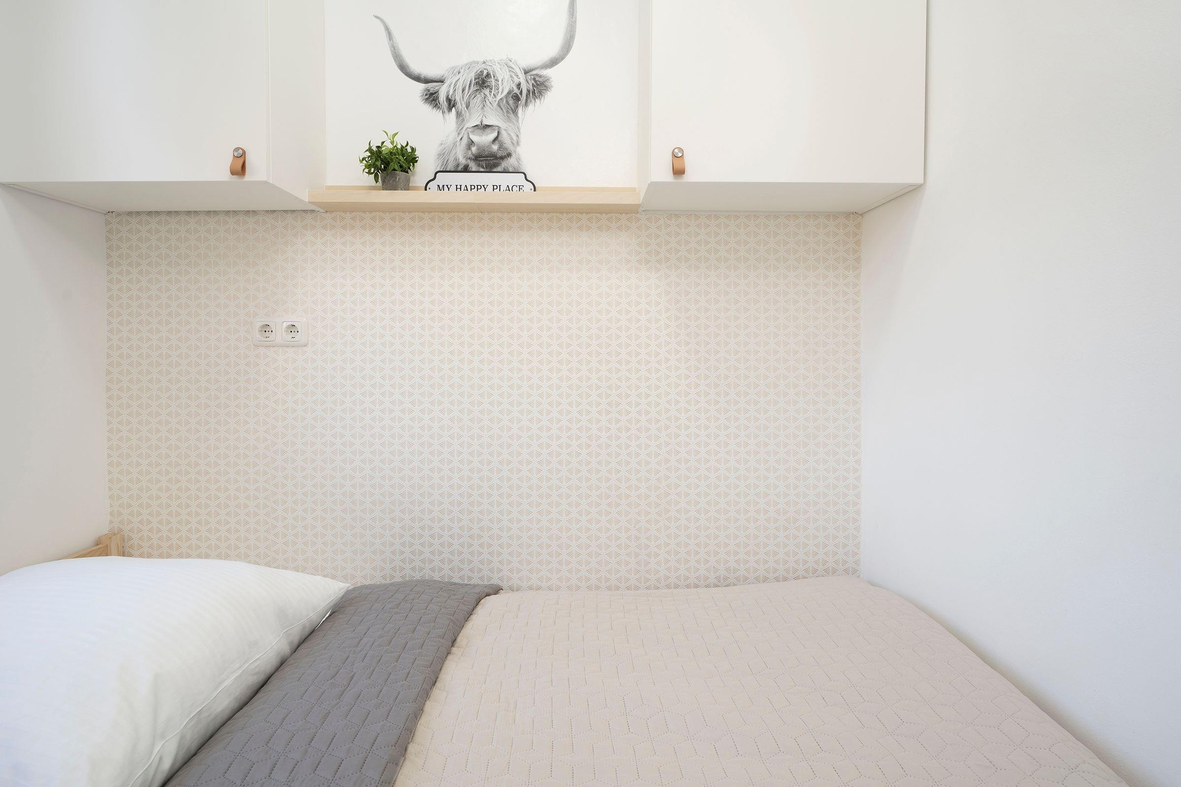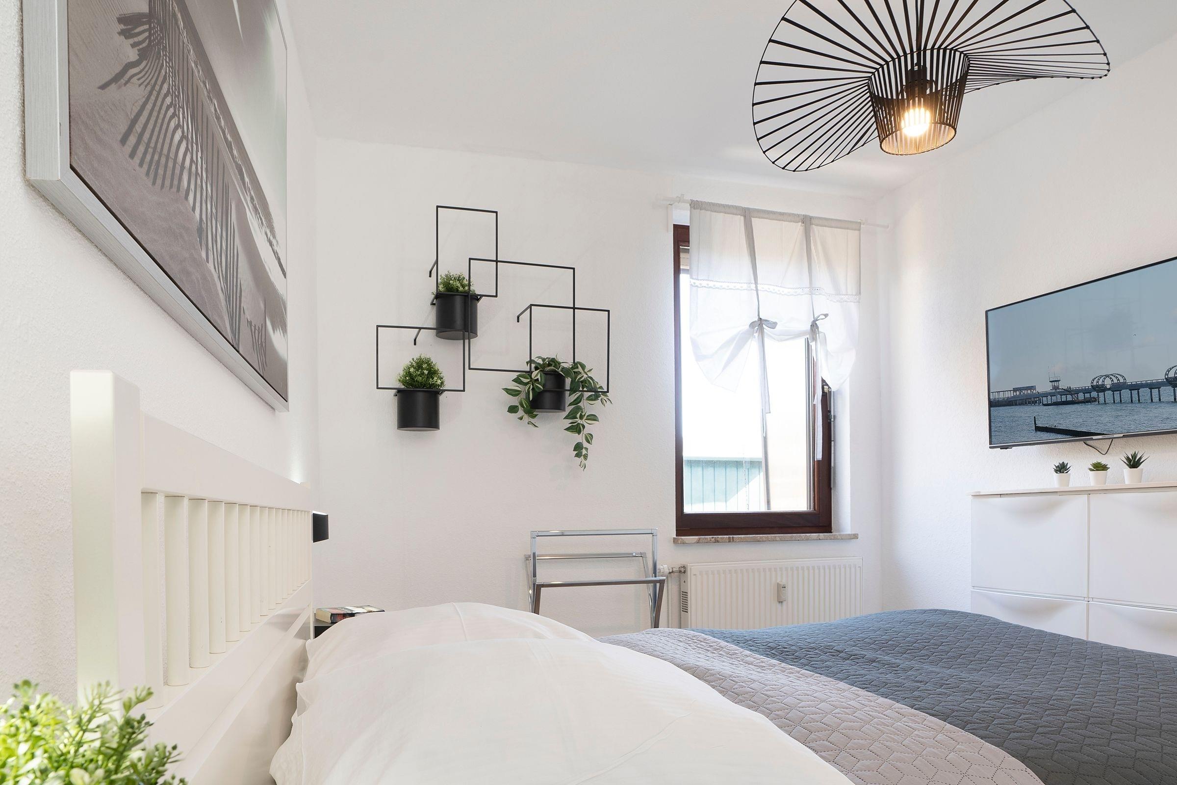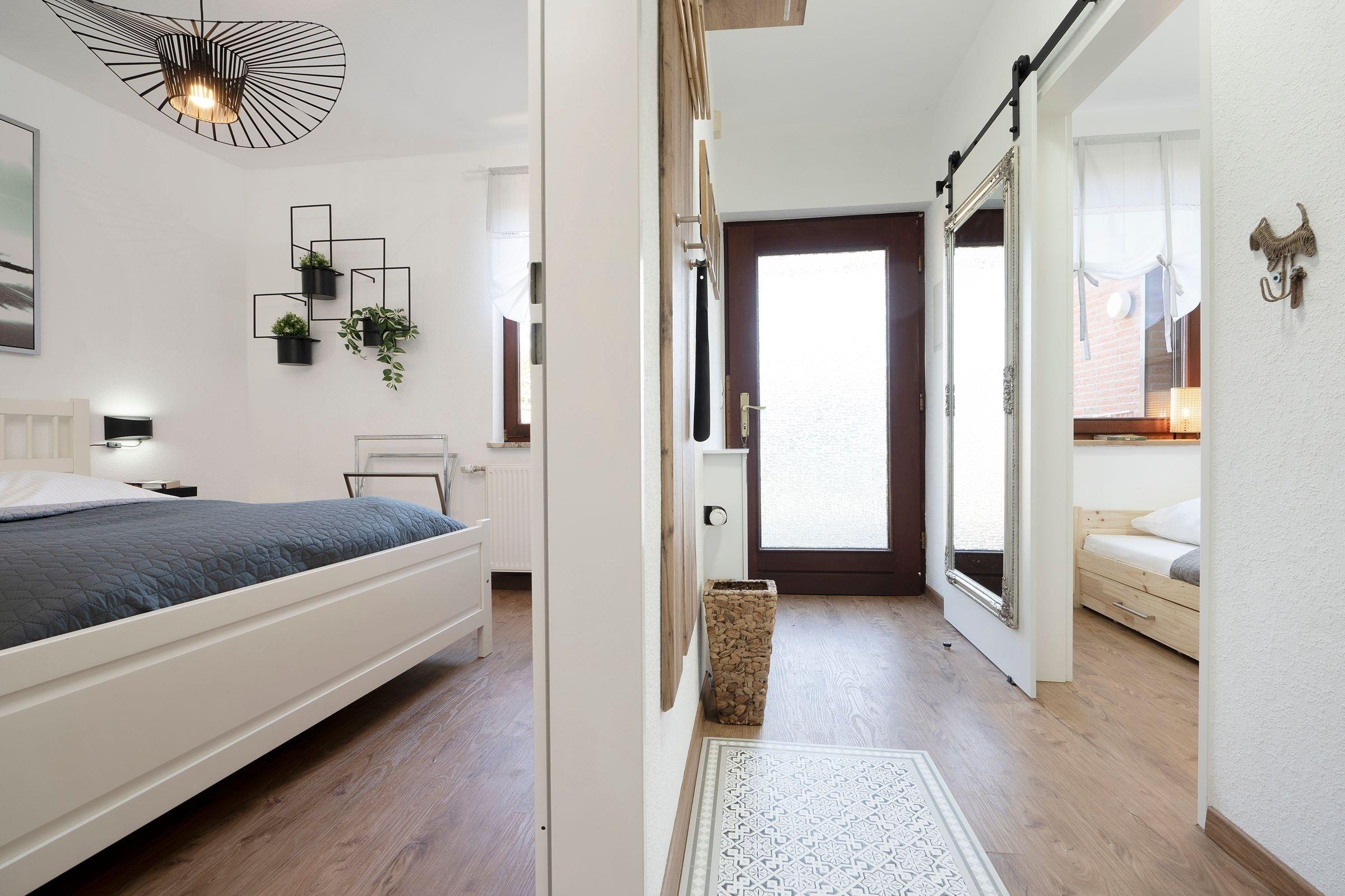 Schlafzimmer 1: Doppelbett (ca. 2x 80x200cm), TV (nur öffentliche Sender + Smart TV), Kleiderschrank, Verdunkelung (Außenrollläden), Platz für Babybett vorhanden